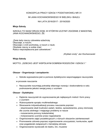 KONCEPCJA PRACY SZKOŁY PODSTAWOWEJ NR 31 IM JANA KOCHANOWSKIEGO W BIELSKU- BIAŁEJ NA LATA 2016/2017 - 2019/2020 Misja Szkoły SZKOŁA TO NASZ DRUGI DOM, W KTÓRYM UCZYMY ZGODNIE Z MAKSYMĄ JANA KOCHANOWSKIEGO, ŻE: „Dwie tedy rzeczy człowieka szlachcią: Obyczaje, a rozum; Obyczaje z cnót pochodzą, a rozum z nauk; Obydwie rzeczy w sobie mieć Rzecz nieprzepłacona jest człowiekowi.” „Wykład cnoty” Jan Kochanowski Wizja Szkoły MOTTO: „DZIECKO JEST WSPÓLNYM DOBREM RODZICÓW I SZKOŁY.” Obszar - Organizacja i zarządzanie: • Szkoła wyposażona jest w pomoce dydaktyczne wspomagające nauczyciela w procesie nauczania • Nauczyciele rozumieją potrzebę własnego rozwoju i doskonalenia w celu podnoszenia jakości swojej pracy z uczniem Obszar - Dydaktyka: • • • • • • Dążenie nauczycieli do wypracowania jak najlepszych metod i form pracy z uczniem Wykorzystanie sprzętu multimedialnego Stosowanie indywidualizacji procesu nauczania poprzez: - stopniowanie skali trudności zadań, testów, sprawdzianów, pracy domowej dla ucznia zdolnego i mającego problemy w nauce - rozszerzenie pomocy koleżeńskiej - motywowanie uczniów przez nagradzanie Organizowanie zajęć pozalekcyjnych z różnych obszarów zainteresowań Promowanie zdrowia poprzez organizowanie uroczystości, konkursów, apeli oraz pogadanek związanych z tematyką zdrowia Organizowanie wycieczek do teatru, kin, muzeów • • • • Organizowanie wyjazdów na basen dla klas drugich Zorganizowanie zajęć z udzielania pierwszej pomocy medycznej dla dzieci Upowszechnienie czytelnictwa, rozwijanie kompetencji czytelniczych wśród dzieci i młodzieży poprzez: - wspieranie rozwoju czytelnictwa skierowanego do dzieci i rodziców - propozycja kanonu lektur dla rodziców dzieci edukacji wczesnoszkolnej - wspólne czytanie podczas zajęć - zakup nowości do bibliotek Rozwijanie kompetencji informatycznych uczniów: - doskonalenie umiejętności pracy z komputerem przez uczniów, nauczycieli, pracowników szkoły, rodziców - doskonalenie przepływu informacji, praca z dziennikiem elektronicznym - wyposażenie sal lekcyjnych w oprogramowania edukacyjne - wykorzystanie komputerów i programów komputerowych w formach i metodach w czasie zajęć lekcyjnych i pozalekcyjnych - wykorzystanie urządzeń multimedialnych na zajęciach lekcyjnych i pozalekcyjnych Obszar— Promocja: • • • • • • • • Organizowanie dni otwartych szkoły Aktualizację strony internetowej szkoły Powołanie osoby z Rady Pedagogicznej odpowiedzialnej za kontakty z masmediami Prezentowanie dorobku szkoły na stronie MZO Artykuły w publikacjach Akcji Katolickiej Udział dzieci w konkursach pozaszkolnych Odpowiednie wykorzystanie logo szkoły (listy gratulacyjne, teczki) Udział w imprezach środowiskowych organizowanych przez instytucje lokalne Obszar - Wychowanie: • • • • • • Nauczyciele w swojej pracy stosują jednakowe, konsekwentne sposoby postępowania wobec uczniów Uczniowie znają normy i zasady odpowiedniego zachowania i stosują je w szkole Realizacja zadań zawartych w szkolnym programie wychowawczym i w szkolnym programie profilaktyki Ewaluacja zadań zawartych w programach szkolnych, coroczne modyfikowanie zadań i ich realizacji. Realizacja zadań zawartych w programie wychowawcy klasy, w planie pracy pedagoga szkolnego. Realizacja zadań zawartych w szkolnym systemie pomocy psychologicznopedagogicznej • • • • • Działalność biblioteki szkolnej Działalność świetlic szkolnych - uczniowie poza zajęciami mają zapewnioną opiekę Kształtowanie poczucia przynależności narodowej Budowanie systemu wartości Rozwijanie umiejętności społecznych Obszar - Współpraca z rodzicami, środowiskiem lokalnym, instytucjami i organizacjami • • • • Relacje oparte na wzajemnym szacunku Rodzice są partnerami szkoły w działaniach pedagogicznych i wychowawczych Szkoła otwarta na potrzeby środowiska - udział w konkursach i imprezach organizowanych przez środowiska lokalne Współpraca ze szkołą polską w Bukowcu
