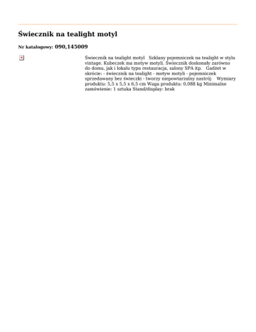 Świecznik na tealight motyl Nr katalogowy: 090,145009 Świecznik na tealight motyl Szklany pojemniczek na tealight w stylu vintage. Kubeczek ma motyw motyli. Świecznik doskonały zarówno do domu, jak i lokalu typu restauracja, salony SPA itp. Gadżet w skrócie: - świecznik na tealight - motyw motyli - pojemniczek sprzedawany bez świeczki - tworzy niepowtarzalny nastrój Wymiary produktu: 5,5 x 5,5 x 6,5 cm Waga produktu: 0,088 kg Minimalne zamówienie: 1 sztuka Stand/display: brak