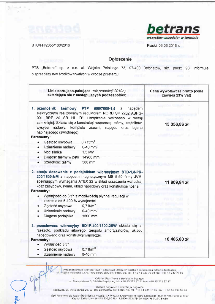 PTS ,Betrans" sp. z o.o. zastrzega prawo do przeprowadzenia licytacji ustnej po zloaeniu ofeft przez