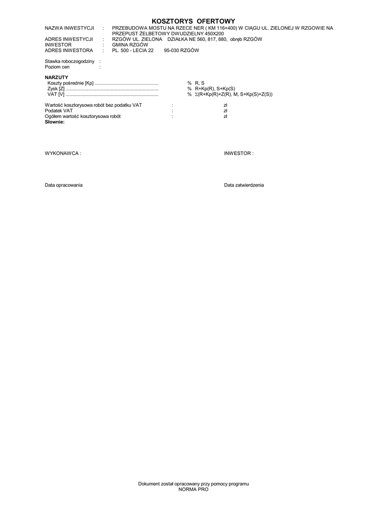 KOSZTORYS OFERTOWY NAZWA INWESTYCJI : ADRES INWESTYCJI INWESTOR ADRES INWESTORA : : : Stawka roboczogodziny Poziom cen PRZEBUDOWA MOSTU NA RZECE NER ( KM 116+400) W CIĄGU UL. ZIELONEJ W RZGOWIE NA PRZEPUST ŻELBETOWY DWUDZIELNY 450X200 RZGÓW UL. ZIELONA DZIAŁKA NE 560, 817, 880, obręb RZGÓW GMINA RZGÓW PL. 500 - LECIA 22 95-030 RZGÓW : : NARZUTY Koszty pośrednie [Kp] ................................................ Zysk [Z] ...................................................................... VAT [V] ...................................................................... Wartość kosztorysowa robót bez podatku VAT Podatek VAT Ogółem wartość kosztorysowa robót Słownie: % R, S % R+Kp(R), S+Kp(S) % (R+Kp(R)+Z(R), M, S+Kp(S)+Z(S)) : : : zł zł zł WYKONAWCA : INWESTOR : Data opracowania Data zatwierdzenia Dokument został opracowany przy pomocy programu NORMA PRO Zielona.KST PRZEDMIAR Lp. Opis i wyliczenia 1 ROBOTY PRZYGOTOWAWCZE 1 Roboty pomiarowe przy robotach ziemnych - trasa dróg w terenie pagórkowatym lub d.1 górskim. 0.05 2 Demontaż poręczy mostowych d.1 1 j.m. Razem km km 0.050 RAZEM 0.050 1.000 RAZEM 1.000 300.000 RAZEM 300.000 250.000 RAZEM 250.000 18.180 RAZEM 18.180 18.180 RAZEM 18.180 225.000 RAZEM 225.000 5.512 RAZEM 5.512 26.250 RAZEM 26.250 90.000 RAZEM 90.000 450.000 RAZEM 450.000 12.000 RAZEM 12.000 18.080 RAZEM 18.080 1.362 RAZEM 1.362 0.200 RAZEM 0.200 0.681 RAZEM 0.681 36.534 RAZEM 36.534 t t 3 Roboty remontowe - frezowanie nawierzchni bitumicznej o gr. do 4 cm z wywozem materiału m2 d.1 z rozbiórki na odl. do 1 km 60*5 m2 m2 4 Rozebranie nawierzchni z tłucznia gr. 15 cm mechanicznie d.1 50*5 m2 5 Wywiezienie gruzu z terenu rozbiórki przy mechanicznym załadowaniu i wyładowaniu samo- m3 d.1 chodem samowyładowczym na odległość 1 km 3.0+132*0.15*0.3+132*0.07 m3 6 Wywiezienie gruzu z terenu rozbiórki przy mechanicznym załadowaniu i wyładowaniu samo- m3 d.1 chodem samowyładowczym - dodatek za każdy następny rozpoczęty 1 km dodatkowe 7 km Krotność = 7 3.0+132*0.15*0.3+132*0.07 m3 7 Wykopy oraz przekopy wyk.na odkład koparkami przedsiębiernymi o poj.łyżki 0.60 m3 w d.1 gr.kat. I-II odsłonięcie przyczółków istniejących [5.0+2.5]*0.5*3*10*2 m3 8 Rozebranie płyty mostu cm d.1 5.2*5.3*0.2 m3 9 Rozebranie ław, stóp i fundamentów pod maszyny betonowych o grubości (wysokości) do d.1 70 cm 7.5*0.7*2.5*2 m3 m3 m3 2 ROBOTY ZIEMNE 10 Roboty ziemne z przewozem gruntu taczkami na odległość do 10 m (kat. gruntu I-II) 15*2, d.2 7*2 15*6*1 m3 m3 m3 11 Ręczne formowanie nasypów z gruntu kat. I-II dostarcz.samochodami samowyład. z dosta- m3 d.2 wą piasku i zagęszczeniem Is=1,0 [5.0+2.5]*3*10*2 m3 3 KONSTRUKCJA PRZEPUSTU 12 Przepusty rurowe pod zjazdami - ławy fundamentowe żwirowe d.3 5.0*8.0*0.3 m3 m3 13 Deskowanie systemowe wielkowymiarowe stóp i płyt fundamentowych betonowych lub żeld.3 betowych 2.26*8.0 m2 14 Zbrojenie konstrukcji monolitycznych prętami stalowymi okrągłymi żebrowanymi o śr. 16 d.3 mm. Płyta denna 1.362 t m2 t 15 Zbrojenie konstrukcji monolitycznych prętami stalowymi okrągłymi żebrowanymi o śr. 14-20 t d.3 mm. Ławy pod ścianki czołowe 0.2 t 16 Zbrojenie konstrukcji monolitycznych prętami stalowymi okrągłymi żebrowanymi o śr. 14-20 t d.3 mm. Płyta żelbetowa (nadbeton) 0.681 t 17 Betonowanie ław i stóp fundamentowych zbrojonych w deskowaniu systemowym drobnowy- m3 d.3 miarowym z transportem betonu pompą 2.26*8+[2.94*8.23-5.26*2.38]*0.3+0.5*1.22*8.26+1.20*8.26 m3 18 Części przelotowe prefabrykowanych przepustów drogowych skrzynkowych o przekroju d.3 dwudzielnym o wymiarach 4.5 x 2.0 m 8 -2- Norma PRO Wersja 4.18 Licencja: 12522 dla ZROID Edward Grzegorzewski Poszcz m m 8.000 Zielona.KST Lp. PRZEDMIAR Opis i wyliczenia j.m. 19 Obudowy wlotów (wylotów) prefabrykowanych przepustów drogowych skrzynkowych d.3 0.3*[2.94*8.26-5.26*2.38]*2 m3 20 Izolacje typu 'Grace' i inne z folii samoprzylepnych poziome d.3 8.26*8 m2 m3 m2 4 ODTWORZENIE KONSTRUKCJI JEZDNI 21 Koryta wykonywane ręcznie gł. 30 cm w gruncie kat. I-II na całej szerokości jezdni i chodni- m2 d.4 ków [50-8.26]*5.5 m2 22 Warstwa dolna podbudowy z kruszyw łamanych gr. 20 cm d.4 [50-8.26]*5.5 m2 23 Podbudowy z mieszanek mineralno-bitumicznych asfaltowych gr.7 cm d.4 Krotność = 0.875 [51-8.26]*5.3 m2 24 Nawierzchnie z mieszanek mineralno-bitumicznych asfaltowych o grubości 6 cm (warstwa d.4 wiążąca) 52*5.12 m2 25 Nawierzchnie z mieszanek mineralno-bitumicznych asfaltowych o grubości 4 cm (warstwa d.4 ścieralna) 60*5.0 m2 26 Skropienie asfaltem nawierzchni drogowych d.4 60*5+52*5.12+51*5.3 m2 m2 m2 m2 m2 m2 5 KRAWĘŻNIKI I OBRZEŻA 27 Obrzeża betonowe o wymiarach 30x8 cm na podsypce piaskowej, spoiny wypełnione piasd.5 kiem 16 6 CHODNIKI I ŚCIEŻKI 28 Podbudowy z gruntu stabilizowanego cementem w ilości 20 kg/m2, warstwa gr.10 cm d.6 216*1.5 29 Chodniki z asfaltu lanego modyfikowanego - mieszanka żwirowa grubości 3 cm d.6 25.5 7 URZĄDZENIA BEZPIECZEŃSTWA 30 Bariery ochronne stalowe jednostronne o masie 1 m 24 kg SP-06/1 d.7 16 m m2 m2 66.080 RAZEM 66.080 229.570 RAZEM 229.570 229.570 RAZEM 229.570 226.522 RAZEM 226.522 266.240 RAZEM 266.240 300.000 RAZEM 300.000 836.540 RAZEM 836.540 16.000 RAZEM 16.000 324.000 RAZEM 324.000 25.500 RAZEM 25.500 16.000 RAZEM 16.000 16.000 RAZEM 16.000 4.000 RAZEM 4.000 6.000 RAZEM 6.000 22.000 RAZEM 22.000 52.000 RAZEM 52.000 m m m m m m m 34 Bruk dwuwarstwowy na mchu w płotkach na skarpach w kratę 1 x 1 m wys.50 cm d.8 22 m2 35 Wykonanie gabionów przy umocnieniu skarp d.8 2*[2.0*1.0*0.5+4.0*1.0*4.0+3*3.0*1.0*1.0] m3 Norma PRO Wersja 4.18 Licencja: 12522 dla ZROID Edward Grzegorzewski 7.059 m2 32 Bariery ochronne stalowe jednostronne o masie 1 m 24 kg - zakończenia barier d.7 4 m2 m3 -3- 7.059 RAZEM m2 m 9 KOLIZJE Razem 8.000 m 31 Bariery ochronne stalowe jednostronne o masie 1 m 24 kg SP-06/4 d.7 16 8 UMOCNIENIE DNA I SKARP RZEKI 33 Wykonanie palisady z kołków lub słupk