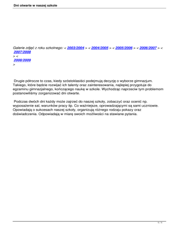 Dni otwarte w naszej szkole Galerie zdjęć z roku szkolnego: < 2003/2004 > < 2004/2005 > < 2005/2006 > < 2006/2007 > < 2007/2008 >< 2008/2009 > Drugie półrocze to czas, kiedy szóstoklasiści podejmują decyzję o wyborze gimnazjum. Takiego, które będzie rozwijać ich talenty oraz zainteresowania, najlepiej przygotuje do egzaminu gimnazjalnego, kończącego naukę w szkole. Wychodząc naprzeciw tym problemom postanowiliśmy zorganizować dni otwarte. Podczas dwóch dni każdy może zajrzeć do naszej szkoły, zobaczyć oraz ocenić np. wyposażenie sal, warunków pracy itp. Co ważniejsze, oprowadzającymi są sami uczniowie. Opowiadają o sukcesach naszej szkoły, organizują różnego rodzaju pokazy oraz doświadczenia. Odpowiadają w miarę swoich możliwości na stawiane pytania. 1/1
