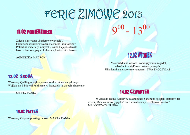 00 00 9 - 13 Zajęcia plastyczne „Papierowe wariacje”. Fantazyjne rysunki wykonane techniką „iris folding”. Potrzebne materiały: nożyczki, taśma klejąca, ołówek, blok techniczny, papier kolorowy, karteczki kolorowe. AGNIESZKA MĄDROŃ Matematyka na wesoło. Rozwiązywanie zagadek, rebusów i łamigłówek matematycznych. Układanki matematyczne- tangram. EWA SKOCZYLAS Warsztaty Quillingu- wykonywanie serduszek walentynkowych. Wyjście do Biblioteki Publicznej w Przędzelu na zajęcia plastyczne. MARTA KANIA Wyjazd do Domu Kultury w Rudniku nad Sanem na spektakl teatralny dla dzieci „Małe co nieco tygryska” oraz seans kinowy „Królewna Śnieżka”. MAŁGORZATA FLUDA Warsztaty Origami płaskiego z koła. MARTA KANIA 00 9 – 13 00 Gry i zabawy na świeżym powietrzu. Konkurs na rzeźbę ze śniegu oraz ognisko połączone z pieczeniem kiełbasy (we własnym zakresie). WIESŁAW SKOCZYLAS Tenis stołowy rozgrywki o mistrzostwo szkoły. Gra deblowa i singlowa. WIESŁAW SKOCZYLAS Zajęcia plastyczne- igłą i nitką malowane. O godz. 10:30 wyjście do Publicznej Biblioteki w Przędzelu, na zajęcia praktyczno-techniczne „Tego można się nauczyć: ABC robótek ręcznych”. AGNIESZKA MĄDROŃ Quiz literacko- językowy „Jeden z dziesięciu”. Gry i zabawy logiczne. DOROTA MUCHA Czytamy nasze ulubione bajki, bajeczki i baśniewykonywanie ilustracji techniką dowolną. BARBARA SKOCZYLAS