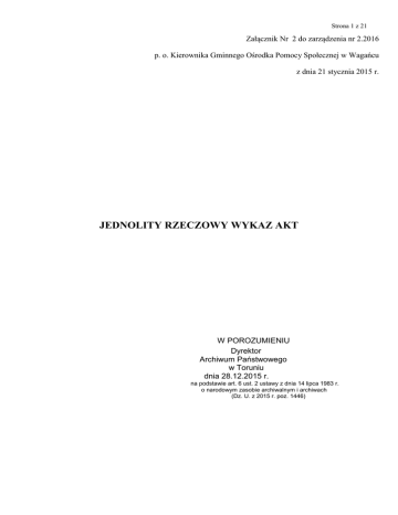 Strona 1 z 21 Załącznik Nr 2 do zarządzenia nr 2.2016 p. o. Kierownika Gminnego Ośrodka Pomocy Społecznej w Wagańcu z dnia 21 stycznia 2015 r. JEDNOLITY RZECZOWY WYKAZ AKT W POROZUMIENIU Dyrektor Archiwum Państwowego w Toruniu dnia 28.12.2015 r. na podstawie art. 6 ust. 2 ustawy z dnia 14 lipca 1983 r. o narodowym zasobie archiwalnym i archiwach (Dz. U. z 2015 r. poz. 1446) Strona 2 z 21 Waganiec 2015 Zasady stosowania jednolitego rzeczowego wykazu akt 1/ Jednolity rzeczowy wykaz akt jest wspólny dla wszystkich komórek organizacyjnych (występują grupy zagadnień wspólne dla różnych komórek organizacyjnych). Zatem sprawy występujące w kilku komórkach organizacyjnych będą posiadały te same symbole klasyfikacyjne (numery) z wykazu akt np. raporty, sprawozdania statystyczne i inne. Wyróżnikiem pozwalającym określić, z jakiej komórki organizacyjnej pochodzi dany raport czy sprawozdanie, bądź „ich cała teczka” są symbole literowe oznaczające daną komórkę organizacyjną, umieszczane zarówno na poszczególnych pismach jako element składowy znaku pisma, jak i na całych teczkach jako element znaku akt. 2/ Znak akt jest to stały symbol akt pewnej grupy spraw. Hasła określające poszczególne pozycje wykazu akt są wyraźnie rozgraniczone, a jednocześnie sformułowane ogólnie, np. hasło klasyfikacyjne „ dowody księgowe księgowości materiałowej” obejmuje wszystkie rodzaje dowodów księgowych obrotu materiałowego bez zbędnego uszczegółowiania. 3/ Nie wolno zakładać teczek o ogólnikowych tytułach, takich jak np. „sprawy różne”, „korespondencja” itd. W przypadku pojawienia się spraw i akt o tematyce nieuwzględnionej w wykazie akt należy dokonać jego uzupełnienia w sposób określony w instrukcji kancelaryjnej. 4/ W przypadku konieczności łączenia w jednej teczce akt o różnych okresach przechowywania, całości nadaje się kategorię, jaką posiadają akta o najdłuższym okresie przechowywania. 5/ Za prawidłową, zgodną z wykazem akt klasyfikację i kwalifikację akt w poszczególnych komórkach organizacyjnych odpowiada kierownik Ośrodka. Może on powierzać ten obowiązek innym pracownikom, jeżeli uzna, że mają oni odpowiednią praktykę i kwalifikacje w tym zakresie. Strona 3 z 21 Wykaz klas I i II stopnia podziału 0 0 1 2 3 4 5 6 7 8 9 1 Zarządzanie Organy kolegialne Organizacja Ośrodka Akty normatywne. Obsługa prawna Plany, sprawozdania, statystyka, analizy Informatyzacja Skargi i wnioski oraz listy obywateli Popularyzacja. Informacje Współpraca z innymi instytucjami Kontrole Ośrodka, szacowanie ryzyka Programy w zakresie pomocy społecznej 4 5 50 51 52 53 Kadry Zasady pracy i płacy Zatrudnianie Ewidencja osobowa Bezpieczeństwo i higiena pracy Szkolenie i doskonalenie zawodowe pracowników Ośrodka 15 Dyscyplina pracy 16 Sprawy socjalno-bytowe pracowników 17 Ubezpieczenia osobowe pracowników 10 11 12 13 14 2 Środki rzeczowe 20 Podstawowe zasady gospodarowania środkami rzeczowymi 21 Inwestycje i remonty kapitalne 22 Administracja nieruchomościami 23 Gospodarka materiałowa 24 Źródła zaopatrzenia 25 Transport, łączność, infrastruktura informatyczna i telekomunikacyjna 26 Ochrona obiektów, mienia. 27 Zamówienia publiczne 3 30 31 32 33 34 35 36 Ekonomika Podstawowe zasady ekonomicznofinansowe Finansowanie Księgowość budżetowa Rozliczenia płac Fundusze, dochody własne Inwentaryzacja Dyscyplina finansowa Monitorowanie i realizowanie zadań pomocy społecznej. 40 Przepisy, zasady i wyjaśnienia dotyczące zadań pomocy społecznej 41 Analizowanie sytuacji w zakresie pomocy społecznej 42 Realizacja zadań pomocy społecznej 54 55 56 57 58 6 60 61 62 63 64 65 Obsługa świadczeń Obsługa świadczeń pomocy społecznej Obsługa dodatków mieszkaniowych Realizacja świadczeń rodzinnych Realizacja świadczeń w formie funduszu alimentacyjnego Realizacja świadczeń w formie opieki zdrowotnej finansowanej ze środków publicznych Realizacja świadczeń w formie funduszu kombatanckiego Obsługa osób korzystających ze świadczeń i dodatków Świadczenia związane z systemem oświaty Wspieranie rodziny i system pieczy zastępczej Zwalczanie i zapobieganie patologiom społecznym Przepisy i wyjaśnienia dot. profilaktyki alkoholowej oraz przeciwdziałania zjawisku przemocy i narkomanii Gminne programy profilaktyki i rozwiązywania problemów alkoholowych i narkomanii, przeciwdziałania przemocy w rodzinie oraz ochrony ofiar przemocy w rodzinie Opinie Gminnej Komisji ds. Rozwiązywania Problemów Alkoholowych i Narkomanii Zapobieganie alkoholizmowi, narkomanii i zjawisku przemocy w rodzinie Zwalczanie alkoholizmu, narkomanii zjawiska przemocy w rodzinie Prowadzenie świetlic środowiskowych Strona 4 z 21 Symbole klasyfikacyjne I II III IV 1 2 3 4 0 Hasło klasyfikacyjne 5 Kategorie dokumentacji Uwagi 6 7 ZARZĄDZANIE 00 Organy kolegialne 000 Udział w obradach organów kolegialnych Gminy B25 np. w obradach Rady Gminy lub komisji Rady Gminy. Do kategorii B25 zalicza się własne materiały, wystąpienia, referaty, opracowania, notatki problemowe, sprawozdania. Dla każdego organu zakłada się odrębnie numerowaną podteczkę 001 Własne komisje i zespoły (stałe i doraźne) B25 Np. dokumentacja związana z działalnością Zespołu Interdyscyplinarnego ds. przeciwdziałania przemocy w rodzinie; do kategorii B25 kwalifikuje się dane o składzie, materiały na obrady, protokoły posiedzeń, uchwały, wnioski, stenogramy, regulaminy, itp.; do kategorii B2 zalicza się dokumentację obsługi organizacyjnotechnicznej (np. korespondencję operatywną). Dla każdej komisji i zespołu zakłada się odrębnie numerowaną podteczkę 002 Zebrania pracowników B25 Listy obecności, protokoły zebrań i posiedzeń, materiały merytoryczne na zebrania. 003 Udział w obcych organach kolegialnych B25 innych niż przy klasie 000. Do kategorii B25 zalicza się własne wystąpienia, referaty, opracowania, nota