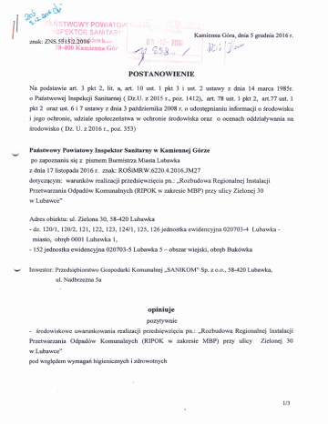 isF*KTS$i $AFJiTj:F i Kamienna GÓrandnia 5 grudnia201.6r. i "!,tp I)' t1 ',i", :lL) I:" POSTANOWIENIE Na podstawieart. 3 pk-t2, lit. a, art. 10 ust. I pkt 3 i ust. 2 ustawy z dnia 14 marca 1985r. o Paristwowej InspekcjiSanitarnej( Dz.U.22015 r., poz. I4l2), art.78ust. I pktf, art.77ust. I pkt2 otaz ust.6 i 7 ustawyzdnia3 puździernika 2008r. o udostępnianiu informacjio środowisku i jego ochronie,udzia|espołeczeristwa w ochronieśrodowiska oraz o ocenachoddziĄwania na ( Dz. U , z 2016t., poz.353) środowisko ParłstwowyPowiatowyInspektor Sanitarny w Kamiennej G6rze po zapoznaniusię z pismemBurmistrzaMiasta Lubawka z dnia17 listopada2016r. znak:ROSiMRW .6220.4.2016.JM27 pn.:,,RozbudowaRegionalnejInstalacji dotyczącym:warunkÓwreaIizacjiprzedsięwzięcia Przetwarzania OdpadowKomunalnych(RIPOK w zakresieMBP) przy ulicy Zielonej30 w Lubawce" Adres obiektu:ul. Zielona30, 58-420Lubawka - dz. I20ll,12012,l2l,122, 123,12411,125,126 jednostka ewidencyjna 020703-4Lubawkamiasto,obręb0001Lubawka1, - |szjednostkaewidencyjna020703-5Lubawka5 _ obszarwiejski,obrębBukÓwka v Inwestor:Przedsiębiorstwo GospodarkiKomuna|nej ,,SANIKoM' Sp.z o.o.,58-420Lubawka, ul' Nadbrzeżna5a opiniuje pozytywnie - środowiskowe uwarunkowaniarea|izacjiprzedsięwzięciapn.: ,,RozbudowaRegionalnej Instalacji Przenltuzania odpadÓw Komunalnych (RIPOK w zakresie MBP) przy ulicy Zielonej 30 w Lubawce" pod względemwymagaIlhigienicznychi zdrowotnych U3 Uzasadnienie: Pismem z dnia 17 listopada 2016 r. znak: ROSilvtR\\'.6110-l :016.JMf7 Burmistrz Miasta Lubawka wyst4pił z wnioskiem o opinię w Sprawierealizacji przedsięrr.zięcia pn.: ,,Rozbudowa Regionalnej Instalacji Przetwarzania odpadÓw Komunaln1.ch (RIPOK w zakresie MBP) przy ul. Zielonej 30 w Lubawce''. Do wniosku dołqczyłrrniosek inrr.estoraz dnla ff.08.20|6 r. otaz ,,Raporto oddziaĘwaniu przedsięwzięciana środowiskopn. ..Rozbudorr.aRegionalnej Instalacji PrzetwarzaruaodpadÓw Komunalnych (zuPoK w zakresie\IBP ) prz}.ul. Zielonej 30 w Lubawce'' opracowany przez zespoł:mgr Marcin olearnik, mgr Andrzej KrZ\ śko\\..mgr Agata Niwiriska _ Wrocław,paŹdziernik2016 r. Planowaneprzedsięwzięciezgodnie z 5t3 ust l pkt 80 rozporządzenia Rady MinistrÓw Z dnia 9 listopada 20|0 r. w sprarr.ie przedsięrr.ziecmog4cych Znacząco oddziaływać na środowisko(Dz. U. z20|6 r,poiz.7l) krralitikuje się do przedsierr.zięć mogących potencja|nieznaczącooddziatywaćna środowisko.Przedsierrziecierealizo\\.anebędzie na terenie Regionalnej Instalacji Przetwarzania Odpadow Komunalnl'ch (RIPOK) '*' Luba\\'ce. Planowane przedsięwzięcierealizowane będzię na terenie o powierzchni ok. |0.f571 ha. obszar objętyjest miejscowym planem zagospodarowania przesttzejnnego.\\'okoł Zakładu. \\. obrębie ktÓrego zrea|izowane zostanie przedsięwzięcie, znajdują się pola upra\\ne. terent' zadrzel+,ionei ł4ki. Najblizsza zabudowamieszkaniowa znajdujesię w odległości ok. 450 m \\' kierunku południowo. wschodnim od granicy dział'ekna ktÓrychrea|izowane będzie przedsięwzięcie. obecnie na terenieZakładuznajdująsię następująceinstalacjei obiekt1': Instalacja do mechaniczno -bio lo gicznego pr zetwar zania odpadou' tj .: . hala sortowniodpadÓw o powieruchniok.2460 m2 w ktorej znajdujesię linia technologicznado mechanicznego przetw aruania odpadÓw, . instalacjado biologicznego przetwarzaniaodpadÓw składaj4casię z 3 zarrtk'rtięt1.ch runeli (bioreaktorÓw)o wymiarach w osi 23 x 9,6 mkaŻdy, - biofiltr _biofiltr pionowy o wysokościok. l0 m, i średnicyok. 4 m, - plac dojrzewanialkompostowaniaodpadÓw o powierzchni ok.4224 m2, Składowiskoodpadow innych niz niebezprccznei obojętnetj.: . kwatera nr 1 _ lvypełniona zrekultywowana' - kwatera nr 2 aktualnie eksploatowana, - brodzik dezynfekcyjny. W ramach eksploatacjiobu instalacji wykorzystywane są: - waga, - zaplecze socjalne. W ramach inwestycji planowana jest rozbudowa instalacji do mechaniczno-biologicznego przetwarzanlaotaz kompostowania odpadow poprzęZbudowę następuj4cychobiektow: . budowaZ dodatkowychtuneli częścizamkniętejinstalacji do biologicznego przefwarzania odpadÓw, - wypostlzenieinstalacji w dodatkonvybiofiltr, . rozbudowęplacu dojrzewania lkompostowania odpadow, wraz z 3 boksami wyposazonymi w system napowietrzania, Łączna powierzchnia zabudowy nowych obiektÓw kompostowni i instalacji do stabil'izacjitlenorł.ej odpadow wyniesie ok. 2500 m2 @oksy zamknięte, boksy otwarte, plac napowiettzający, boks magazynowy dla odpadow kuchennych, rozbudowany plac dojrzewania lkompostowania oraz biofiltr, wraz z infrastrukturą techniczną). Dodatkowe tunele zamknięte otaz biofiltr zostan4 wykonane w obrębie istniejącego placu dojrzewania/kompostowaniaodpadÓw. W ramach rozbudowy i modemizacji instalacji do mechanicznego ptzetwarzania odpadÓw przewiduje się jej doposazeniew następująceurządzenia: . rozrywarkę workÓw, - dodatkowęsito dla frakcji 0-l5 (20) ffiffi, - dodatkowesito dla frakcji 300 mm, - wymiana oczek sita do wydzielenia frakcji ulegającejbiodegradacjiz 50 mm na 80 (90) lTlll1' - instalacja separatorapowietrznego, . wykonanie przepierzenia w hali sortowni pomiędzy zasobnią na odpady zmieszane, apozostałą zl3 .tlł częścią hali sońowni, - modemizacjainstalacjiwentylacji,poprzezmon:ź instalacjido odpylaniapowietrza procesowegoz zasobni oraz rejonupracy rozdrab'niacza, - montazdodatkowychprzenośników, - likwidacja stacji nadawczejna rzecz boksów buforowych, . zmianaukładuposzczególnych urządzeńdo mechanicznegoptzetstatzalia odpadów. Maksymalnawydajnośóinstalacji pozostaniena dotychcasowym poziomie 3000 Mg/rok. w przedstawionym raporcie przedstawiono opis aktualnie prowadzonych procesów technologicznychoraz opis procesów technologicznychpo rozbudowie i modemizacji ZakJadu' przewidywane ilości wykorzystywanych sulowców, wody, paliw i energii na etapie budowy i eksploatacji, rozwiązania chloniące środowiskona etapie budowy i eksploatacji instalacji, w zakresie 