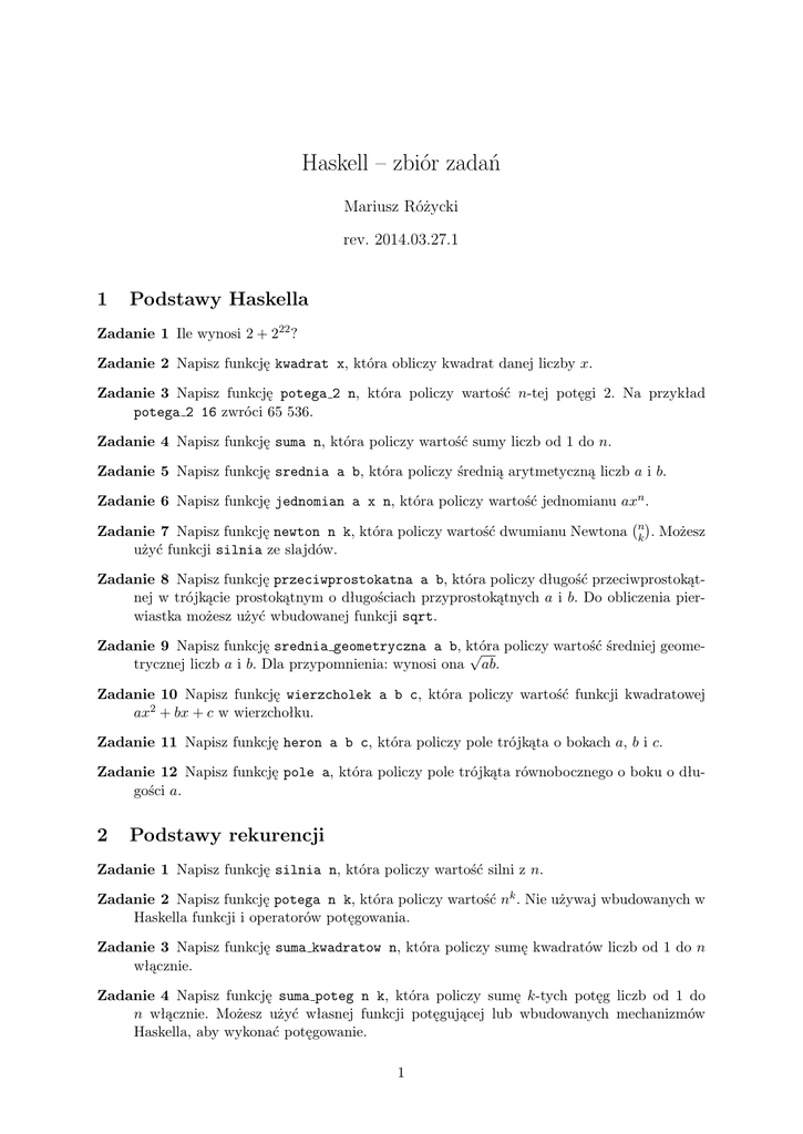 Haskell – zbiór zadań Mariusz Różycki rev. 2014.03.27.1 1 Podstawy Haskella Zadanie 1 Ile wynosi 2 + 222 ? Zadanie 2 Napisz funkcję kwadrat x, która obliczy kwadrat danej liczby x. Zadanie 3 Napisz funkcję potega 2 n, która policzy wartość n-tej potęgi 2. Na przykład potega 2 16 zwróci 65 536. Zadanie 4 Napisz funkcję suma n, która policzy wartość sumy liczb od 1 do n. Zadanie 5 Napisz funkcję srednia a b, która policzy średnią arytmetyczną liczb a i b. Zadanie 6 Napisz funkcję jednomian a x n, która policzy wartość jednomianu axn . Zadanie 7 Napisz funkcję newton n k, która policzy wartość dwumianu Newtona użyć funkcji silnia ze slajdów. n k . Możesz Zadanie 8 Napisz funkcję przeciwprostokatna a b, która policzy długość przeciwprostokątnej w trójkącie prostokątnym o długościach przyprostokątnych a i b. Do obliczenia pierwiastka możesz użyć wbudowanej funkcji sqrt. Zadanie 9 Napisz funkcję srednia geometryczna a b, która policzy wartość średniej geome√ trycznej liczb a i b. Dla przypomnienia: wynosi ona ab. Zadanie 10 Napisz funkcję wierzcholek a b c, która policzy wartość funkcji kwadratowej ax2 + bx + c w wierzchołku. Zadanie 11 Napisz funkcję heron a b c, która policzy pole trójkąta o bokach a, b i c. Zadanie 12 Napisz funkcję pole a, która policzy pole trójkąta równobocznego o boku o długości a. 2 Podstawy rekurencji Zadanie 1 Napisz funkcję silnia n, która policzy wartość silni z n. Zadanie 2 Napisz funkcję potega n k, która policzy wartość nk . Nie używaj wbudowanych w Haskella funkcji i operatorów potęgowania. Zadanie 3 Napisz funkcję suma kwadratow n, która policzy sumę kwadratów liczb od 1 do n włącznie. Zadanie 4 Napisz funkcję suma poteg n k, która policzy sumę k-tych potęg liczb od 1 do n włącznie. Możesz użyć własnej funkcji potęgującej lub wbudowanych mechanizmów Haskella, aby wykonać potęgowanie. 1 Zadanie 5 Napisz funkcję liebniz k, która policzy k-te przybliżenie liczby π z szeregu Liebniza. Szereg Liebniza wygląda następująco: ∞ X (−1)n n=0 2n + 1 lub bardziej po ludzku: 1− 1 1 1 + − + ··· 3 5 7 . 3 Kontrola przebiegu programu Zadanie 1 Napisz funkcję wartosc bezwzgledna x, która policzy wartość modułu z x. Zadanie 2 Napisz funkcję collatz cn, która dla danego wyrazu ciągu Collatza cn policzy wartość nastepnego wyrazu. Definicję tego ciągu znajdziesz w slajdach. Zadanie 3 Napisz funkcję signum n, która dla danego n obliczy i zwróci wartość sgn(n). Zadanie 4 Napisz funkcję minimum a b, która wybierze mniejszą z wartości a i b. Zadanie 5 Napisz funkcję minimum a b c, która wybierze najmniejszą z wartości a, b, c. Zadanie 6 Napisz funkcję rownanie kwadratowe a b c, która obliczy liczbę rozwiązań równania ax2 + bx + c = 0. 2