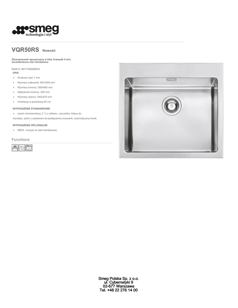 VQR50RS Nowość Zlewozmywak wpuszczany w blat, krawędź 4 mm, szczotkowana stal nierdzewna EAN13: 8017709208974 OPIS Grubość stali 1 mm Wymiary całkowite: 567x500 mm Wymiary komory: 500x400 mm Głębokość komory: 200 mm Wymiary otworu: 545x470 mm Instalacja w podstawę 60 cm WYPOSAŻENIE STANDARDOWE zawór mimośrodowy 3 “½ z sitkiem, uszczelka, klipsy do montażu, syfon z zestawem do podłączenia zmywarki, automatyczny korek WYPOSAŻENIE OPCJONALNE DB34 - koszyk ze stali nierdzewnej Functions Smeg Polska Sp. z o.o. ul. Cybernetyki 9 02-677 Warszawa Tel. +48 22 276 14 00 VQR50RS iLOŚĆ KOMÓR: 1 stal nierdzewna 50 cm zlewozmywaki ze stali nierdzewnej wpuszczane w blat 60 CM PODSTAWA: Szerokość szafki/ podstawy wymagana do instalacji - 60 cm INSTALACJA NA RÓWNI Z BLATEM: Modele instalowane na równi z blatem, zapewniają równą powierzchnię roboczą. GŁEBOKOŚĆ KOMORY: Głębokość komory zależy od modelu i waha się od 16 do 24 cm Smeg Polska Sp. z o.o. ul. Cybernetyki 9 02-677 Warszawa Tel. +48 22 276 14 00 VQR50RS iLOŚĆ KOMÓR: 1 stal nierdzewna 50 cm zlewozmywaki ze stali nierdzewnej wpuszczane w blat Smeg Polska Sp. z o.o. ul. Cybernetyki 9 02-677 Warszawa Tel. +48 22 276 14 00