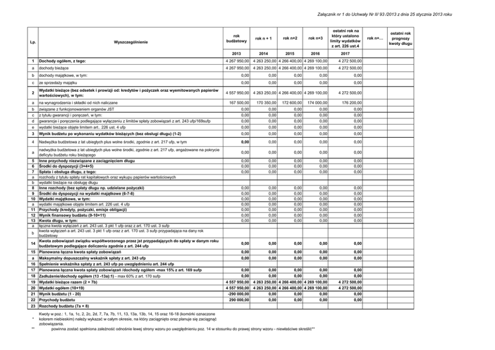 Załącznik nr 1 do Uchwały Nr II/ 93 /2013 z dnia 25 stycznia 2013 roku Wyszczególnienie Lp. rok budżetowy 2013 rok n + 1 rok n+2 rok n+3 2014 2015 2016 ostatni rok na który ustalono limity wydatków z art. 226 ust.4 2017 1 Dochody ogółem, z tego: 4 267 950,00 4 263 250,00 4 266 400,00 4 269 100,00 4 272 500,00 a dochody bieżące 4 267 950,00 4 263 250,00 4 266 400,00 4 269 100,00 4 272 500,00 b dochody majątkowe, w tym: 0,00 0,00 0,00 0,00 0,00 c ze sprzedaży majątku 0,00 0,00 0,00 0,00 0,00 2 Wydatki bieżące (bez odsetek i prowizji od: kredytów i pożyczek oraz wyemitowanych papierów wartościowych), w tym: 4 263 250,00 4 266 400,00 4 269 100,00 4 272 500,00 a na wynagrodzenia i składki od nich naliczane 167 500,00 170 350,00 172 600,00 174 000,00 176 200,00 b związane z funkcjonowaniem organów JST 0,00 0,00 0,00 0,00 0,00 c z tytułu gwarancji i poręczeń, w tym: 0,00 0,00 0,00 0,00 0,00 d gwarancje i poręczenia podlegające wyłączeniu z limitów spłaty zobowiązań z art. 243 ufp/169sufp 0,00 0,00 0,00 0,00 0,00 e wydatki bieżące objęte limitem art.. 226 ust. 4 ufp 0,00 0,00 0,00 0,00 0,00 3 Wynik budżetu po wykonaniu wydatków bieżących (bez obsługi długu) (1-2) 0,00 0,00 0,00 0,00 0,00 4 Nadwyżka budżetowa z lat ubiegłych plus wolne środki, zgodnie z art. 217 ufp, w tym 0,00 0,00 0,00 0,00 0,00 a nadwyżka budżetowa z lat ubiegłych plus wolne środki, zgodnie z art. 217 ufp, angażowane na pokrycie deficytu budżetu roku bieżącego 0,00 0,00 0,00 0,00 0,00 0,00 0,00 0,00 0,00 0,00 0,00 0,00 0,00 0,00 0,00 0,00 0,00 0,00 0,00 0,00 0,00 0,00 0,00 0,00 0,00 0,00 0,00 0,00 0,00 0,00 0,00 0,00 0,00 0,00 0,00 0,00 0,00 0,00 0,00 0,00 0,00 0,00 0,00 0,00 0,00 0,00 0,00 0,00 0,00 0,00 0,00 0,00 0,00 0,00 0,00 0,00 0,00 0,00 0,00 0,00 0,00 0,00 0,00 0,00 0,00 0,00 0,00 0,00 0,00 0,00 17 Planowana łączna kwota spłaty zobowiązań /dochody ogółem -max 15% z art. 169 sufp 0,00 0,00 0,00 0,00 0,00 18 Zadłużenie/dochody ogółem (13 -13a):1) - max 60% z art. 170 sufp 19 Wydatki bieżące razem (2 + 7b) 0,00 0,00 0,00 0,00 0,00 4 557 950,00 4 263 250,00 4 266 400,00 4 269 100,00 4 272 500,00 20 Wydatki ogółem (10+19) 4 557 950,00 4 263 250,00 4 266 400,00 4 269 100,00 4 272 500,00 Inne przychody niezwiązane z zaciągnięciem długu Środki do dyspozycji (3+4+5) Spłata i obsługa długu, z tego: rozchody z tytułu spłaty rat kapitałowych oraz wykupu papierów wartościowych wydatki bieżące na obsługę długu Inne rozchody (bez spłaty długu np. udzielane pożyczki) Środki do dyspozycji na wydatki majątkowe (6-7-8) Wydatki majątkowe, w tym: wydatki majątkowe objęte limitem art. 226 ust. 4 ufp Przychody (kredyty, pożyczki, emisje obligacji) Wynik finansowy budżetu (9-10+11) Kwota długu, w tym: łączna kwota wyłączeń z art. 243 ust. 3 pkt 1 ufp oraz z art. 170 ust. 3 sufp kwota wyłączeń a art. 243 ust. 3 pkt 1 ufp oraz z art. 170 ust. 3 sufp przypadająca na dany rok b budżetowy Kwota zobowiązań związku współtworzonego przez jst przypadających do spłaty w danym roku 14 budżetowym podlegające doliczeniu zgodnie z art. 244 ufp 15 Planowana łączna kwota spłaty zobowiązań 5 6 7 a b 8 9 10 a 11 12 13 a a Maksymalny dopuszczalny wskaźnik spłaty z art. 243 ufp 4 557 950,00 16 Spełnienie wskaźnika spłaty z art. 243 ufp po uwzględnieniu art. 244 ufp 21 Wynik budżetu (1 - 20) 22 Przychody budżetu -290 000,00 0,00 0,00 0,00 0,00 290 000,00 0,00 0,00 0,00 0,00 23 Rozchody budżetu (7a + 8) * ** Kwoty w poz.: 1, 1a, 1c, 2, 2c, 2d, 7, 7a, 7b, 11, 13, 13a, 13b, 14, 15 oraz 16-18 (komórki oznaczone kolorem niebieskim) należy wykazać w całym okresie, na który zaciągnięto oraz planuje się zaciągnąć zobowiązania. powinna zostać spełniona zależność odnośnie lewej strony wzoru po uwzględnieniu poz. 14 w stosunku do prawej strony wzoru - niewłaściwe skreślić** rok n+… ostatni rok prognozy kwoty długu