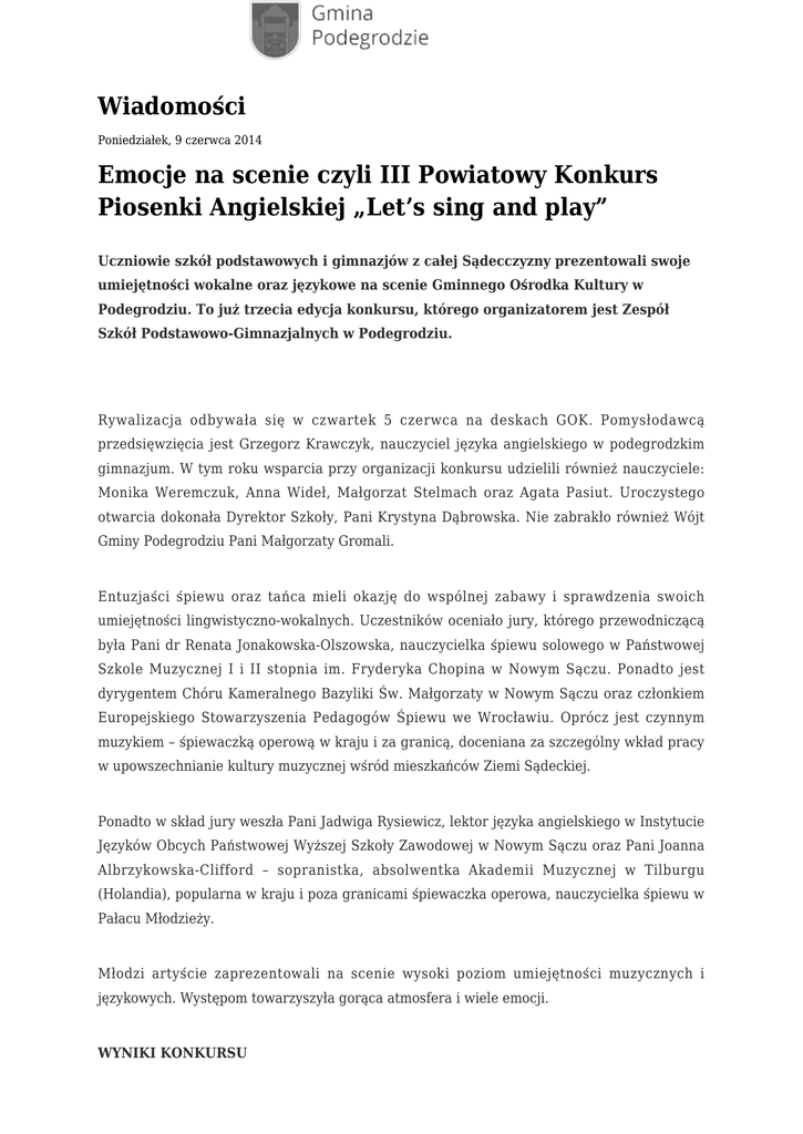 Wiadomości Poniedziałek, 9 czerwca 2014 Emocje na scenie czyli III Powiatowy Konkurs Piosenki Angielskiej „Let’s sing and play” Uczniowie szkół podstawowych i gimnazjów z całej Sądecczyzny prezentowali swoje umiejętności wokalne oraz językowe na scenie Gminnego Ośrodka Kultury w Podegrodziu. To już trzecia edycja konkursu, którego organizatorem jest Zespół Szkół Podstawowo-Gimnazjalnych w Podegrodziu. Rywalizacja odbywała się w czwartek 5 czerwca na deskach GOK. Pomysłodawcą przedsięwzięcia jest Grzegorz Krawczyk, nauczyciel języka angielskiego w podegrodzkim gimnazjum. W tym roku wsparcia przy organizacji konkursu udzielili również nauczyciele: Monika Weremczuk, Anna Wideł, Małgorzat Stelmach oraz Agata Pasiut. Uroczystego otwarcia dokonała Dyrektor Szkoły, Pani Krystyna Dąbrowska. Nie zabrakło również Wójt Gminy Podegrodziu Pani Małgorzaty Gromali. Entuzjaści śpiewu oraz tańca mieli okazję do wspólnej zabawy i sprawdzenia swoich umiejętności lingwistyczno-wokalnych. Uczestników oceniało jury, którego przewodniczącą była Pani dr Renata Jonakowska-Olszowska, nauczycielka śpiewu solowego w Państwowej Szkole Muzycznej I i II stopnia im. Fryderyka Chopina w Nowym Sączu. Ponadto jest dyrygentem Chóru Kameralnego Bazyliki Św. Małgorzaty w Nowym Sączu oraz członkiem Europejskiego Stowarzyszenia Pedagogów Śpiewu we Wrocławiu. Oprócz jest czynnym muzykiem – śpiewaczką operową w kraju i za granicą, doceniana za szczególny wkład pracy w upowszechnianie kultury muzycznej wśród mieszkańców Ziemi Sądeckiej. Ponadto w skład jury weszła Pani Jadwiga Rysiewicz, lektor języka angielskiego w Instytucie Języków Obcych Państwowej Wyższej Szkoły Zawodowej w Nowym Sączu oraz Pani Joanna Albrzykowska-Clifford – sopranistka, absolwentka Akademii Muzycznej w Tilburgu (Holandia), popularna w kraju i poza granicami śpiewaczka operowa, nauczycielka śpiewu w Pałacu Młodzieży. Młodzi artyście zaprezentowali na scenie wysoki poziom umiejętności muzycznych i językowych. Występom towarzyszyła gorąca atmosfera i wiele emocji. WYNIKI KONKURSU SZKOŁY PODSTAWOWE KLASY 4-6 I miejsce – Karolina Łosowska (Zespół Szkolno – Przedszkolny z Siołkowej) II miejsce – Jolanta Mrówka (Szkoła Podstawowa w Olszanie) III miejsce – Martyna Petrażycka (Szkoła Podstawowa im. St. I J. Potoczków w Rdziostowie) Wyróżnienie Patrycja Hajduk oraz Julia Oleksy (Zespół Szkół Podstawowo-Gimnazjalnych im. Jana Pawła II w Łososinie Dolnej) Miłosz Haza (Szkoła Podstawowa im. Ks. Kardynała Stefana Wyszyńskiego w Kadczy) Nagroda dyrektora ZSPG w Podegrodziu Karolina Łosowska (Zespół Szkolno-Przedszkolna w Siołkowej) Nagroda publiczności (100 zł) Karolina Łosowska (Zespół Szkolno-Przedszkolna w Siołkowej) GIMNAZJA I miejsce – Anita Dudczak (Samorządowe Centrum Edukacji Szkolnej – Publiczne Gimnazjum w Bereście) II miejsce (ex aequo) – Anna Kita (Gimnazjum nr 11 im. Adama Mickiewicza w Nowym Sączu) oraz Zespół EXPERYMENT (ZSPG w Podegrodziu) III miejsce (ex aequo) – Edyta Dobroszek (Publiczne Gimnazjum w Nawojowej) oraz Justyna Zawiślan i Grzegorz Sroka (Gimnazjum im. gen. J.Gizy w Wielogłowach) Wyróżnienie Karolina Pietrzak (Gimnazjum nr 5 im. św. Kingi w Nowym Sączu) oraz Emilia Rucińska (Zespół Szkolno-Gimnazjalny w Zagorzenie) Nagroda publiczności (100 zł) Justyna Zawiślan (Gimnazjum im. gen. J. Gizy w Wielogłowach) Zwycięzcy oraz wszyscy, którzy znaleźli się na podium otrzymali nagrody rzeczowe. Wszyscy wykonawcy natomiast dyplomy uczestnictwa w konkursie. Warto również wspomnieć, że rywalizacja nie mogłaby się odbyć gdyby nie wsparcie sponsorów, a byli to: Urząd Gminy w Podegrodziu, który reprezentowała Pani Wójt, Małgorzata Gromala Pan Andrzej Poręba – radny wsi Olszanka oraz Pan Adam Poręba Pan Stanisław Plata – radny wsi Gostwica Bank Spółdzielczy w Starym Sączu Bank Spółdzielczy w Podegrodziu Spółka Jawna AGRO-HURT w Nowym Sączu Państwo Małgorzata i Marek Piękoś – Apteka „Pilula” w Podegrodziu Rada Rodziców działająca przy Zespole Szkół Podstawowo-Gimnazjalnych im. bł. O. Stanisława Papczyńskiego w Podegrodziu Pan Tomasz Kulig – właściciel księgarni językowej „MENTOR” w Nowym Sączu Pan Andrzej Stawiarski – firma gastronomiczna „RAJ” w Gołkowicach Dolnych Wydawnictwo Pearson Central Europe Sp. z o.o. Wydawnictwo Nowa Era Państwo Zofia i Wiesław Czop – Firma handlowo-usługowa GRÓD Pani Renata Krajewska – manager Domu Weselnego TOSKANIA w Podegrodziu Zakład masarski Zdrój spółka jawna Adam Gonciarz, Tomasz Gonciarz Piekarnia ASPOL w Stadłach Uzdrowisko Krynica Żegiestów S.A. Krynica Zdrój Pani Katarzyna Kawik – nauczyciel języka angielskiego w ZSPG w Podegrodziu Pani Beata Kukiełka-Król – wykładowca w Instytucie Języków Obcych Państwowej Wyższej Szkole Zawodowej w Nowym Sączu Pani Dyrektor ZSPG w Podegrodziu, Krystyna Dąbrowska Bank PeKaO S.A. w Nowym Sączu