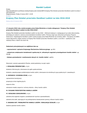 Handel Ludzmi Źródło: http://handelludzmi.eu/hl/baza-wiedzy/krajowy-plan-dzialan/6875,Krajowy-Plan-Dzialan-przeciwko-Handlowi-Ludzmi-na-lata-2 016-2018.html Wygenerowano: Środa, 8 marca 2017, 13:29 AAA Krajowy Plan Działań przeciwko Handlowi Ludźmi na lata 2016-2018 Dodane dnia 23 sierpnia 2016 17 sierpnia 2016 roku został przyjęty przez Radę Ministrów w trybie obiegowym "Krajowy Plan Działań przeciwko Handlowi Ludźmi na lata 2016-2018". Krajowy Plan Działań przeciwko Handlowi Ludźmi na lata 2016 – 2018 jest kolejnym z następujących po sobie dokumentów, określających zadania z zakresu przeciwdziałania handlowi ludźmi. Pierwszy tego typu dokument pt.Krajowy Program Zwalczania i Zapobiegania Handlowi Ludźmi został przyjęty przez Radę Ministrów we wrześniu 2003 r. Począwszy od 2009 r. nazwa dokumentu uległa zmianie na Krajowy Plan Działań przeciwko Handlowi Ludźmi, a od 2013 r. wydłużono czas realizacji Planu z dwóch do trzech lat. Zadaniami priorytetowymi na najbliższe lata są: - usprawnienie i opisanie Krajowego Mechanizmu Referencyjnego - p. II.1 - ustawiczne zwiększanie świadomości społecznej nt. aktualnych zagrożeń przestępstwem handlu ludźmi - p. I.1-I.6 - bieżące gromadzenie i analizowanie danych nt. handlu ludźmi - p.V.1. Dokument, wzorem poprzednich Planów, został podzielony na pięć części: I. DZIAŁANIA PREWENCYJNE, w tym: działania informacyjne, skierowane do ogółu społeczeństwa; działania, popularyzujące problematykę handlu ludźmi, skierowane do określonych grup społecznych i zawodowych. II. WSPARCIE I OCHRONA OFIAR, w tym: usprawnienie koordynacji; propozycje zmian legislacyjnych; wsparcie ofiar; wdrażanie modelu wsparcia / ochrony dziecka - ofiary handlu ludźmi. III. ŚCIGANIE PRZESTĘPSTWA HANDLU LUDŹMI IV. DZIAŁANIA SZKOLENIOWE, w tym: szkolenia dla organów ścigania i przedstawicieli wymiaru sprawiedliwości; szkolenia dla osób, zajmujących się profesjonalnie świadczeniem pomocy ofiarom handlu ludźmi. V. BADANIA DOT. PROBLEMATYKI HANDLU LUDŹMI / EWALUACJA DZIAŁAŃ, w tym badania zjawiska handlu ludźmi; współpraca międzynarodowa. Zachęcamy do zapoznania się z dokumentem. Załączniki do strony KPD 2016-2018 812.19 KB RM-24-186-16 z 17.08.2016 64.58 KB NAP 2016-2018 399.58 KB Tagi: Krajowy Plan Działań, KPD podziel się treścią: wersja pdf drukuj