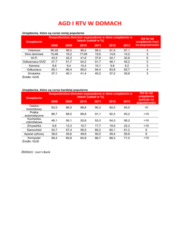 AGD I RTV W DOMACH Urządzenia, które są coraz mniej popularne Urządzenie Gospodarstwa domowe wyposażone w dane urządzenie w latach (udział w %) Telewizor Kino domowe Hi-Fi Odtwarzacz DVD Kamera Odkurzacz Drukarka Źródło: GUS 2008 2009 2010 2011 2012 2013 Od ilu lat urządzenie traci na popularności 98,48 15,46 43,3 47,7 8,9 95,1 37,1 98,5 16,2 42,3 51,7 9,4 95,4 40,1 98,4 17,09 41,6 54,2 10,4 95,0 41,4 98,4 15,6 37,6 51,7 10,1 94,4 40,2 97,9 14,6 34,1 48,1 9,8 93,8 37,2 97,1 14,2 32,8 45,2 9,2 93,7 35,8 4 3 6 3 3 4 3 Urządzenia, które są coraz bardziej popularne Gospodarstwa domowe wyposażone w dane urządzenie w latach (udział w %) Urządzenie Telefon komórkowy Pralka automatyczna Kuchenka mikrofalowa Zmywarka Samochód Aparat cyfrowy Komputer Źródło: GUS ŹRÓDŁO: Lion’s Bank 2008 2009 2010 2011 2012 2013 Od ilu lat urządzenie zyskuje na popularności 83,5 86,5 88,8 90,3 92,0 93,5 10 86,7 89,0 89,8 91,1 92,3 93,2 >10 46,1 50,1 52,6 53,3 54,3 56,2 >10 9,6 54,7 38,0 56,4 12,3 57,4 45,6 60,8 15,7 59,5 49,6 64,9 17,7 60,2 50,0 66,7 19,5 60,1 49,4 68,3 22,3 61,2 50,8 71,5 >10 9 8 >10