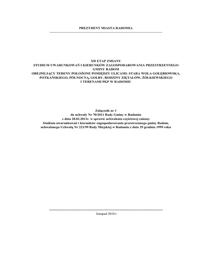 PREZYDENT MIASTA RADOMIA --------------------------------------------------------------------------------------------------- XII ETAP ZMIANY STUDIUM UWARUNKOWAŃ I KIERUNKÓW ZAGOSPODAROWANIA PRZESTRZENNEGO GMINY RADOM OBEJMUJĄCY TERENY POŁOŻONE POMIĘDZY ULICAMI: STARA WOLA GOŁĘBIOWSKA, POTKAŃSKIEGO, PÓŁNOCNĄ, GOLBY, RODZINY ZIĘTALÓW, ŻÓŁKIEWSKIEGO I TERENAMI PKP W RADOMIU Załącznik nr 1 do uchwały Nr 70/2011 Rady Gminy w Radomiu z dnia 28.02.2011r. w sprawie uchwalenia częściowej zmiany Studium uwarunkowań i kierunków zagospodarowania przestrzennego gminy Radom, uchwalonego Uchwałą Nr 221/99 Rady Miejskiej w Radomiu z dnia 29 grudnia 1999 roku ---------------------------------------------------------------------------------------------------listopad 2010 r XII ETAP ZMIANY STUDIUM UWARUNKOWAŃ I KIERUNKÓW ZAGOSPODAROWANIA PRZESTRZENNEGO GMINY RADOM --------------------------------------------------------------------------------------------------------------------------------------------------------------------------------------------------------------------------- SPIS TREŚCI I – INFORMACJE OGÓLNE 1.1 1.2 Podstawa prawna „Studium”. Przedmiot i zakres zmian. II – UWARUNKOWANIA 2.1. 2.2. 2.3. 2.4. 2.5. 2.6. 2.7. 2.8. Położenie. Przeznaczenie, dotychczasowe zagospodarowanie. Charakterystyka środowiska przyrodniczego. Stan dziedzictwa kulturowego i zabytków oraz dóbr kultury współczesnej. Stan prawny terenów i ich ochrona. Stan komunikacji i infrastruktury technicznej. Zadania z zakresu ponadlokalnych celów publicznych. Wnioski do kierunków zmian w strukturze przestrzennej gminy. III - KIERUNKI ZAGOSPODAROWANIA PRZESTRZENNEGO – USTALENIA 3.1. 3.2. 3.3. 3.4. 3.5. 3.6. 3.7. Kierunki zmian w strukturze przestrzennej gminy i przeznaczenia terenów. Kierunki i wskaźniki dotyczące zagospodarowania oraz użytkowania terenów. Obszary oraz zasady ochrony środowiska i jego zasobów, ochrony przyrody i krajobrazu. Obszary i zasady ochrony dziedzictwa kulturowego i zabytków oraz dóbr kultury współczesnej. Kierunki rozwoju komunikacji i infrastruktury technicznej. Obszary celu publicznego o znaczeniu lokalnym i ponadlokalnym. Zamierzenia gminy w zakresie sporządzenia miejscowych planów zagospodarowania przestrzennego. SPIS RYSUNKÓW – – – Załącznik Nr 2 do uchwały – Rys. Nr 1 - Studium uwarunkowań i kierunków zagospodarowania przestrzennego – uwarunkowania - wyrys – skala 1:10 000 Załącznik Nr 3 do uchwały – Rys. Nr 2 - Studium uwarunkowań i kierunków zagospodarowania przestrzennego – Kierunki zagospodarowania przestrzennego – Polityka przestrzenna – wyrys – skala 1:10 000 Załącznik Nr 4 do uchwały – Rys. Nr 3 - Zmiana studium uwarunkowań i kierunków zagospodarowania przestrzennego – Kierunki zagospodarowania przestrzennego - Polityka przestrzenna – zmiana - skala 1:10 000 ---------------------------------------------------------------------------------------------------------------------------------------------------------------------------------------------------- MIEJSKA PRACOWNIA URBANISTYCZNA UL. ŻEROMSKIEGO 53, 26-600 RADOM, tel.: (048) 363 15 94, tel/fax (048) 362 02 08, e-mail: [email protected] XII ETAP ZMIANY STUDIUM UWARUNKOWAŃ I KIERUNKÓW ZAGOSPODAROWANIA PRZESTRZENNEGO GMINY RADOM --------------------------------------------------------------------------------------------------------------------------------------------------------------------------------------------------------------------------- I. INFORMACJE OGÓLNE 1.1. PODSTAWA PRAWNA OPRACOWANIA STUDIUM Na podstawie art. 18 ust.2 pkt 5 ustawy z dnia 8 marca 1990r. o samorządzie gminnym (tekst jednolity Dz. U. Nr 142 z 2001r., poz. 1591 z późniejszymi zmianami) oraz art. 9. ust. 1 ustawy z dnia 27 marca 2003r. o planowaniu i zagospodarowaniu przestrzennym (Dz. U. Nr 80, poz. 717 z późniejszymi zmianami) Rada Miasta Radomia podjęła uchwałę Nr 848/2006 z dnia 3 lipca 2006 r. w sprawie przystąpienia do sporządzenia zmiany Studium uwarunkowań i kierunków zagospodarowania przestrzennego gminy Radom uchwalonego uchwałą nr 221/99 Rady Miejskiej w Radomiu z dnia 29.12.1999 r. Zmiany studium uchwalane są etapowo dla uzyskania zgodności sporządzanych miejscowych planów zagospodarowania przestrzennego z ustaleniami studium. Równolegle trwają prace nad zmianą mającą na celu aktualizację całego dokumentu studium w granicach administracyjnych gminy. W rejonie projektowanej zmiany podjęto uchwały: – Nr 101/2007 Rady Miejskiej w Radomiu z dnia 23.04.2007r. w sprawie przystąpienia do sporządzenia miejscowego planu zagospodarowania przestrzennego obejmującego teren ograniczony ul. Północną, terenami kolejowymi, ul. Stara Wola Gołębiowska i ul. Potkańskiego, zwanego „Stara Wola Gołębiowska”, – Nr 102/2007 Rady Miejskiej w Radomiu z dnia 23.04.2007r. w sprawie przystąpienia do sporządzenia miejscowego planu zagospodarowania przestrzennego obejmującego teren ograniczony ul. Żółkiewskiego, terenami kolejowymi, ul. Północną, granicą terenu osiedla jednorodzinnego przy ul. Północnej i ul. Zubrzyckiego zwanego „Plan Północna”. 1.2. PRZEDMIOT I ZAKRES ZMIAN W XII ETAPIE Przedmiotem zmiany „Studium” jest częściowa zmiana przeznaczenia terenów objętych opracowaniem. Wprowadza się następujące zmiany: – Tereny o dotychczasowym przeznaczeniu pod rolniczą przestrzeń produkcyjną położone po stronie północnej ul. Północnej, przeznacza się na ich fragmentach pod zabudowę mieszkaniową ekstensywną oraz pod przebieg ulicy zbiorczej. – Teren o dotychczasowym przeznaczeniu pod zespół przemysłowy położony po stronie północnej ul. Północnej przeznacza się pod zabudowę mieszkaniowo - usługową. – Część obszaru rolniczej przestrzeni produkcyjnej i część terenu o dotychczasowym przeznaczeniu usługowo - przemysłowym położonego po stronie południowej ul. Północnej 