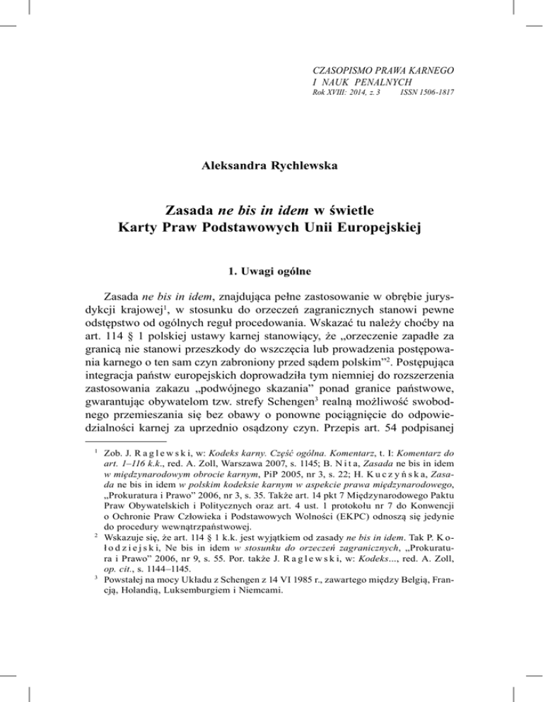 CZASOPISMO PRAWA KARNEGO I NAUK PENALNYCH Rok XVIII: 2014, z. 3 ISSN 1506-1817 Aleksandra Rychlewska Zasada ne bis in idem w świetle Karty Praw Podstawowych Unii Europejskiej 1. Uwagi ogólne Zasada ne bis in idem, znajdująca pełne zastosowanie w obrębie jurysdykcji krajowej1, w stosunku do orzeczeń zagranicznych stanowi pewne odstępstwo od ogólnych reguł procedowania. Wskazać tu należy choćby na art. 114 § 1 polskiej ustawy karnej stanowiący, że „orzeczenie zapadłe za granicą nie stanowi przeszkody do wszczęcia lub prowadzenia postępowania karnego o ten sam czyn zabroniony przed sądem polskim”2. Postępująca integracja państw europejskich doprowadziła tym niemniej do rozszerzenia zastosowania zakazu „podwójnego skazania” ponad granice państwowe, gwarantując obywatelom tzw. strefy Schengen3 realną możliwość swobodnego przemieszania się bez obawy o ponowne pociągnięcie do odpowiedzialności karnej za uprzednio osądzony czyn. Przepis art. 54 podpisanej 1 2 3 Zob. J. R a g l e w s k i, w: Kodeks karny. Część ogólna. Komentarz, t. I: Komentarz do art. 1–116 k.k., red. A. Zoll, Warszawa 2007, s. 1145; B. N i t a, Zasada ne bis in idem w międzynarodowym obrocie karnym, PiP 2005, nr 3, s. 22; H. K u c z y ń s k a, Zasada ne bis in idem w polskim kodeksie karnym w aspekcie prawa międzynarodowego, „Prokuratura i Prawo” 2006, nr 3, s. 35. Także art. 14 pkt 7 Międzynarodowego Paktu Praw Obywatelskich i Politycznych oraz art. 4 ust. 1 protokołu nr 7 do Konwencji o Ochronie Praw Człowieka i Podstawowych Wolności (EKPC) odnoszą się jedynie do procedury wewnątrzpaństwowej. Wskazuje się, że art. 114 § 1 k.k. jest wyjątkiem od zasady ne bis in idem. Tak P. K oł o d z i e j s k i, Ne bis in idem w stosunku do orzeczeń zagranicznych, „Prokuratura i Prawo” 2006, nr 9, s. 55. Por. także J. R a g l e w s k i, w: Kodeks…, red. A. Zoll, op. cit., s. 1144–1145. Powstałej na mocy Układu z Schengen z 14 VI 1985 r., zawartego między Belgią, Francją, Holandią, Luksemburgiem i Niemcami. 118 Aleksandra Rychlewska w dniu 19 czerwca 1990 r. Konwencji Wykonawczej do Układu z Schengen (dalej: KWUS)4 przewiduje bowiem, że „osoba, której proces zakończył się wydaniem prawomocnego wyroku na obszarze jednej Umawiającej się Strony, nie może być ścigana na obszarze innej Umawiającej się Strony za ten sam czyn, pod warunkiem że została nałożona i wykonana kara lub jest ona w trakcie wykonywania, lub nie może być już wykonana na mocy przepisów prawnych skazującej Umawiającej się Strony”. Notabene, przesłanka „wykonania kary” przy wyrokach skazujących pomyślana była w celu eliminowania tych przypadków, w których dana osoba pozostałaby ostatecznie bezkarna wobec niewykonania wymierzonej przez pierwsze umawiające się państwo kary5. Z dniem przystąpienia Polski do Unii Europejskiej (UE) zasada ta znalazła wyraz także w polskim prawodawstwie, jako że dodany z myślą o unijnym acquis communautaire art. 114 § 3 pkt 3 k.k. sanuje właśnie prawomocne orzeczenia sądów lub innych organów państw obcych kończące postępowanie karne, jeżeli obowiązek ich uwzględnienia wynika z wiążącej Rzeczpospolitą Polską umowy międzynarodowej. Obecnie zasada ne bis in idem regulowana jest w prawie unijnym nie tylko w Konwencji Wykonawczej do Układu z Schengen, a gwarantowana jest także przez Kartę Praw Podstawowych UE z 7 grudnia 2000 r. (dalej: KPP), obowiązującą de facto od 1 grudnia 2009 r.6 Jego art. 50 stanowi wszak podobnie, że: „nikt nie może być ponownie sądzony lub ukarany w postępowaniu karnym za ten sam czyn zabroniony pod groźbą kary, w odniesieniu do którego zgodnie z ustawą został już uprzednio uniewinniony lub za który został już uprzednio skazany prawomocnym wyrokiem na terytorium Unii”. Podnosi się, że wraz z wejściem w życie Traktatu Lizbońskiego7 i Karty Praw Podstawowych UE, to właśnie art. 50 KPP przejął rolę w zakresie wyznaczania europejskiego standardu zasady ne bis in idem8. Co więcej, 4 5 6 7 8 Dz.Urz. UE L 239 z 2000 r., s. 19. Wyrok Trybunału Sprawiedliwości UE (TSUE) z dn. 18 VII 2007 r. w sprawie Kretzinger, C–288/05, Zb.Orz. UE 2007, nr 7B, s. I–06441, pkt 51. Dz.Urz. UE z 2007 r., C 303, s. 1. Traktat z Lizbony zmieniający Traktat o Unii Europejskiej i Traktat ustanawiający Wspólnotę Europejską z dn. 13 XII 2007 r. (Dz.U. z 2009 r., Nr 203, poz. 1569). Z. B a r w i n a, Zasada wzajemnego uznawania w sprawach karnych, Warszawa 2012, s. 120. Zob. także A. S a k o w i c z, Zasada ne bis in idem w prawie karnym w ujęciu paneuropejskim, Białystok 2011, s. 421–422. Jak podaje zaś H. Kuczyńska: „Przełomowość tego uregulowania polega na stworzeniu w ten sposób jednolitej przestrzeni prawnej, na której w sposób jednolicie prawomocny obowiązywać mają orzeczenia wydawane we wszystkich państwach członkowskich” (tak H. K u c z y ń s k a, op. cit., s. 45–46). Zasada ne bis in idem w świetle Karty Praw Podstawowych Unii Europejskiej 119 standard ten uległ tutaj podwyższeniu, bowiem art. 50 KPP pomija wspomnianą uprzednio przesłankę „wykonania kary”, która w myśl Konwencji Wykonawczej do Układu z Schengen aktualizować miała zakaz ne bis in idem przy wyrokach skazujących. Innymi słowy, zmniejszeniu ulegają zatem ograniczenia dotyczące obowiązku uznania i uwzględnienia obcego orzeczenia kończącego postępowanie9. Na kanwie powyższego rodzi się pytanie o wzajemną relację art. 54 KWUS i art. 50 KPP, a konkretnie o to, który z przepisów winien być przez sąd zastosowany w celu rozstrzygnięcia kwestii „podwójnego skazania”. O ile Karta Praw Podstawowych UE nie jest umową międzynarodową, a dokumentem opracowanym przez powołany Konwent, ogłoszonym przez przewodniczących trzech instytucji unijnych – Parlamentu Europejskiego, Rady i Komisji, tak podniesiona została do rangi prawa pierwotnego 