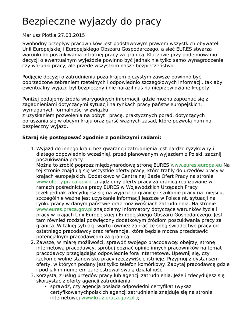 Bezpieczne wyjazdy do pracy Mariusz Płotka 27.03.2015 Swobodny przepływ pracowników jest podstawowym prawem wszystkich obywateli Unii Europejskiej i Europejskiego Obszaru Gospodarczego, a sieć EURES stwarza warunki do poszukiwania intratnej pracy za granicą. Kluczowe przy podejmowaniu decyzji o ewentualnym wyjeździe powinno być jednak nie tylko samo wynagrodzenie czy warunki pracy, ale przede wszystkim nasze bezpieczeństwo. Podjęcie decyzji o zatrudnieniu poza krajem ojczystym zawsze powinno być poprzedzone zebraniem rzetelnych i odpowiednio szczegółowych informacji, tak aby ewentualny wyjazd był bezpieczny i nie naraził nas na nieprzewidziane kłopoty. Poniżej podajemy źródła wiarygodnych informacji, gdzie można zapoznać się z zagadnieniami dotyczącymi sytuacji na rynkach pracy państw europejskich, wymaganych formalności w związku z uzyskaniem pozwolenia na pobyt i pracę, praktycznych porad, dotyczących poruszania się w obcym kraju oraz garść ważnych zasad, które pozwolą nam na bezpieczny wyjazd. Staraj się postępować zgodnie z poniższymi radami: 1. Wyjazd do innego kraju bez gwarancji zatrudnienia jest bardzo ryzykowny i dlatego odpowiednio wcześniej, przed planowanym wyjazdem z Polski, zacznij poszukiwania pracy. Można to zrobić poprzez międzynarodową stronę EURES www.eures.europa.eu Na tej stronie znajdują się wszystkie oferty pracy, które trafiły do urzędów pracy w krajach europejskich. Dodatkowo w Centralnej Bazie Ofert Pracy na stronie www.oferty.praca.gov.pl znajdziemy oferty pracy za granicą realizowane w ramach pośrednictwa pracy EURES w Wojewódzkich Urzędach Pracy Jeżeli jednak zdecydujesz się na wyjazd za granicę i szukanie pracy na miejscu, szczególnie ważne jest uzyskanie informacji jeszcze w Polsce nt. sytuacji na rynku pracy w danym państwie oraz możliwościach zatrudnienia. Na stronie www.eures.praca.gov.pl znajdziemy informatory dotyczące warunków życia i pracy w krajach Unii Europejskiej i Europejskiego Obszaru Gospodarczego. Jest tam również rozdział poświęcony dodatkowym źródłom poszukiwania pracy za granicą. W takiej sytuacji warto również zabrać ze sobą świadectwo pracy od ostatniego pracodawcy oraz referencje, które będzie można przedstawić potencjalnym pracodawcom za granicą. 2. Zawsze, w miarę możliwości, sprawdź swojego pracodawcę: obejrzyj stronę internetową pracodawcy, spróbuj poznać opinie innych pracowników na temat pracodawcy przeglądając odpowiednie fora internetowe. Upewnij się, czy rzekomo wolne stanowisko pracy rzeczywiście istnieje. Przyjmuj z dystansem oferty, w których podany jest tylko telefon komórkowy. Zapytaj pracodawcę gdzie i pod jakim numerem zarejestrował swoją działalność. 3. Korzystaj z usług urzędów pracy lub agencji zatrudnienia. Jeżeli zdecydujesz się skorzystać z oferty agencji zatrudnienia • sprawdź, czy agencja posiada odpowiedni certyfikat (wykaz certyfikowanychpolskich agencji zatrudnienia znajduje się na stronie internetowej www.kraz.praca.gov.pl ); • upewnij się, czy dana agencja posiada umowę zawartą z pracodawcą zagranicznym i czy ma doświadczenie w kierowaniu do pracy za granicą. Poproś o numery telefonów do pracodawcy zagranicznego oraz do osób, które już skorzystały z jego oferty pracy, abyś mógł z nimi skonsultować warunki pracy i wymagania pracodawcy; • bezwzględnie domagaj się spisania z agencją zatrudnienia umowy, w której będą podane warunki pracy, płacy, należne świadczenia itp.; • pamiętaj, że agencja nie może pobierać od poszukujących pracy za granicą żadnych opłat, za wyjątkiem kwot z tytułu faktycznie poniesionych kosztów (tłumaczenie dokumentów, koszty podróży, wydanie wizy, badania lekarskie). Pobieranie przez agencję opłat za pośrednictwo pracy jest naruszeniem prawa. Dowód wpłaty na konto nieuczciwego pośrednika nie daje dużych szans na odzyskanie wpłaconej kwoty. • nie przepłacaj za przejazd. Zanim zapłacisz agencji za podróż sprawdź, ile wynoszą ceny u innych przewoźników; • nigdy nie płać przed wyjazdem za mieszkanie za granicą oferowane przez agencję. Zdarza się, że mieszkanie, za którego wynajem zapłacisz nie istnieje. 4. Sprawdź, ile wynoszą koszty utrzymania w danym kraju (ceny artykułów spożywczych, wynajmu mieszkania, transportu); w niektórych krajach Unii Europejskiej „życie" jest bardzo drogie. Zabierz ze sobą wystarczające środki finansowe zapewniające utrzymanie do chwili otrzymania pierwszej wypłaty lub na wykupienie biletu powrotnego, w sytuacji gdyby zaistniała konieczność wcześniejszej powrotu do Polski. 5. Oceń obiektywnie swoje umiejętności językowe. Jeżeli nie mówisz dobrze w języku pracodawcy, Twoje szanse na znalezienie pracy maleją. 6. Sprawdź, gdzie mieści się polski konsulat, najbliższy Twojemu miejscu pracy w danym kraju. Weź również ze sobą dane kontaktowe znajomych osób, które już tam są. 7. Bądź świadomy swoich praw. Zapoznaj się przed wyjazdem z podstawowymi przepisami prawnymi w danym kraju (np. jakie jest minimalne wynagrodzenie, gdzie należy zarejestrować się po przyjeździe, aby uzyskać prawo pobytu i prawo do opieki lekarskiej). Skorzystaj z informacji na stronach internetowych: www.eures.praca.gov.pl lub www.eures.europa.eu 8. Zabierz ze sobą wszystkie niezbędne dokumenty: ważny dokument tożsamości (paszport albo dowód osobisty), inne potrzebne dokumenty takie jak: akt urodzenia, świadectwa pracy, certyfikaty, Europejską kartę ubezpieczenia zdrowotnego, ubezpieczenie od nieszczęśliwych wypadków lub prywatne ubezpieczenie zdrowotne (opcjonalnie), wszelkie umowy lub korespondencję z pracodawcą. Warto upewnić się, że warunki umowy o pracę oraz zawarte w niej informacje są dla nas zrozumiałe i zapoznać się z nimi na spokojnie przed ich podpisaniem. 9. Pamiętaj, że podejmujesz pracę w oparciu o przepisy prawa obowiązujące w 