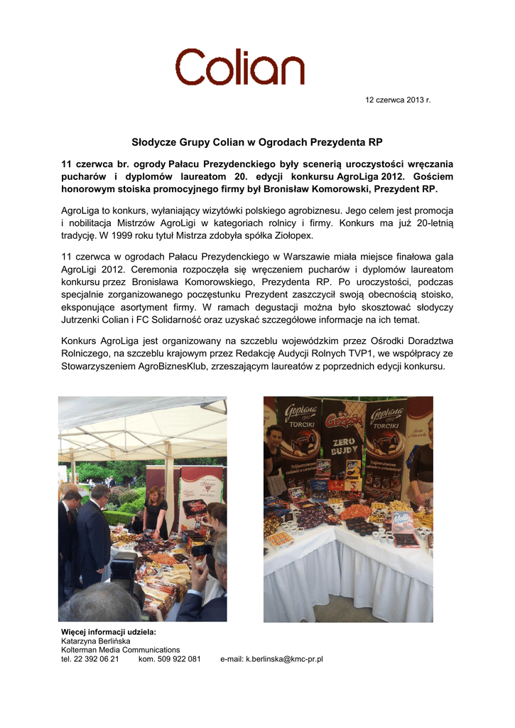12 czerwca 2013 r. Słodycze Grupy Colian w Ogrodach Prezydenta RP 11 czerwca br. ogrody Pałacu Prezydenckiego były scenerią uroczystości wręczania pucharów i dyplomów laureatom 20. edycji konkursu AgroLiga 2012. Gościem honorowym stoiska promocyjnego firmy był Bronisław Komorowski, Prezydent RP. AgroLiga to konkurs, wyłaniający wizytówki polskiego agrobiznesu. Jego celem jest promocja i nobilitacja Mistrzów AgroLigi w kategoriach rolnicy i firmy. Konkurs ma już 20-letnią tradycję. W 1999 roku tytuł Mistrza zdobyła spółka Ziołopex. 11 czerwca w ogrodach Pałacu Prezydenckiego w Warszawie miała miejsce finałowa gala AgroLigi 2012. Ceremonia rozpoczęła się wręczeniem pucharów i dyplomów laureatom konkursu przez Bronisława Komorowskiego, Prezydenta RP. Po uroczystości, podczas specjalnie zorganizowanego poczęstunku Prezydent zaszczycił swoją obecnością stoisko, eksponujące asortyment firmy. W ramach degustacji można było skosztować słodyczy Jutrzenki Colian i FC Solidarność oraz uzyskać szczegółowe informacje na ich temat. Konkurs AgroLiga jest organizowany na szczeblu wojewódzkim przez Ośrodki Doradztwa Rolniczego, na szczeblu krajowym przez Redakcję Audycji Rolnych TVP1, we współpracy ze Stowarzyszeniem AgroBiznesKlub, zrzeszającym laureatów z poprzednich edycji konkursu. Więcej informacji udziela: Katarzyna Berlińska Kolterman Media Communications tel. 22 392 06 21 kom. 509 922 081 e-mail: [email protected]