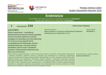 Postępy realizacji zadań Budżet Obywatelski Katowice 2016 Śródmieście Pula środków finansowych przeznaczona na jednostkę pomocniczą: 1 334 963,00 zł Wartość zadań wybranych przez mieszkańców: 1 292 018,00 zł 1 Liczba głosów: 534 L/5/1/2015 Zielony wypoczynek – rewitalizacja zdewastowanej przestrzeni zielonej pomiędzy ulicami Francuską i Rybnicką na terenie przyległym do budynków przy ulicy Rybnickiej 17-15-13 oraz Francuskiej 65-63-61 i przyległego garażu piętrowego, poprzez: rekultywację gruntu, aranżację nowych chodników, zasianie trawy i zasadzenie krzewów, umiejscowienie piaskownicy dla dzieci oraz mini siłowni Zakład Zieleni Miejskiej Lokalizacja zadania: Obszar pomiędzy ul. Francuską a wielorodzinnym budynkiem mieszkalnym przy ul. Rybnickiej 17-15-13 Kwota zadania: 400 000,00 zł Przeprowadzano wstępną weryfikację w terenie miejsc przeznaczonych na inwestycje. Przeprowadzono postępowanie Planowany termin realizacji zadania: i wyłoniono Projektanta. Podpisano umowę na wykonanie prac projektowych dn. 08.02.2016. Przygotowano Zadanie zrealizowane i umieszczono informację dotyczącą realizacji Budżetu Obywatelskiego na stronie internetowej ZZM Katowice (BIP). Dokonano odbioru prac projektowych. Rozpoczęto czynności związane z wyłonieniem wykonawcy, ogłoszono postepowanie przetargowe. Otwarcie ofert - 15 czerwca 2016. Podpisano umowę z Wykonawcą w dniu 4 lipca 2016 roku. Prace w toku – planowany termin zakończenia prac - 10 października 2016. Z uwagi na opóźnienie dostawy materiałów w szczególności oświetlenia oraz gabionów, termin zakończenia prac może się przesunąć do II dekady listopada. Prace zakończono, odbioru dokonano w dniu 20 października 2016. 2 Liczba głosów: 254 Miejski Zarząd Ulic i Mostów Lokalizacja zadania: Kwota zadania: Plac Hlonda, ul. Mikołowska 40, ul. Barbary 3,5 róg z Fliegera, róg 339 500,00 zł Renowacje wokół osi Plac Hlonda - ul. Barbary Skalna, róg Szmausa, kładka do Parku Kościuszki, ul. Skalna cała Zostało zlecone wykonanie dokumentacji technicznej Planowany termin realizacji zadania: L/10/1/2015 z terminem oddania 15 kwietnia 2016. Dokumentacja Planowany termin zakończenia zadania 15.12.2016 w zakresie przewidzianym do realizacji na rok zatwierdzona przez wnioskodawcę. Trwa procedura wyboru 2016. Część środków ze względu na niesprzyjające warunki atmosferyczne została przeniesiona na wykonawcy. Zadanie w trakcie realizacji. rok 2017, planowany termin ich zakończenia przewidziany jest na 15.05.2017. 3 Liczba głosów: 245 L/1/1/2015 Modernizacja biblioteki szkolnej wraz z Internetowym Centrum Informacji Multimedialnej Wydział Edukacji Lokalizacja zadania: Szkoła Podstawowa nr 15 im. Jana Pawła II ul. Ks. Bpa St. Adamskiego 24 Kwota zadania: 43 568,00 zł Procedura przetargowa - wysłanie zapytań ofertowych. Zakończenie i wyłonienie wykonawcy 15.04.2016. Wszystkie Planowany termin realizacji zadania: elementy zadania zostały zrealizowane. Zakupiono nowe meble, komputery, licencje na programy komputerowe, sprzęt Zadanie zrealizowane do drukowania etykiet, tablicę multimedialną. Skomputeryzowano zbiory biblioteczne. Trwa jeszcze zmiana aranżacji biblioteki i wymiana regałów. Dokonano wydatków na łączną kwotę 43 563,88 zł. Zadanie zakończone. Uroczyste otwarcie zmodernizowanej biblioteki planowane jest w dniu 20.10.2016. 4 Liczba głosów: 205 L/3/1/2015 Zakup nowych książek dla Filii Nr 4 Miejskiej Biblioteki Publicznej w Katowicach, przy ul. Poniatowskiego 14 Wyłoniono wykonawcę. Realizacja zadania. Dokonano zakupu. Wydział Kultury Lokalizacja zadania: Miejska Biblioteka Publiczna Filia nr 4 ul. Poniatowskiego 14 Kwota zadania: 10 000,00 zł Planowany termin realizacji zadania: Zadanie zrealizowane 5 Liczba głosów: 205 L/4/1/2015 Biblioteka, książka, informacja - czas na zmiany Wydział Kultury Lokalizacja zadania: Miejska Biblioteka Publiczna Filia nr 1 z Oddziałem Książki Mówionej, ul. Ligonia 7 Kwota zadania: 15 000,00 zł Zakup nowości książkowych i audiobooków: Wyłoniono wykonawcę. Realizacja zadania. Dokonano zakupu. Zakup Planowany termin realizacji zadania: urządzenia wielofunkcyjnego: dokonano zakupu. Zadanie zrealizowane 6 Liczba głosów: 195 Komunalny Zakład Gospodarki Mieszkaniowej Lokalizacja zadania: Kwota zadania: ul. Kozielska 4, 8; ul. Mikołowska 11, 13, 44 165 000,00zł Usuwanie nielegalnych napisów z elewacji ul. Słowackiego 11, 33/3/ 3 Maja 33; ul. Św. Jana 14 budynków i z innych obiektów. ul. Mariacka 22, 25 - ściana szczytowa; ul. Barbary 1 Poprawa estetyki Śródmieścia ul. Kordeckiego 2, 5; ul. Dąbrowskiego 9; ul. Ligonia 31 Pl. Miarki 1; ul. Gliwicka 13 Sporządzony został przedmiot robót, kosztorys inwestorski i specyfikacja techniczna. Przetarg publiczny na wykonanie Planowany termin realizacji zadania: robót budowlanych został ogłoszony w dniu 01.04.2016. Otwarcie ofert nastąpiło w dniu 20.04.2016. W dniu Zadanie zrealizowane L/6/1/2015 12.05.2016r. została zawarta umowa z wyłonionym wykonawcą robót, z terminem zakończenia do 31.10.2016. Roboty zostały zakończone. Odbiór końcowy robót odbył się w dniu 04.08.2016. 7 Liczba głosów: 187 L/2/1/2015 Przyjazna i bezpieczna ulica Rochowiaka Zostało zlecone wykonanie dokumentacji technicznej z terminem oddania 30 marca 2016. Dokumentacja projektowa wykonana i zatwierdzona przez wnioskodawcę. Trwa procedura wyboru wykonawcy. Procedura przetargowa zakończona, trwa podpisywanie umów. Zadanie w trakcie realizacji. Miejski Zarząd Ulic i Mostów Lokalizacja zadania: Ulica Rochowiaka i połączenie (skrzyżowanie) z ulicą Kominka Kwota zadania: 312 950,00 zł Planowany termin realizacji zadania: Planowany termin zakończenia zadania 15.12.2016. w zakresie przewidzianym do realizacji na rok 2016. Część środków ze względu na niesprzyjające warunki atmosferyczne została przeniesiona na rok 2017, planowany termin ich za