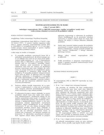 03/t. 31 PL Dziennik Urzędowy Unii Europejskiej 205 32001R0090 L 14/22 18.1.2001 DZIENNIK URZĘDOWY WSPÓLNOT EUROPEJSKICH ROZPORZĄDZENIE KOMISJI (WE) NR 90/2001 z dnia 17 stycznia 2001 r. zmieniające rozporządzenie (WE) nr 800/1999 ustanawiające wspólne szczegółowe zasady stosowania systemu refundacji wywozowych do produktów rolnych KOMISJA WSPÓLNOT EUROPEJSKICH, zgłoszenia wywozowego w odniesieniu do produktów rolnych kwalifikujących się do przyznania refundacji wywozowej w urzędzie celnym innym niż urząd celny właściwy dla miejsca, w którym dokonano załadunku produktów. uwzględniając Traktat ustanawiający Wspólnotę Europejską, uwzględniając rozporządzenie Rady (EWG) nr 1766/92 z dnia 30 czerwca 1992 r. w sprawie wspólnej organizacji rynku zbóż (1), ostatnio zmienione rozporządzeniem Komisji (WE) nr 1666/2000 (2), w szczególności jego art. 13 i 21 oraz odpowiednie przepisy innych rozporządzeń w sprawie wspólnej organizacji rynków produktów rolnych, (4) Należy także ustanowić odrębne przepisy dla produktów wywożonych w systemie towarów powracających przez Państwo Członkowskie, z którego pochodzi produkt, lub przez Państwo Członkowskie, z którego dokonano pierwszego wywozu. (5) Dlatego należy nr 800/1999. (6) Środki przewidziane w niniejszym rozporządzeniu są zgodne z opiniami wszystkich zainteresowanych komitetów zarządzających, a także mając na uwadze, co następuje: (1) (2) (3) (1) (2) (3) (4) W przypadku produktów wywożonych luzem lub w jednostkach niestandardowych, dla których przyjęte jest, że ich dokładna masa netto nie jest znana przed załadowaniem środka transportu, art. 5 ust. 6 rozporządzenia Komisji (WE) nr 800/1999 (3), zmienionego rozporządzeniem (WE) nr 1557/2000 (4), przewiduje zmniejszenie refundacji, jeżeli stwierdzono, że faktycznie załadowana masa netto jest mniejsza od określonego procentu oszacowanej masy netto. Jednakże aby zastosować ten przepis konieczne jest uwzględnienie ograniczeń istniejących w transporcie drogą morską lub śródlądową. W przypadku produktów transportowanych luzem może się okazać, że zgłoszone ilości nie zostały całkowicie załadowane, w szczególności w przypadku gdy osoba odpowiedzialna za środki transportu zdecydowała o wstrzymaniu załadunku z przyczyn technicznych lub, gdy inni eksporterzy załadowali więcej niż wcześniej przewidywano. Ponieważ niektóre kawałki wieprzowiny nie są umieszczane w opakowaniach i z istoty nie są znormalizowane, kategoria jednostek niestandardowych powinna zostać rozszerzona o tego rodzaju produkty. W odniesieniu do pojęcia „miejsce załadunku” na wywóz produktów rolnych może mieć wpływ wiele okoliczności administracyjnych i handlowych; dlatego nie jest możliwe ustanowienie jednej zasady i w związku z tym Państwa Członkowskie powinny mieć możliwość zdecydowania o najodpowiedniejszym miejscu w celu przeprowadzenia kontroli bezpośrednich wywożonych produktów rolnych kwalifikujących się do refundacji wywozowych. W tym celu, istnieją szczególnie dobre uzasadnienie określenia różnych miejsc załadunku w zależności od tego, czy towary są załadowane do kontenerów lub też odwrotnie, przewożone luzem, w workach lub w kartonach i nie ładowane następnie do kontenerów. W odpowiednio uzasadnionych przypadkach, organom celnym należy pozwolić na przyjęcie Dz.U. L Dz.U. L Dz.U. L Dz.U. L 181 z 1.7.1992, str. 21. 193 z 29.7.2000, str. 1. 102 z 17.4.1999, str. 11. 179 z 18.7.2000, str. 6. zmienić rozporządzenie (WE) PRZYJMUJE NINIEJSZE ROZPORZĄDZENIE: Artykuł 1 W rozporządzeniu (WE) nr 800/1999 wprowadza się następujące zmiany: 1. W art. 5 ust. 6 akapit trzeci otrzymuje brzmienie: „Nie przyznaje się refundacji dla ilości przekraczającej 110 % oszacowanej masy netto. Jeżeli masa faktycznie załadowana wynosi mniej niż 90 % oszacowanej masy netto, refundacja dla faktycznie załadowanej masy netto będzie obniżona o 10 % różnicy między refundacją odpowiadającą 90 % oszacowanej masy netto a refundacją odpowiadającą faktycznej masie netto. Jednakże w przypadku gdy transport odbywa się drogą morską lub śródlądową, a eksporter może dostarczyć dowód na piśmie od osoby odpowiedzialnej za środki transportu, że przeszkody specyficzne dla tego rodzaju środka transportu albo, alternatywnie przeładowanie przez innych eksporterów, uniemożliwiły załadowanie wszystkich jego towarów, refundacja jest wypłacana za faktycznie załadowaną masę netto. Przepisy niniejszego akapitu stosuje się, jeżeli eksporter skorzystał z lokalnej procedury odprawy celnej przewidzianej w art. 283 rozporządzenia (EWG) nr 2454/93 oraz jeżeli organy celne zezwoliły na dokonanie korekty w ewidencji, do której zostały wprowadzone wywożone produkty.” 2. W art. 5 ust. 6 akapit czwarty otrzymuje brzmienie: „Za jednostki niestandardowe uważa się żywe zwierzęta, półtusze, ćwierci, przodki, nogi, łopatki, boczki i schaby.” 206 PL Dziennik Urzędowy Unii Europejskiej 3. Artykuł 5 ust. 7 otrzymuje brzmienie: „7. Każda osoba dokonująca wywozu produktów w odniesieniu, do których ubiega się o przyznanie refundacji jest zobowiązana: a) złożyć zgłoszenie wywozowe w urzędzie celnym właściwym ze względu na miejsce, w którym produkty mają być załadowane do środków transportu; b) powiadomić urząd celny na przynajmniej 24 godziny przez rozpoczęciem czynności załadunkowych i określić przewidywany czas trwania załadunku. Właściwe organy mogą wyznaczyć inny termin niż 24 godziny. Za miejsce załadunku środków celu transportu produktów przeznaczonych na wywóz mogą zostać uznane: — w przypadku produktów wywożonych w kontenerach miejsce, w którym są one ładowane do kontenerów, — w przypadku produktów wywożonych luzem w workach, kartonach, pudełkach, butelkach itp. i niezaładowanych do kontenerów miejsce, w którym nastę