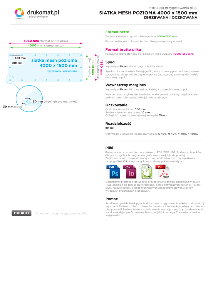 odiamconsent augait la feugiam Instrukcja przygotowania pliku commod eu facilissed tin et lumSIATKA MESH POZIOMA 4000 x 1500 mm drukomat.pl tanie drukowanie san henibh eum at dolut venit noZGRZEWANA I OCZKOWANA strud tat nulput prat, quamet lore te doloreet, vel dolesto dolenis Format netto Twoja siatka mesh będzie miała wymiary 4000x1500 mm. dit praessequate 4060 mm (format brutto pliku) 4000 mm (format netto) Format netto jest to format brutto pliku pomniejszony o spad. drukomat.pl tanie drukowanie 1560 mm zgrzewana i oczkowana 1500 mm siatka mesh pozioma 4000 x 1500 mm (format brutto pliku) 500 mm Format brutto pliku (format netto) Exero od te feu feugiamet ad do odiamconsent augait la feugiam commod eu facilissed tin et lumsan henibh eum at dolut venit nostrud tat nulput prat, quamet lore 500 mm te doloreet, vel dolesto dolenis dit praessequate Poprawnie przygotowany plik powinien mieć wymiary 4060x1560 mm. Spad Wynosi po 30 mm dla każdego z boków siatki. Spad to obszar dookoła Twojej grafiki, który usuwany jest podczas procesu zgrzewania. Wszystkie tła użyte w grafice (np. zdjęcia) powinny dochodzić do krawędzi pliku. Wewnętrzny margines Wynosi po 50 mm i liczony jest od każdej z czterech krawędzi pliku. Wewnętrzny margines jest to obszar, w którym nie powinny znajdować się żadne istotne informacje, takie jak teksty lub logo. 50 mm (wewnętrzny margines) 30 mm (spad) Oczkowanie Oczkowanie średnio co 500 mm. Średnica wewnętrzna oczek: 10 mm. Odległość oczek od zewnętrznej krawędzi: 15 mm. Rozdzielczość 80 dpi. Optymalne ustawienie koloru czarnego to C 40%, M 40%, Y 40%, K 100%. Pliki Preferowane przez nas formaty plików to PDF, TIFF, JPG. Szablony dla plików dla poszczególnych programów graficznych znajdują się poniżej. Znajdziesz w nich zwymiarowaną stronę, w której możesz zaprojektować swoją grafikę. Kliknij wybraną ikonę i załaduj plik na swój dysk. Dodatkowe informacje dotyczące przygotowania plików znajdziesz w dziale FAQ. Znajduje się tam sporo informacji i porad dotyczących czcionek, kolorystyki, rozdzielczości, a także technicznych zasad przygotowania plików w różnych programach graficznych. Pomoc DRUKUJ drukuj instrukcję przygotowania pliku Jeżeli masz jakiekolwiek pytania dotyczące przygotowania plików to skontaktuj się z nami. Możesz zrobić to dzwoniąc na naszą infolinię, korzystając z czatu lub pisząc e-mail. Możesz także zostawić nam informację z prośbą o oddzwonienie w odpowiadającym Ci terminie. Nasi specjaliści pomogą Ci rozwiać wszelkie wątpliwości. Instrukcja przygotowania pliku drukomat.pl tanie drukowanie SIATKA MESH PIONOWA 1500 x 4000 mm ZGRZEWANA I OCZKOWANA Format netto 1560 mm (format brutto pliku) Twoja siatka mesh będzie miała wymiary 1500x4000 mm. 1500 mm (format netto) Format netto jest to format brutto pliku pomniejszony o spad. drukomat.pl tanie drukowanie Format brutto pliku Poprawnie przygotowany plik powinien mieć wymiary 1560x4060 mm. Spad siatka mesh pionowa 1500 x 4000 mm Wynosi po 30 mm dla każdego z boków siatki. Spad to obszar dookoła Twojej grafiki, który usuwany jest podczas procesu zgrzewania. Wszystkie tła użyte w grafice (np. zdjęcia) powinny dochodzić do krawędzi pliku. zgrzewana i oczkowana Wewnętrzny margines 4060 mm (format brutto pliku) 4000 mm (format netto) Wynosi po 50 mm i liczony jest od każdej z czterech krawędzi pliku. Wewnętrzny margines jest to obszar, w którym nie powinny znajdować się Exero od te feu feugiamet ad informacje, do takie jak teksty lub logo. żadne istotne odiamconsent augait la feugiam Oczkowanie commod eu facilissed tin et lumOczkowanie średnio co 500 mm. Średnica wewnętrzna oczek: 10 mm. san henibh eum at dolutOdległość venitoczek nood zewnętrznej krawędzi: 15 mm. strud tat nulput prat, quamet lore Rozdzielczość 80 dpi. te doloreet, vel dolesto dolenis Optymalne ustawienie koloru czarnego to C 40%, M 40%, Y 40%, K 100%. dit praessequate Exero od te feu feugiamet ad do odiamconsent augait la feugiam commod eu facilissed tin et lumsan henibh eum at dolut venit nostrud tat nulput prat, quamet lore te doloreet, vel dolesto dolenis dit praessequate Pliki 500 mm Preferowane przez nas formaty plików to PDF, TIFF, JPG. Szablony dla plików dla poszczególnych programów graficznych znajdują się poniżej. Znajdziesz w nich zwymiarowaną stronę, w której możesz zaprojektować swoją grafikę. Kliknij wybraną ikonę i załaduj plik na swój dysk. 500 mm Dodatkowe informacje dotyczące przygotowania plików znajdziesz w dziale FAQ. Znajduje się tam sporo informacji i porad dotyczących czcionek, kolorystyki, rozdzielczości, a także technicznych zasad przygotowania plików w różnych programach graficznych. 50 mm (wewnętrzny margines) 30 mm (spad) DRUKUJ drukuj instrukcję przygotowania pliku Pomoc Jeżeli masz jakiekolwiek pytania dotyczące przygotowania plików to skontaktuj się z nami. Możesz zrobić to dzwoniąc na naszą infolinię, korzystając z czatu lub pisząc e-mail. Możesz także zostawić nam informację z prośbą o oddzwonienie w odpowiadającym Ci terminie. Nasi specjaliści pomogą Ci rozwiać wszelkie wątpliwości.