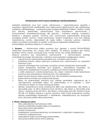 Załącznik Nr 2 do umowy WYMAGANIA DOTYCZĄCE MATERIAŁU SZKÓŁKARSKIEGO Materiał szkółkarski musi być czysty odmianowo i wyprodukowany zgodnie z zasadami agrotechniki szkółkarskiej oraz Zaleceniami jakościowymi dla ozdobnego materiału szkółkarskiego - wydanymi przez Związek Szkółkarzy Polskich. Rośliny muszą być zdrowe, zdrewniałe, zahartowane, oraz prawidłowo uformowane z zachowaniem charakterystycznego dla gatunku i odmiany pokroju, wysokości, średnicy i długości pędów. Powinny być zachowane odpowiednie proporcje pomiędzy pniem, koroną i bryłą korzeniową. System korzeniowy musi być dobrze wykształcony, zwarty, odpowiedni do wieku rośliny i sposobu uprawy. Materiał roślinny powinien pochodzić ze szkółki, w której był regularnie szkółkowany Zamawiający zamawia drzewa w I wyborze. 1. Drzewa – dostarczone rośliny powinny być zgodne z normą PN-R-67023(3) właściwie oznaczone, tzn. muszą mieć etykiety, na których podana jest nazwa łacińska, forma, wybór, wysokość pnia, numer normy, ew. liczbę szkółkowań. Drzewa powinny być prawidłowo uformowane z zachowaniem pokroju charakterystycznego dla gatunku i odmiany oraz posiadać następujące cechy: • pąk szczytowy przewodnika powinien być wyraźnie uformowany, • podstawa korony drzew piennych powinna być uformowana na wysokości minimum 2,5m • przyrost ostatniego roku powinien wyraźnie i prosto przedłuŜać przewodnik, • system korzeniowy powinien być skupiony i prawidłowo rozwinięty, na korzeniach szkieletowych powinny występować liczne korzenie drobne, • u roślin sadzonych z bryłą korzeniową, np. drzew i krzewów bryła korzeniowa powinna być prawidłowo uformowana i nie uszkodzona, • pędy boczne korony drzew powinny być równomiernie rozmieszczone, • przewodnik powinien być praktycznie prosty, • blizny na przewodniku powinny być dobrze zarośnięte, dopuszcza się 4 niecałkowicie zarośnięte blizny na przewodniku w II wyborze, u form naturalnych drzew to wady niedopuszczalne, • dobrze wykształcona bryła korzeniowa kilka razy szkółkowana, dla drzew o obwodzie pnia 14-18cm średnica bryły 55-65cm, dla drzew o obwodzie pnia 18cm+, średnica bryły 60-70cm, dla drzew o obwodzie pnia 30+ średnica bryły 90-120 cm Rośliny kopane z gruntu powinny mieć bryłę korzeniową zwartą, dobrze przerośniętą korzeniami z włośnikami, zabezpieczoną do transportu jutą i drucianą siatką nieocynkowaną. 2. Wady niedopuszczalne: • silne uszkodzenia mechaniczne roślin, • odrosty podkładki poniŜej miejsca szczepienia, • ślady Ŝerowania szkodników, • oznaki chorobowe, • zwiędnięcie i pomarszczenie kory na korzeniach i częściach naziemnych, • martwice i pęknięcia kory, • uszkodzenia pąka szczytowego przewodnika, • dwa przewodniki korony formy piennej, • • • uszkodzenie lub przesuszenie bryły korzeniowej, złe zrośnięte odmiany szczepionej z podkładką w przypadku egzemplarzy szczepionych objawy będące skutkiem niewłaściwego nawoŜenia i agrotechniki 3.Transport materiału roślinnego: a)koszt transportu wliczony jest w cenę materiału roślinnego, b)Dostawca własnym transportem dostarcza materiał roślinny i rozładowuje własnymi siłami na placu magazynowym zamawiającego (Posesja Palmiarni w Parku Miejskim w Legnicy ). c)Dostawca zabezpiecza rośliny w czasie transportu przed uszkodzeniami i niekorzystnymi warunkami atmosferycznymi. Rodzaj zamawianego towaru, gatunek, parametry, wymagania jakościowe oraz ilość zamawianego towaru została określona w Zestawieniu gatunków do obsadzeń w Parku Miejskim w Legnicy stanowiącym załącznik Nr 1 do umowy O konieczności dostarczenia partii towaru Zamawiający powiadomi Dostawcę telefonicznie lub za pośrednictwem faksu na numer podany w ofercie, a Dostawca zrealizuje to zamówienie niezwłocznie, nie dłuŜej jednak niŜ w czasie 2 dni przed wymaganą dostawą. Zamawiający określi ilość oraz gatunek drzew.