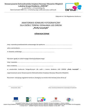Stowarzyszenie Dolnoodrzańska Inicjatyw Rozwoju Obszarów Wiejskich Lokalna Grupa Działania „DIROW” 74-100 Gryfino ul. Krasińskiego 85 Bank Zachodni WBK S.A. nr konta 64 1090 2268 0000 0001 1108 0026 Załącznik nr 2 do Regulaminu konkursu AMATORSKIE KONKURS FOTOGRAFICZNY DLA OSÓB Z TERENU DZIAŁANIA LGD DIROW „Perły turystyki” OŚWIADCZENIE Imię i nazwisko przedstawiciela ustawowego lub opiekuna: ……............................................................ adres zamieszkania: ……………………………………………………………………………………………………………………...…… nr dowodu osobistego…………………………………………………………….………………. Wyrażam zgodę na udział mojego dziecka/podopiecznego: Imię i nazwisko…………………………………………………………………………………………………………………………..………. data urodzenia………………………………………………………..……………………………. w amatorskim konkursie fotograficznym dla osób z terenu działania LGD DIROW „Perły turystyki” – organizowanym przez Stowarzyszenie Dolnoodrzańska Inicjatywa Rozwoju Obszarów Wiejskich. Rozumiem i akceptuję regulamin konkursu dostępny na stronie internetowej www.dirow.pl ……………………………….. ………………………………………………..…………… (miejscowość, data) (Imię i nazwisko przedstawiciela ustawowego lub opiekuna) Europejski Fundusz Rolny na rzecz Rozwoju Obszarów Wiejskich: Europa Inwestująca w obszary wiejskie Lokalna Grupa Działania: Stowarzyszenie Dolnoodrzańska Inicjatywa Rozwoju Obszarów Wiejskich współfinansowana jest ze środków Unii Europejskiej w ramach Osi 4 – LEADER Programu Rozwoju Obszarów Wiejskich na lata 2007 – 2013
