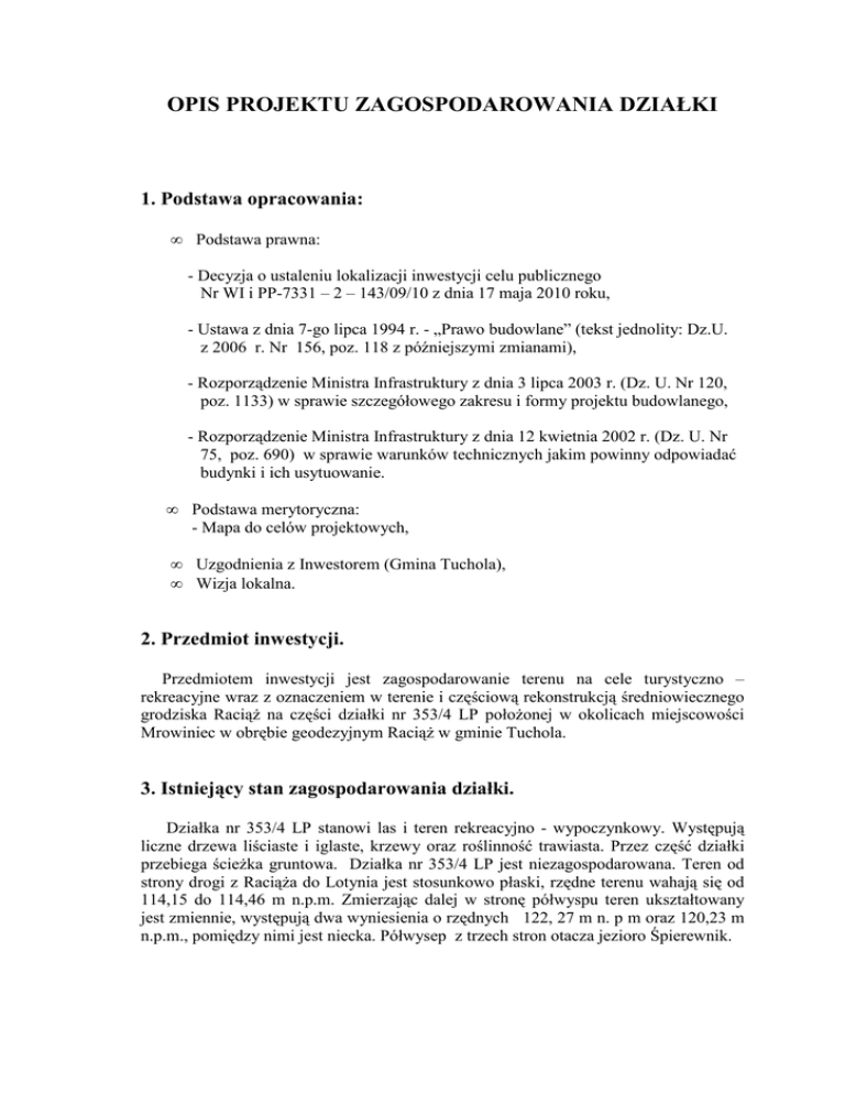 OPIS PROJEKTU ZAGOSPODAROWANIA DZIAŁKI 1. Podstawa opracowania: • Podstawa prawna: - Decyzja o ustaleniu lokalizacji inwestycji celu publicznego Nr WI i PP-7331 – 2 – 143/09/10 z dnia 17 maja 2010 roku, - Ustawa z dnia 7-go lipca 1994 r. - „Prawo budowlane” (tekst jednolity: Dz.U. z 2006 r. Nr 156, poz. 118 z późniejszymi zmianami), - Rozporządzenie Ministra Infrastruktury z dnia 3 lipca 2003 r. (Dz. U. Nr 120, poz. 1133) w sprawie szczegółowego zakresu i formy projektu budowlanego, - Rozporządzenie Ministra Infrastruktury z dnia 12 kwietnia 2002 r. (Dz. U. Nr 75, poz. 690) w sprawie warunków technicznych jakim powinny odpowiadać budynki i ich usytuowanie. • Podstawa merytoryczna: - Mapa do celów projektowych, • • Uzgodnienia z Inwestorem (Gmina Tuchola), Wizja lokalna. 2. Przedmiot inwestycji. Przedmiotem inwestycji jest zagospodarowanie terenu na cele turystyczno – rekreacyjne wraz z oznaczeniem w terenie i częściową rekonstrukcją średniowiecznego grodziska Raciąż na części działki nr 353/4 LP położonej w okolicach miejscowości Mrowiniec w obrębie geodezyjnym Raciąż w gminie Tuchola. 3. Istniejący stan zagospodarowania działki. Działka nr 353/4 LP stanowi las i teren rekreacyjno - wypoczynkowy. Występują liczne drzewa liściaste i iglaste, krzewy oraz roślinność trawiasta. Przez część działki przebiega ścieżka gruntowa. Działka nr 353/4 LP jest niezagospodarowana. Teren od strony drogi z Raciąża do Lotynia jest stosunkowo płaski, rzędne terenu wahają się od 114,15 do 114,46 m n.p.m. Zmierzając dalej w stronę półwyspu teren ukształtowany jest zmiennie, występują dwa wyniesienia o rzędnych 122, 27 m n. p m oraz 120,23 m n.p.m., pomiędzy nimi jest niecka. Półwysep z trzech stron otacza jezioro Śpierewnik. 4. Projektowane zagospodarowanie działki. • Lokalizacja inwestycji. Zagospodarowanie terenu na cele turystyczno – rekreacyjne wraz z oznaczeniem w terenie i częściową rekonstrukcją średniowiecznego grodziska Raciąż na części działki nr 353/4 LP położonej w okolicach miejscowości Mrowiniec w obrębie geodezyjnym Raciąż w gminie Tuchola usytuowano wg ustaleń zawartych w decyzji o ustaleniu lokalizacji inwestycji celu publicznego z dnia 17 maja 2010 roku Nr WI i PP. 7331- 2 – 143/09/10. • Komunikacja. Projektowany układ ścieżek żwirowych, schodów ziemno – żwirowych oraz pomostu i mostu zapewni swobodną komunikacje po terenie objętym opracowaniem. Wejście na przedmiotową działkę od strony drogi gminnej – trasa z Raciąża do Lotynia (działka nr 4/1 ). Zagospodarowanie działki umożliwia częściowe poruszanie się po terenie osób niepełnosprawnych. • Zieleń. Na terenie objętym opracowaniem nie planuje się zieleni ozdobnej. Istniejące naturalne zadrzewienie i zakrzewienie jest wystarczające. Na wzgórzu – wyniesieniu – miejscu właściwego grodziska przewiduje się karczowanie drzew – głównie olch – i krzewów w miejscach kolidujących z inwestycją. • Elementy grodziska średniowiecznego. Projektuje się częściową rekonstrukcję średniowiecznego grodziska Raciąż poprzez oznaczenie drewnianymi elementami lokalizacji poszczególnych zabudowań grodu z częściową rekonstrukcją ogrodzenia grodu wraz z bramą oraz oznaczenie cmentarzyska. • Elementy małej architektury. Projektuje się wzdłuż ścieżek spacerowych szutrowych umiejscowienie ławek drewnianych oraz kompletów ławek piknikowych ze stołem. Przy każdym stanowisku spoczynkowym projektuje się również śmietnik na odpady stałe. Wzdłuż ścieżek oraz na wzgórzu dawnego grodziska projektuje się umieszczenie tablic informacyjnych zawierajęcych opisy i dokumentacje zdjęciową średniowiecznego grodziska Raciąskiego. • Pomost, most oraz punkt widokowy W celu swobodnej komunikacji projektuje się pomost drewniany o szerokości 2,0 m i długości 65,0 m. Pomiędzy wyniesieniami – wzgórzami zaprojektowano most drewniany o szerokości 3,0 m x 15,0 m umożliwiający swobodne przemieszczanie się z części północnej terenu do części grodziska. W części północnej działki zaprojektowano punkt widokowy o parametrach 4,0 m x 8,0 m. Będzie to miejsce umożliwiające podziwianie otaczającego krajobrazu, jeziora Śpierewnik wraz z wyspami. • Ogrodzenie. Na wzgórzu grodziska przewiduje się tylko symboliczne ogrodzenie – częściowa rekonstrukcja bramy głównej oraz ułożenie bali drewnianych po obrysie wzgórza na drewnianych niskich 40 centymetrowych palikach. Analogicznie symboliczne ogrodzenie w zarysie cmentarzyska. • Oświetlenie terenu. Nie przewiduje się oświetlenia terenu. • Gromadzenie odpadów stałych Czasowym miejscem gromadzenia odpadów stałych będą pojedyncze kosze na śmieci przy każdej projektowanej ławce wzdłuż ścieżek spacerowych. Odpady będą regularnie wywożone przez koncesjonowaną firmę. 5. Zestawienie powierzchni. Powierzchnia projektowanego pomostu drewnianego Powierzchnia projektowanego mostu drewnianego Powierzchnia projektowanego punktu widokowego Powierzchnia projektowanych ścieżek szutrowych - 130,00 m2 - 45,00 m2 - 33,00 m2 - 1 830,00 m2 6. Informacja dotycząca wpisu do rejestru zabytków. Planowana inwestycja znajduje się w strefie „A” ochrony konserwatorskiej i wpisana jest do rejestru zabytków pod nr C/71 jako grodzisko średniowieczne. 7. Informacja dotycząca wpływu eksploatacji górniczej. Teren zamierzenia budowlanego nie znajduje się w granicach terenu górniczego, w związku z czym nie występują dane określające wpływ eksploatacji górniczej na działkę. 8. Dane dotyczące wpływu na środowisko (charakterystyka ekologiczna). Projektowane zagospodarowanie działki nie ma negatywnego wpływu na środowisko w tym powietrze, glebę, drzewostan, wody powierzchniowe i podziemne oraz nie wytwarza pola elektromagnetycznego, nie emituje pyłów, gazów i innych substancji mogących zagrażać otoczeni
