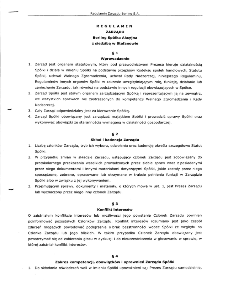 2. REGULAMIN zARzĄDU Ber|ing Spółka Akcyjna z siedzibą w