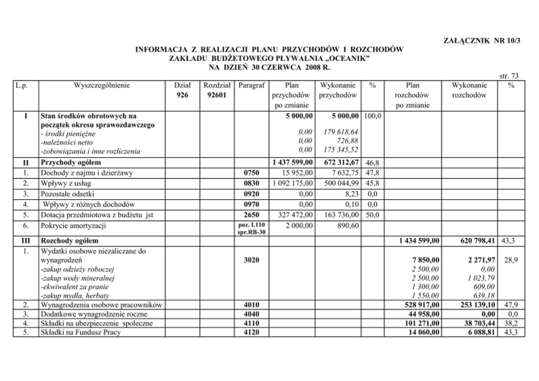 ZAŁĄCZNIK NR 10/3 INFORMACJA Z REALIZACJI PLANU PRZYCHODÓW I ROZCHODÓW ZAKŁADU BUDŻETOWEGO PŁYWALNIA „OCEANIK” NA DZIEŃ 30 CZERWCA 2008 R. L.p. I II 1. 2. 3. 4. 5. 6. III 1. 2. 3. 4. 5. Wyszczególnienie Stan środków obrotowych na początek okresu sprawozdawczego - środki pieniężne -należności netto -zobowiązania i inne rozliczenia Przychody ogółem Dochody z najmu i dzierżawy Wpływy z usług Pozostałe odsetki Wpływy z różnych dochodów Dotacja przedmiotowa z budżetu jst Pokrycie amortyzacji Rozchody ogółem Wydatki osobowe niezaliczane do wynagrodzeń -zakup odzieży roboczej -zakup wody mineralnej -ekwiwalent za pranie -zakup mydła, herbaty Wynagrodzenia osobowe pracowników Dodatkowe wynagrodzenie roczne Składki na ubezpieczenie społeczne Składki na Fundusz Pracy Dział 926 Rozdział 92601 Paragraf Plan Wykonanie % przychodów przychodów po zmianie 5 000,00 5 000,00 100,0 0,00 0,00 0,00 179 618,64 726,88 175 345,52 1 437 599,00 0750 15 952,00 0830 1 092 175,00 0920 0,00 0970 0,00 2650 327 472,00 poz. I.110 2 000,00 672 312,67 7 632,75 500 044,99 8,23 0,10 163 736,00 890,60 spr.RB-30 Plan rozchodów po zmianie 46,8 47,8 45,8 0,0 0,0 50,0 1 434 599,00 3020 4010 4040 4110 4120 Wykonanie rozchodów str. 73 % 7 850,00 2 500,00 2 500,00 1 300,00 1 550,00 528 917,00 44 958,00 101 271,00 14 060,00 620 798,41 43,3 2 271,97 0,00 1 023,79 609,00 639,18 253 139,10 0,00 38 703,44 6 088,81 28,9 47,9 0,0 38,2 43,3 str. 74 6. 7. 8. 9. 10. 11. 12. 13. Zakup materiałów i wyposażenia -środki i mat. czystości - ogólne -chemia basenowa; środki, mat. -materiały biurowe -lampy do solarium -wyposażenie -materiały techniczne -karty abonamentowe -środki do utrzymania zieleni -środki czystości basenowe -zaopatrzenie apteczki -techniczne części wymienne Zakup energii -energia elektryczna -energia cieplna (gaz) -zużycie wody Zakup usług remontowych Zakup usług zdrowotnych Zakup usług pozostałych -inne (przeglądy techniczne,serwisy) -zasoby kadrowe z zewnątrz -ścieki -wywóz nieczystości -badania wody (sanepid) -promocja, reklama -prenumerata Zakup usług dostępu do sieci Internet Opłaty z tytułu zakupu usług telekomunikacyjnych telefonii stacjonarnej Różne opłaty i składki (PZU) -ubezpieczenie PZU 4210 4260 4270 4280 4300 4350 4370 4430 109 500,00 13000,00 36 000,00 4 500,00 4 000,00 6 000,00 4 000,00 8 000,00 1 200,00 12 400,00 400,00 20 000,00 465 793,00 233 987,00 199 056,00 32 750,00 5 500,00 500,00 118 000,00 30 000,00 40 000,00 35 000,00 4 000,00 3 500,00 3 100,00 2 400,00 1 300,00 38 394,83 2 832,71 15 745,63 1 359,36 0,00 4 556,08 2 431,83 0,00 414,63 5 058,36 38,55 5 957,68 208 309,62 86 332,35 105 669,88 16 307,39 1 032,22 130,00 54 202,59 9 433,52 24 080,00 17 202,06 1 581,89 538,48 435,24 931,40 451,92 35,1 3 800,00 3 100,00 3 100,00 1 171,12 2 999,00 2 999,00 30,8 96,7 44,7 18,8 26,0 45,9 34,8 14. 15. 16. Odpisy na ZFŚS Podatek od nieruchomości Amortyzacja 17. Zakup materiałów papierniczych do sprzętu drukarskiego i urządzeń kserograficznych Zakup akcesoriów komputerowych, w tym programów i licencji Stan środków obrotowych na koniec okresu sprawozdawczego - środki pieniężne -należności netto -zobowiązania i inne rozliczenia Ogółem 18. VI. V. 4440 4480 poz. P. 100 21 600,00 450,00 2 000,00 10 426,20 405,00 890,60 48,3 90,0 44,5 4740 1 000,00 255,32 25,5 4750 5 000,00 8 000,00 1 926,67 56 514,26 38,5 0,00 0,00 0,00 110 311,47 17 752,90 71 550,11 1 442 599,00 677 312,67 1 442 599,00 Należności ogółem na dzień 30.06.2008 r. w tym wymagalne 17 752,90 zł 0,00 zł. Zobowiązania ogółem na dzień 30.06.2008 r. w tym wymagalne 71 550,11 zł. 0,00 zł 677 312,67 47,0 47,0