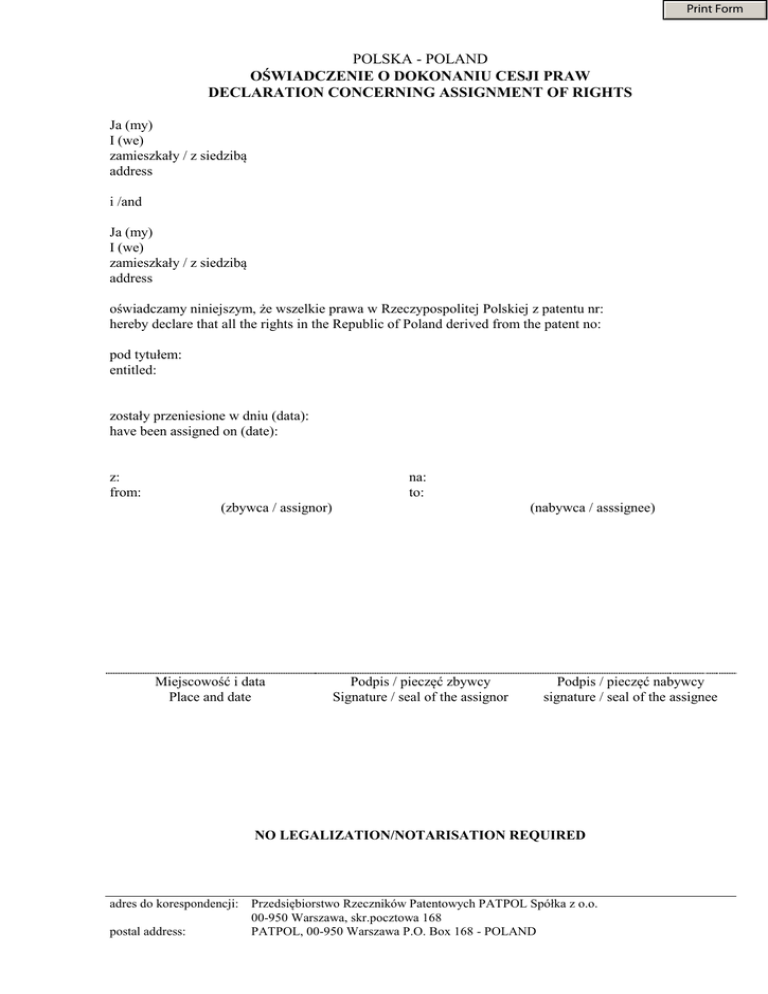 Print Form POLSKA - POLAND OŚWIADCZENIE O DOKONANIU CESJI PRAW DECLARATION CONCERNING ASSIGNMENT OF RIGHTS Ja (my) I (we) zamieszkały / z siedzibą address i /and Ja (my) I (we) zamieszkały / z siedzibą address oświadczamy niniejszym, że wszelkie prawa w Rzeczypospolitej Polskiej z patentu nr: hereby declare that all the rights in the Republic of Poland derived from the patent no: pod tytułem: entitled: zostały przeniesione w dniu (data): have been assigned on (date): z: from: na: to: (zbywca / assignor) Miejscowość i data Place and date (nabywca / asssignee) Podpis / pieczęć zbywcy Signature / seal of the assignor Podpis / pieczęć nabywcy signature / seal of the assignee NO LEGALIZATION/NOTARISATION REQUIRED adres do korespondencji: Przedsiębiorstwo Rzeczników Patentowych PATPOL Spółka z o.o. 00-950 Warszawa, skr.pocztowa 168 postal address: PATPOL, 00-950 Warszawa P.O. Box 168 - POLAND POLSKA - POLAND OŚWIADCZENIE O DOKONANIU CESJI PRAW DECLARATION CONCERNING ASSIGNMENT OF RIGHTS Ja (my) I (we) zamieszkały / z siedzibą address i /and Ja (my) I (we) zamieszkały / z siedzibą address oświadczamy niniejszym, że wszelkie prawa w Rzeczypospolitej Polskiej do zgłoszenia nr: hereby declare that all the rights in the Republic of Poland to the application no: pod tytułem: entitled: zgłoszonego w Urzędzie Patentowym RP dniu (data): filed with the Patent Office of the Republic of Poland on (date): w tym również prawo do korzystania z pierwszeństwa ze zgłoszenia(ń): including the priority right from the application(s): Nr / No kraj / country z dnia / of zostały przeniesione w dniu (data): have been assigned on (date): z: from: na: to: (zbywca / assignor) (nabywca / asssignee) i zgadzamy się na udzielenie prawa wyłącznego w Rzeczypospolitej Polskiej na rzecz wyżej wymienionego nabywcy. and agree that the exclusive right in the Republic of Poland is granted to the assignee mentioned above. Miejscowość i data Podpis / pieczęć zbywcy Podpis / pieczęć nabywcy Place and date Signature / seal of the assignor Signature / seal of the assignee NO LEGALIZATION/NOTARISATION REQUIRED adres do korespondencji: Przedsiębiorstwo Rzeczników Patentowych PATPOL Spółka z o.o. 00-950 Warszawa, skr.pocztowa 168 postal address: PATPOL, 00-950 Warszawa P.O. Box 168 - POLAND