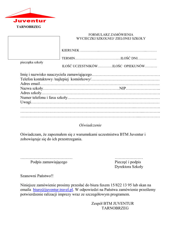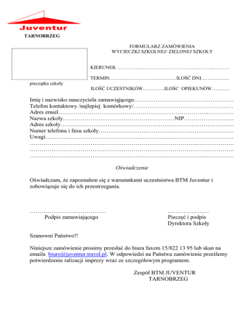 TARNOBRZEG FORMULARZ ZAMÓWIENIA WYCIECZKI SZKOLNEJ/ ZIELONEJ SZKOŁY KIERUNEK ……………..…………………………………...……… TERMIN……………………………….…ILOŚĆ DNI…………….. pieczątka szkoły ILOŚĆ UCZESTNIKÓW………….ILOŚC OPIEKUNÓW…….…. Imię i nazwisko nauczyciela zamawiąjącego…………………………………………… Telefon kontaktowy /najlepiej komórkowy/…………………………………………… Adres email…………………………………………………………………..…………. Nazwa szkoły…………………………………………………NIP…………………….. Adres szkoły………………………………………………………………………….…. Numer telefonu i faxu szkoły…………………………………………………………… Uwagi…………………………………………………………………………………… …………………………………………………………………………..………………. ………………………………………………………………………………..…………. ……………………………………………………………………………...…………… Oświadczenie Oświadczam, że zapoznałem się z warumnkami uczestnistwa BTM Juventur i zobowiązuje się do ich przestrzegania. ………………………………… Podpis zamawiającego ………………… Pieczęć i podpis Dyrektora Szkoły Szanowni Państwo!! Niniejsze zamówienie prosimy przesłać do biura faxem 15/822 13 95 lub skan na emaila [email protected]. W odpowiedzi na Państwa zamówienie prześlemy potwierdzenie ralizacji imprezy wraz ze szczegółowym programem. Zespół BTM JUVENTUR TARNOBRZEG