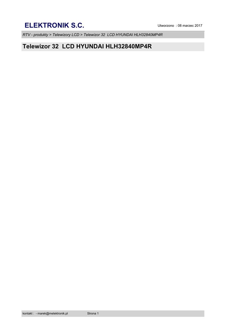 ELEKTRONIK S.C. Utworzono : 08 marzec 2017 RTV - produkty > Telewizory LCD > Telewizor 32 LCD HYUNDAI HLH32840MP4R Telewizor 32 LCD HYUNDAI HLH32840MP4R kontakt : - [email protected] Strona 1 ELEKTRONIK S.C. Utworzono : 08 marzec 2017 RTV - produkty > Telewizory LCD > Telewizor 32 LCD HYUNDAI HLH32840MP4R Telewizor 32 LCD HYUNDAI HLH32840MP4R Model : RTVHUNTLC0011 Telewizor 32 LCD HYUNDAI HLH32840MP4R Producent : Hyundai Gwarancja: 24 miesiące gwarancji fabrycznej Kod Producenta: HLH32840MP4 Format obrazu: 16 :9 Przekątna ekranu: 32 cale Nominalna rozdzielczość: 1366 x 768 HD Ready: Tak Full HD: Nie Jasność: 500 cd/m2 Kontrast Dynamiczny: 100000 :1 Czas reakcji matrycy: 5 ms Kąt widzenia w pionie: 178 Stopni Kąt widzenia w poziomie: 178 Stopni Tuner 1 (typ): DVB-T (Cyfrowy naziemny z obsługą MPEG-4) Tuner 2 (typ): DVB-C (Cyfrowy kablowy) Ilość pamięci programów: 100 szt. Obsługiwane systemy stereo: NICAM Głośniki: Wbudowane Możliwość podłączenia głośników zewnętrznych: Nie Gniazdo słuchawkowe (ilość): 1 szt. Gniazdo HDMI (ilość): 1 szt. Mozliwość podłączenia komputera PC: Tak Gniazdo D-Sub 15pin (ilość): 1 szt. Gniazdo SCART (Eurozłącze) (ilość): 1 szt. Gniazdo USB (ilość): 1 szt. Wejście Composite video RCA Cinch (ilość): 1 szt. Wejście audio RCA Cinch (ilość): 1 szt. Pilot: Tak Telegazeta: Tak Czytnik kart: Nie Wbudowany mikrofon: Nie Wbudowany twardy dysk: Nie Możliwość zawieszenia na ścianie: Tak (z dodatkowymi elementami nie wchodzącymi w skład wyposażenia) Kolor obudowy: czarny Wysokość (bez podstawy): 524 mm Wysokość: 570 mm Szerokość: 790 mm Głębokość: 190 mm Waga (bez opakowania): 9,6 kg Cena : 1.047,86 zł Brutto ( 858,90 zł Netto) Dostępność: Produkt dostępny w naszym sklepie od 23 czerwiec 2012 kontakt : - [email protected] Strona 2