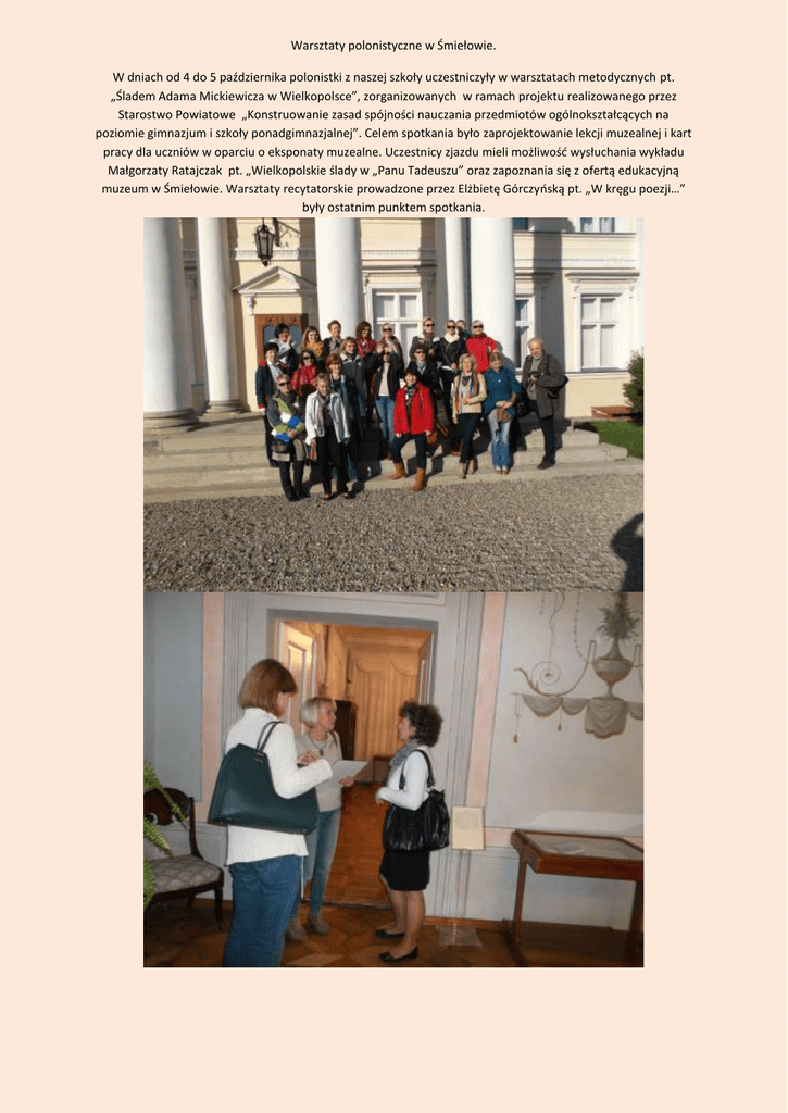 Warsztaty polonistyczne w Śmiełowie. W dniach od 4 do 5 października polonistki z naszej szkoły uczestniczyły w warsztatach metodycznych pt. „Śladem Adama Mickiewicza w Wielkopolsce”, zorganizowanych w ramach projektu realizowanego przez Starostwo Powiatowe „Konstruowanie zasad spójności nauczania przedmiotów ogólnokształcących na poziomie gimnazjum i szkoły ponadgimnazjalnej”. Celem spotkania było zaprojektowanie lekcji muzealnej i kart pracy dla uczniów w oparciu o eksponaty muzealne. Uczestnicy zjazdu mieli możliwość wysłuchania wykładu Małgorzaty Ratajczak pt. „Wielkopolskie ślady w „Panu Tadeuszu” oraz zapoznania się z ofertą edukacyjną muzeum w Śmiełowie. Warsztaty recytatorskie prowadzone przez Elżbietę Górczyńską pt. „W kręgu poezji…” były ostatnim punktem spotkania. KARTA PRACY DLA UCZNIÓW SZKÓŁ PONADGIMNAZJALNYCH –ZASADNICZA SZKOŁA ZAWODOWA LEKCJA MUZEALNA W MUZEUM A. MICKIEWICZA W ŚMIEŁOWIE Zadanie 1. Uzupełnij tekst dotyczący okoliczności przybycia A. Mickiewicza do Śmiełowa. Wyrazy do wstawienia: Wielkopolska, powstanie listopadowe, Śmiełów, Antonina Gorzeńska, Paryż. Na wieść o wybuchu …………………………………………………………………………… przebywający we Włoszech A. Mickiewicz pierwotnie planował dotrzeć do kraju drogą morską (z transportem broni z Londynu) i w tym celu zjawił się w …………………….... . Gdy okazało się to nierealne, postanowił przyjechać do objętej powstaniem Warszawy przez …………………………………………………………………………………………………. . W przekroczeniu granicy Królestwa miała pomóc poecie ………………………………….….. - ówczesna właścicielka pałacu w …………………………………………………………..… . Zadanie 2. Uzupełnij tabelę związaną z kobietami, które odegrały ważną rolę w życiu A. Mickiewicza. Skorzystaj z informacji podanych poniżej. Imię Maryla Nazwisko Kim była? Celina Barbara Anonina Henrietta Nazwisko: Mickiewiczowa, Wereszczakówna, Ankwicz, Szymanowska, Gorzeńska. Kim była? - córka słynnej pianistki, żona A. Mickiewicza, - wielka, niespełniona miłość poety, - kobieta, w której kochał się A. Mickiewicz podczas pobytu we Włoszech, - matka poety, - właścicielka pałacu w Śmiełowie. Zadanie 3. Odpowiedz na zadane pytania. 1. Wymień 5 postaci z utworów A. Mickiewicza uwiecznionych na obrazie T. A. Lisiewicza przedstawiającego poetę na łożu śmierci. ………………………………………………………………………………………… ………………………………………………………………………………………… 2. Podaj 3 nazwy miejscowości wielkopolskich, w jakich przebywał A. Mickiewicz. ………………………………………………………………………………………...… …………………………………………………………………………………………... 3. Wymień przynajmniej 4 języki, na które przetłumaczono „Pana Tadeusza”. ………………………………………………………………………………...………… …………………………………………………………………………………………... 4. Podaj miejsce i datę pierwszego polskiego wydania „Pana Tadeusza”. ………………………………………………………………………………………...… …………………………………………………………………………………………... 5. Wymień nazwisko człowieka, który wpłynął na życie i poglądy A. Mickiewicza w ostatnim okresie jego życia. ………………………………………………………………………………………… ………………………………………………………………………………………… Zadanie 4. Wybierz właściwą odpowiedź na postawione pytania. 1. Jaki był ulubiony napój A. Mickiewicza i jego kolegów podczas studenckich spotkań? a) woda, b) wino, c) mleko. 2. W którym roku i gdzie ukazało się pierwsze wydanie „Pana Tadeusza”? a) 1859 – Poznań, b) 1834 – Paryż, c) 1844 – Rzym. 3. Jakie drzewo zasadził A. Mickiewicz w śmiełowskim parku? a) dąb, b) topolę, c) buk. 4. Na jaką chorobę zmarł A. Mickiewicz? a) cholerę, b) grypę, c) dżumę. Zadanie 5. Rozwiąż krzyżówkę związaną tematycznie z „Panem Tadeuszem”. Hasło krzyżówki to nazwa gatunku, jaki reprezentuje to dzieło. 1. 2. 3. 4. 5. 6. 7. 1. Najsłynniejszy cymbalista 2. Słynna scena z utworu uwieczniona na obrazie w „pokoju Pana Tadeusza” 3. Postać bohaterki utworu - figurka z brązu w „pokoju Pana Tadeusza” 4. Imię klucznika 5. Rzeka wymieniona w „Inwokacji” 6. Grał na rogu 7. Nazwisko słynnego twórcy ilustracji do utworu (według nich wykonano cykl drzeworytów) Zadanie 6. Poniżej przedstawiona jest mapa Europy z czasów A. Mickiewicza. Nanieś na właściwe miejsca na mapie litery odpowiadające wydarzeniom z życia poety. Wydarzenia: a) narodziny poety w Nowogródku, b) studia w Wilnie, c) praca w charakterze nauczyciela w Kownie, d) wizyta w Wielkopolsce, e) praca w charakterze wykładowcy w paryskim College de France, f) śmierć w Stambule. Następnie przyporządkuj podane daty do odpowiednich wydarzeń. Daty: 1815-1819, 1855, 1840-1844, 1798, 1831, 1819-1823. a) ……………………………………………………………………………………………………………. b) ……………………………………………………………………………………………………………. c) …………………………………………………………………….……………………………………… d) ………………………………………………………………………………