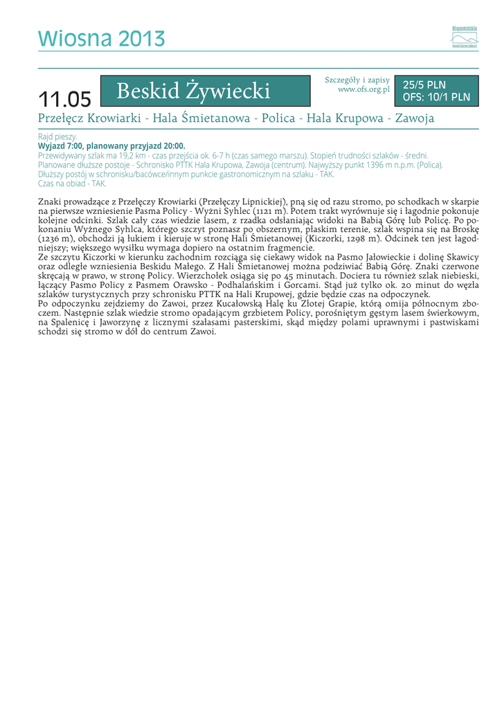 Wiosna 2013 _____________________________________________________________ 11.05 Beskid Żywiecki Szczegóły i zapisy www.ofs.org.pl 25/5 PLN OFS: 10/1 PLN Przełęcz Krowiarki - Hala Śmietanowa - Polica - Hala Krupowa - Zawoja Rajd pieszy. Wyjazd 7:00, planowany przyjazd 20:00. Przewidywany szlak ma 19,2 km - czas przejścia ok. 6-7 h (czas samego marszu). Stopień trudności szlaków - średni. Planowane dłuższe postoje - Schronisko PTTK Hala Krupowa, Zawoja (centrum). Najwyższy punkt 1396 m n.p.m. (Polica). Dłuższy postój w schronisku/bacówce/innym punkcie gastronomicznym na szlaku - TAK. Czas na obiad - TAK. Znaki prowadzące z Przełęczy Krowiarki (Przełęczy Lipnickiej), pną się od razu stromo, po schodkach w skarpie na pierwsze wzniesienie Pasma Policy - Wyżni Syhlec (1121 m). Potem trakt wyrównuje się i łagodnie pokonuje kolejne odcinki. Szlak cały czas wiedzie lasem, z rzadka odsłaniając widoki na Babią Górę lub Policę. Po pokonaniu Wyżnego Syhlca, którego szczyt poznasz po obszernym, płaskim terenie, szlak wspina się na Broskę (1236 m), obchodzi ją łukiem i kieruje w stronę Hali Śmietanowej (Kiczorki, 1298 m). Odcinek ten jest łagodniejszy; większego wysiłku wymaga dopiero na ostatnim fragmencie. Ze szczytu Kiczorki w kierunku zachodnim rozciąga się ciekawy widok na Pasmo Jałowieckie i dolinę Skawicy oraz odległe wzniesienia Beskidu Małego. Z Hali Śmietanowej można podziwiać Babią Górę. Znaki czerwone skręcają w prawo, w stronę Policy. Wierzchołek osiąga się po 45 minutach. Dociera tu również szlak niebieski, łączący Pasmo Policy z Pasmem Orawsko - Podhalańskim i Gorcami. Stąd już tylko ok. 20 minut do węzła szlaków turystycznych przy schronisku PTTK na Hali Krupowej, gdzie będzie czas na odpoczynek. Po odpoczynku zejdziemy do Zawoi, przez Kucałowską Halę ku Złotej Grapie, którą omija północnym zboczem. Następnie szlak wiedzie stromo opadającym grzbietem Policy, porośniętym gęstym lasem świerkowym, na Spalenicę i Jaworzynę z licznymi szałasami pasterskimi, skąd między polami uprawnymi i pastwiskami schodzi się stromo w dół do centrum Zawoi. Jesień 2013 _____________________________________________________________ 28.09 25/5 PLN Beskid Żywiecki 10/1 PLN Dolinki Krakowskie - Kobylańska i Będkowska, Jaskinia Nietoperzowa,OFS: Paczółtowice Szczegóły i zapisy www.ofs.org.pl Rajd pieszo-objazdowy. Wyjazd 8:00, planowany przyjazd 20:00. Przewidywane szlaki mają łącznie ok. 3-4 h (czas samego marszu). Stopień trudności szlaków - niski. Czas na obiad - TAK. Dolinki podkrakowskie, położone na Wyżynie Olkuskiej, to szereg jarów i dolin, którymi malowniczo płyną rzeki. Towarzyszą im słynne bramy skalne i majestatyczne wapienne skały oraz różne formy zjawisk krasowych. Teren objęto ochroną w ramach Parku Krajobrazowego Dolinki Krakowskie. W północnej części miejscowości Kobylany rozpoczyna się Dolina Kobylańska o długości 3-4 km. Od południa dolinę otwiera brama skalna. Za nią rozpoczyna się kręty, bezleśny wąwóz Nagaje. Po obu brzegach wznoszą się ciekawe formacje skalne o interesujących nazwach: Żabi Koń, Turnia Bodzio, Okręt Mnich, Wronia Baszta, Zębata Turnia, Zjazdowa Turnia. W turni Żabi Koń w 1914 r. postawiono kapliczkę Matki Boskiej. Wewnątrz wnęki skalnej znajduje się ołtarzyk z figurką Matki Boskiej. W części północnej stoki wąwozu porasta gęsty las. Głównie są to grądy oraz młodniki brzozowe i sosnowo-dębowe. Dolina jest jedną z najpiękniejszych na Jurze. Dolina Będkowska natomiast ciągnie się od przysiółka Łączki Kobylańskie aż do Jerzmanowic 8-kilometrowym łukiem. Wschodnie zbocze wąwozu jest częściowo skaliste, zachodnie zaś ma raczej łagodny charakter. To doskonałe miejsce na wędrówkę. Wchodząc w dolinę, mijamy Bramę Będkowską. Dalej na północ znajduje się jeszcze jedna skalna brama - Brama Piekielna, zwana też Czarcimi Wrotami. Na skale Sokolica odkryto ślady grodziska z XII-XIII w. Na północ od Sokolicy znajduje się grupa skał zwana Cmentarzysko. Przed nimi sterczy wysoki na 25 m ostaniec Iglica. Wędrując dalej szlakiem niebieskim, po lewej stronie mijamy dużą skałę o niepowtarzalnej nazwie - Dupa Słonia. Jaskinia Nietoperzowa (wstęp płatny) znajduje się w gminie Jerzmanowice-Przeginia. Nazwa jaskini pochodzi od znalezionych szczątków kopalnych i współcześnie żyjących nietoperzy. Jaskinia ma 306 m długości i jest jedną z największych jaskiń Jury Krakowskiej. Zawitamy również do Paczółtowic. Początki wsi datuje się na rok 1335, a głównym zabytkiem, niewątpliwie wartym uwagi, jest urokliwy, późnogotycki, drewniany kościół pw. Nawiedzenia Najświętszej Marii Panny. Świą-
