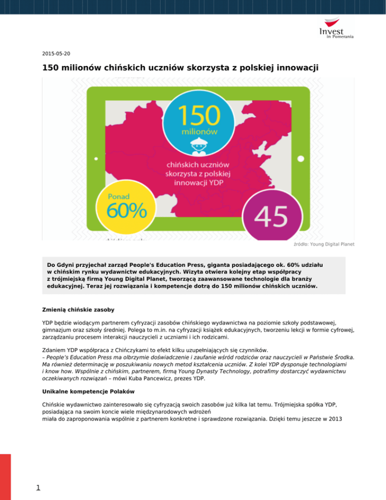 2015-05-20 150 milionów chińskich uczniów skorzysta z polskiej innowacji źródło: Young Digital Planet Do Gdyni przyjechał zarząd People's Education Press, giganta posiadającego ok. 60% udziału w chińskim rynku wydawnictw edukacyjnych. Wizyta otwiera kolejny etap współpracy z trójmiejską firmą Young Digital Planet, tworzącą zaawansowane technologie dla branży edukacyjnej. Teraz jej rozwiązania i kompetencje dotrą do 150 milionów chińskich uczniów. Zmienią chińskie zasoby YDP będzie wiodącym partnerem cyfryzacji zasobów chińskiego wydawnictwa na poziomie szkoły podstawowej, gimnazjum oraz szkoły średniej. Polega to m.in. na cyfryzacji książek edukacyjnych, tworzeniu lekcji w formie cyfrowej, zarządzaniu procesem interakcji nauczycieli z uczniami i ich rodzicami. Zdaniem YDP współpraca z Chińczykami to efekt kilku uzupełniających się czynników. – People’s Education Press ma olbrzymie doświadczenie i zaufanie wśród rodziców oraz nauczycieli w Państwie Środka. Ma również determinację w poszukiwaniu nowych metod kształcenia uczniów. Z kolei YDP dysponuje technologiami i know how. Wspólnie z chińskim, partnerem, firmą Young Dynasty Technology, potrafimy dostarczyć wydawnictwu oczekiwanych rozwiązań – mówi Kuba Pancewicz, prezes YDP. Unikalne kompetencje Polaków Chińskie wydawnictwo zainteresowało się cyfryzacją swoich zasobów już kilka lat temu. Trójmiejska spółka YDP, posiadająca na swoim koncie wiele międzynarodowych wdrożeń miała do zaproponowania wspólnie z partnerem konkretne i sprawdzone rozwiązania. Dzięki temu jeszcze w 2013 1 roku uruchomiono pierwsze projekty dla wydawnictwa PEP. Kompetencje YDP w tym zakresie otworzyły drogę do współpracy, dzięki której tworzone będą cyfrowe materiały do nauki dla 150 milionów uczniów. – Przede wszystkim mieliśmy dobre rozeznanie chińskiego rynku oraz solidnego lokalnego partnera. Wszystkie strony liczą na długotrwałą współpracę, która ma niezwykle obiecujące, silne merytoryczne fundamenty. Jestem pewien, że synergia przyniesie efekty wszystkim zaangażowanym w projekt podmiotom, wpływając pozytywnie na chiński rynek edukacyjny – uważa Kuba Pancewicz. Sukces po chińsku YDP wyposażyło już PEP w zaawansowane technologie edytorskie, które stanowią bazę do codziennej pracy dla pracowników chińskiego wydawnictwa do tworzenia własnych materiałów cyfrowych, specyficznych dla chińskiego rynku edukacyjnego. Wizyta zarządu PEP ma na celu m.in. zdefiniowanie potencjału dla nowych projektów. Dla YDP może to oznaczać nie tylko umocnienie roli partnera biznesowego, ale również jeszcze silniejsze uczestnictwo w transformacji tradycyjnej oferty chińskiego wydawnictwa poprzez wzbogacenie jej o treści i rozwiązania multimedialne. – PEP to firma, która posiada ponad 60% chińskiego rynku wydawniczego i wyznacza trendy i standardy w branży. Dzięki strategicznej współpracy z tak znaczącą firmą mamy szansę na zdobycie nowych kompetencji i współkształtowanie poziomu cyfrowej edukacji w Chinach. To dla nas ogromna szansa na rozwój i wzrost zatrudnienia – mówi Kuba Pancewicz, prezes Young Digital Planet Globalna ekspansja trójmiejskiej firmy Rynki międzynarodowe to kluczowe kierunki rozwoju YDP. Produkty YDP obecne są już na 45 rynkach, ale firmie zależało na rozwoju azjatyckich kontraktów ze względu na potencjał tamtejszego rynku. Chiny otwierają się na edukację cyfrową m.in. dzięki powszechnemu wykorzystywaniu przez dzieci smartfonów i tabletów. Ten sam trend widać już w wielu innych państwach azjatyckich. YDP zdobywając nowe doświadczenia w Państwie Środka stara się także o wykorzystywanie ich m.in. do poszerzenia swojej działalności w Ameryce Południowej i na Bliskim Wschodzie. Źródło: Young Digital Planet Young Digital Planet –od 1990 r. tworząca nowoczesną edukację poprzez zaawansowane technologie oraz produkty służące nauczycielom i uczniom. Oferta YDP to kursy multimedialne, technologie edytorskie i platformy edukacyjne oraz najnowsze rozwiązania z dziedziny specjalnych potrzeb edukacyjnych. Firma obecna jest już na niemal 50 rynkach świata, za swoje działania wyróżniona wieloma nagrodami m.in. Godłem Najwyższa Jakość Quality International, Medalem Europejskim czy Revere Award dla Księgi Trendów w Edukacji 2013/2014. People’s Education Press - to chińskie wydawnictwo pod bezpośrednim zwierzchnictwem Ministerstwa Edukacji Chińskiej Republiki Ludowej. PEP rozpoczął swoją działalność w grudniu 1950 roku i od tamtej pory odpowiada za badania, tworzenie, publikację oraz dystrybucję materiałów naukowych oraz podręczników dla szkół podstawowych i średnich. Wydawnictwo zatrudnia ok. 1500 pracowników i w swojej historii otrzymał m.in. National Book Award, China Book Award czy National Audiovisual Publication Award. 2