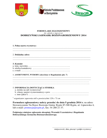 FORMULARZ ZGŁOSZENIOWY dot. udziału w imprezie pt. DOBRZYŃSKI JARMARK BOŻONARODZENIOWY 2014 1. Pełna nazwa wystawcy: ................................................................................................................................................. ................................................................................................................................................. 2. Dokładny adres ................................................................................................................................................ ................................................................................................................................................ 3. Kontakt a. imię, nazwisko………………………………………………….. b. telefon kontaktowy ……………………………………………. c. e-mail: ………………………………………………………….. 4. ASORTYMENT, WYROBY (określone w Regulaminie pkt. 7) ................................................................................................................................................. ................................................................................................................................................. …………………………………………………………………………………………………….. ……………………………………………………………………………………………………... 5. INFORMACJA DOTYCZĄCA STOISKA a. stoisko na sali wystawowej1 b. własny namiot wystawienniczy o pow. …………….……………………………… c. inne (jakie?) ………………………………………………………………………… 1 organizator zapewnia stół o powierzchni 120 x 75 cm Formularz zgłoszeniowy należy przesłać do dnia 5 grudnia 2014 r. na adres: Stowarzyszenie Na Rzecz Rozwoju Gminy Rypin 87-500 Rypin, ul. Lipnowska 4, lub e-mail: [email protected], fax: 54 280 21 37. Podpisując niniejsze zgłoszenie akceptuję Warunki Uczestnictwa i Regulamin Dobrzyńskiego Jarmarku Bożonarodzeniowego. ................................... …………............................ miejscowość, data, pieczęć i podpis wystawcy