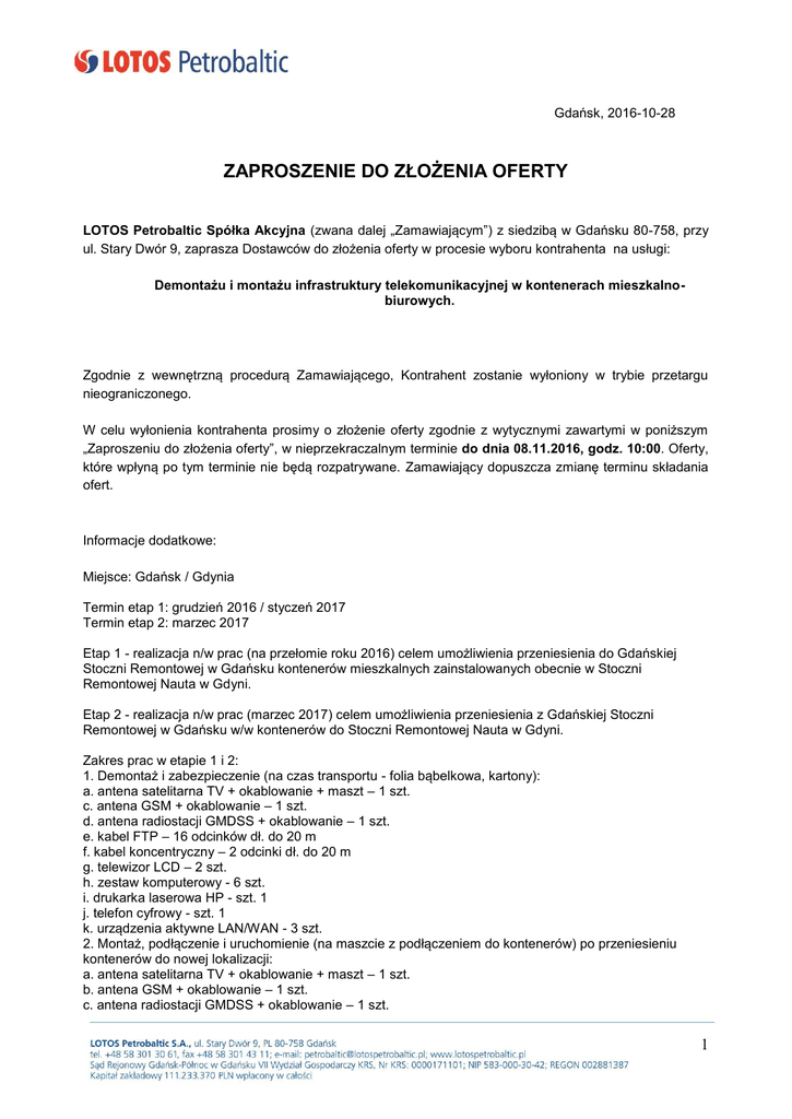 Gdańsk, 2016-10-28 ZAPROSZENIE DO ZŁOŻENIA OFERTY LOTOS Petrobaltic Spółka Akcyjna (zwana dalej „Zamawiającym”) z siedzibą w Gdańsku 80-758, przy ul. Stary Dwór 9, zaprasza Dostawców do złożenia oferty w procesie wyboru kontrahenta na usługi: Demontażu i montażu infrastruktury telekomunikacyjnej w kontenerach mieszkalnobiurowych. Zgodnie z wewnętrzną procedurą Zamawiającego, Kontrahent zostanie wyłoniony w trybie przetargu nieograniczonego. W celu wyłonienia kontrahenta prosimy o złożenie oferty zgodnie z wytycznymi zawartymi w poniższym „Zaproszeniu do złożenia oferty”, w nieprzekraczalnym terminie do dnia 08.11.2016, godz. 10:00. Oferty, które wpłyną po tym terminie nie będą rozpatrywane. Zamawiający dopuszcza zmianę terminu składania ofert. Informacje dodatkowe: Miejsce: Gdańsk / Gdynia Termin etap 1: grudzień 2016 / styczeń 2017 Termin etap 2: marzec 2017 Etap 1 - realizacja n/w prac (na przełomie roku 2016) celem umożliwienia przeniesienia do Gdańskiej Stoczni Remontowej w Gdańsku kontenerów mieszkalnych zainstalowanych obecnie w Stoczni Remontowej Nauta w Gdyni. Etap 2 - realizacja n/w prac (marzec 2017) celem umożliwienia przeniesienia z Gdańskiej Stoczni Remontowej w Gdańsku w/w kontenerów do Stoczni Remontowej Nauta w Gdyni. Zakres prac w etapie 1 i 2: 1. Demontaż i zabezpieczenie (na czas transportu - folia bąbelkowa, kartony): a. antena satelitarna TV + okablowanie + maszt – 1 szt. c. antena GSM + okablowanie – 1 szt. d. antena radiostacji GMDSS + okablowanie – 1 szt. e. kabel FTP – 16 odcinków dł. do 20 m f. kabel koncentryczny – 2 odcinki dł. do 20 m g. telewizor LCD – 2 szt. h. zestaw komputerowy - 6 szt. i. drukarka laserowa HP - szt. 1 j. telefon cyfrowy - szt. 1 k. urządzenia aktywne LAN/WAN - 3 szt. 2. Montaż, podłączenie i uruchomienie (na maszcie z podłączeniem do kontenerów) po przeniesieniu kontenerów do nowej lokalizacji: a. antena satelitarna TV + okablowanie + maszt – 1 szt. b. antena GSM + okablowanie – 1 szt. c. antena radiostacji GMDSS + okablowanie – 1 szt. 1 d. kabel FTP – 16 odcinków dł. do 20 m e. kabel koncentryczny – 2 odcinki dł. do 20 m f. telewizor LCD – 2 szt. g. zestaw komputerowy - 6 szt. h. drukarka laserowej HP k. urządzenia aktywne LAN/WAN - 3 szt. 3. Transport w/w sprzętu z/do w/w lokalizacji . Wymagania: 1. posiadanie niezbędnych kompetencji w zakresie wizowania TV anten satelitarnych oraz ustawień radiostacji GMDSS 2. ubezpieczenie w/w sprzętu na wypadek jego uszkodzenia podczas transportu, montażu / demontażu (wartość 30 000 PLN) Szczegółowe zaproszenie do złożenia oferty w załączniku do postępowania. Prosimy o zamieszczenie w Państwa ofercie następujących informacji i dokumentów: 1. Cena za wykonanie zlecenia uwzględniająca wszelkie niezbędne do poniesienia przez Wykonawcę prac koszty zwłaszcza (dojazd, oczekiwanie, ubezpieczenie, robociznę, opłaty licencyjne). 2. Warunki płatności - płatność po usłudze, oczekiwana 30 dni od daty otrzymania faktury przez Zamawiającego, 3. Kosztorys prac oraz wycenę poszczególnych etapów, 4. Numer konta bankowego wykonawcy na które będą regulowane należności. 5. Termin ważności oferty – min. 60 dni od upływu wyznaczonego terminu na składanie ofert. 6. Upoważnienie dla osób, które składają oświadczenia w imieniu oferenta, jeżeli wynika to z rejestru. 7. Składając ofertę oferent automatycznie akceptuję treść załączników CSR, Bezpieczeństwa i OWU znajdujących się na stronie: http://www.lotos.pl/344/grupa_kapitalowa/nasze_spolki/lotos_petrobaltic/do_pobrania 8. Wypełnienie formularza ofertowego – Załącznik nr 1 9. Przedłożenie referencji w zakresie zgodnym z przedmiotem zapytania. 10. Przedłożenie certyfikatów i uprawnień w zakresie zgodnym z przedmiotem zapytania. 11. Zamawiający zastrzega sobie prawo weryfikacji referencji i zobowiązuje Oferenta do przekazania kontaktów na wezwanie Zamawiającego, do osób prowadzących umowy ze strony Organizacji wystawiających referencje. 12. Składając ofertę zobowiązuje się przedłożyć polisy NW dla pracowników realizujących pracę na kwotę min. 10 000 PLN na pracownika oraz OC z tytułu prowadzonej działalności na min. 30 000 PLN. 13. Istnieje możliwość wykonania wizji lokalnej. Chęć wykonania wizji należy zgłosić do dnia 04.11.2016. UWAGA: 1. Zamawiający oczekuje, że Wykonawca zapozna się dokładnie z treścią niniejszego dokumentu. 2. Złożenie oferty będzie uznane za akceptację zasad prowadzonego postępowania opisanych w niniejszym dokumencie. 3. Przed sporządzeniem oferty możliwa jest konsultacja z osobą wskazaną w punkcie I podpunkt 1.2 lub inną osobą przez nią wyznaczoną. Przedstawiciele Wykonawcy przebywający na terenie i platformie Zamawiającego zobowiązani są do przestrzegania zasad Bezpieczeństwa. 4. Ceny podane w ofercie powinna być określona jednoznacznie i w sposób nie budzący wątpliwości (bez tzw. widełek cenowych). 2 5. I. 1. Ceny podane w walutach innych niż PLN zostaną na potrzeby porównania ofert przeliczone przez Zamawiającego na PLN według odpowiedniego kursu waluty obcej z tabeli A kursów średnich Narodowego Banku Polskiego opublikowanej w dniu otwarcia ofert. OSOBY UPRAWNIONE DO KONTAKTU I SPOSÓB POROZUMIEWANIA SIĘ: Osobami upoważnionymi do kontaktu z wykonawcami są: 1.1. W sprawach handlowych i formalnych związanych z niniejszym postępowaniem przetargowym: Adam Nazaruk 58 309 21 30; 512 782 115 e-mail: [email protected] 1.2. W sprawach technicznych dotyczących przedmiotu zamówienia: Piotr Duda 508 262 971; e-mail [email protected] Informacje będą udzielane w dni robocze, w godzinach 9ºº - 14ºº wyłącznie za pośrednictwem poczty elektronicznej w terminie do dnia 04.11.2016 zawsze z kopią do osoby wyszczególnionej w punkcie 1.1 lub za pośrednictwem platformy Logintrade. II. 1. KRYTERIUM WYBORU OFERTY: Opis 