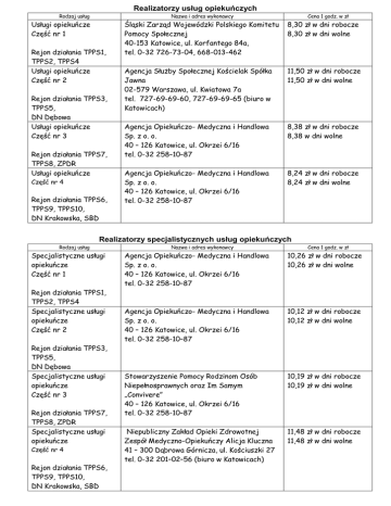 Realizatorzy usług opiekuńczych Rodzaj usług Nazwa i adres wykonawcy Usługi opiekuńcze Część nr 1 Rejon działania TPPS1, TPPS2, TPPS4 Usługi opiekuńcze Część nr 2 Rejon działania TPPS3, TPPS5, DN Dębowa Usługi opiekuńcze Część nr 3 Rejon działania TPPS7, TPPS8, ZPDR Usługi opiekuńcze Część nr 4 Rejon działania TPPS6, TPPS9, TPPS10, DN Krakowska, SBD Cena 1 godz. w zł Śląski Zarząd Wojewódzki Polskiego Komitetu Pomocy Społecznej 40-153 Katowice, ul. Korfantego 84a, tel. 0-32 726-73-04, 668-013-462 8,30 zł w dni robocze 8,30 zł w dni wolne Agencja Służby Społecznej Kościelak Spółka Jawna 02-579 Warszawa, ul. Kwiatowa 7a tel. 727-69-69-60, 727-69-69-65 (biuro w Katowicach) 11,50 zł w dni robocze 11,50 zł w dni wolne Agencja Opiekuńczo- Medyczna i Handlowa Sp. z o. o. 40 – 126 Katowice, ul. Okrzei 6/16 tel. 0-32 258–10–87 8,38 zł w dni robocze 8,38 w dni wolne Agencja Opiekuńczo- Medyczna i Handlowa Sp. z o. o. 40 – 126 Katowice, ul. Okrzei 6/16 tel. 0-32 258–10–87 8,24 zł w dni robocze 8,24 zł w dni wolne Realizatorzy specjalistycznych usług opiekuńczych Rodzaj usług Specjalistyczne usługi opiekuńcze Część nr 1 Rejon działania TPPS1, TPPS2, TPPS4 Specjalistyczne usługi opiekuńcze Część nr 2 Rejon działania TPPS3, TPPS5, DN Dębowa Specjalistyczne usługi opiekuńcze Część nr 3 Rejon działania TPPS7, TPPS8, ZPDR Specjalistyczne usługi opiekuńcze Część nr 4 Rejon działania TPPS6, TPPS9, TPPS10, DN Krakowska, SBD Nazwa i adres wykonawcy Cena 1 godz. w zł Agencja Opiekuńczo- Medyczna i Handlowa Sp. z o. o. 40 – 126 Katowice, ul. Okrzei 6/16 tel. 0-32 258-10–87 10,26 zł w dni robocze 10,26 zł w dni wolne Agencja Opiekuńczo- Medyczna i Handlowa Sp. z o. o. 40 – 126 Katowice, ul. Okrzei 6/16 tel. 0-32 258-10–87 10,12 zł w dni robocze 10,12 zł w dni wolne Stowarzyszenie Pomocy Rodzinom Osób Niepełnosprawnych oraz Im Samym „Convivere” 40 – 126 Katowice, ul. Okrzei 6/16 tel. 0-32 258-10–87 10,19 zł w dni robocze 10,19 zł w dni wolne Niepubliczny Zakład Opieki Zdrowotnej Zespół Medyczno-Opiekuńczy Alicja Kluczna 41 – 300 Dąbrowa Górnicza, ul. Kościuszki 27 tel. 0-32 201–02–56 (biuro w Katowicach) 11,48 zł w dni robocze 11,48 zł w dni wolne