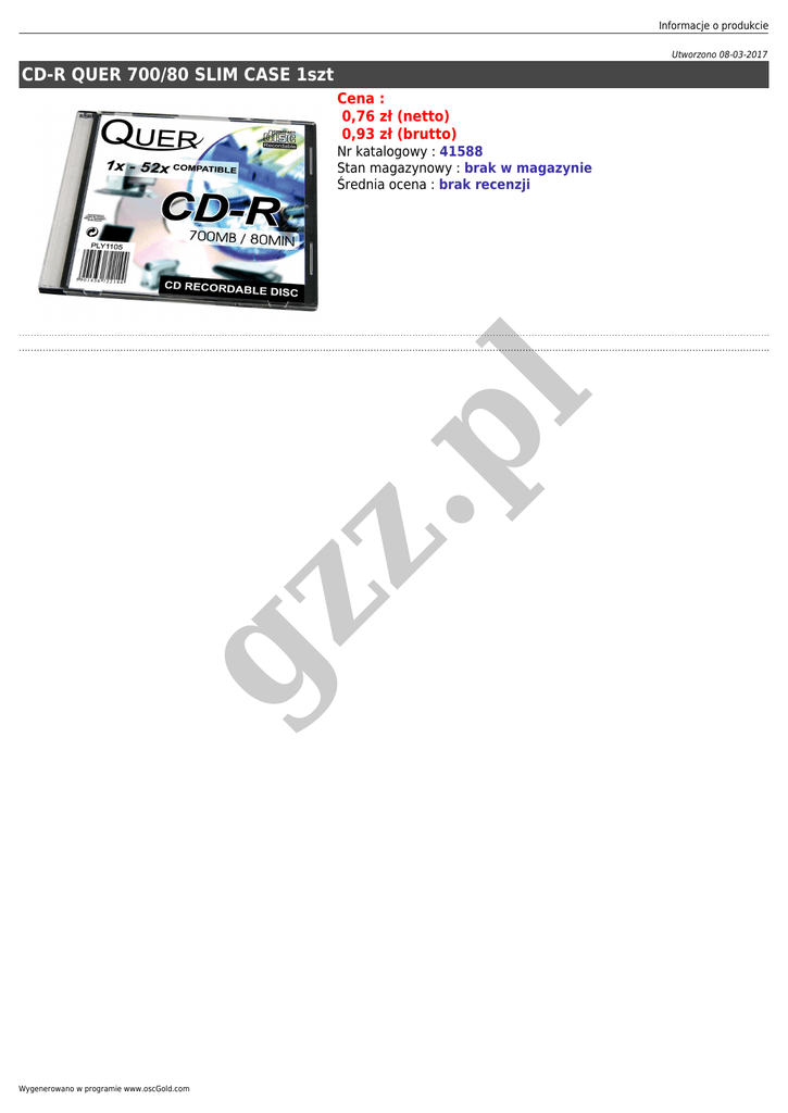 Informacje o produkcie Utworzono 08-03-2017 CD-R QUER 700/80 SLIM CASE 1szt Cena : 0,76 zł (netto) 0,93 zł (brutto) gz z .p l Nr katalogowy : 41588 Stan magazynowy : brak w magazynie Średnia ocena : brak recenzji Wygenerowano w programie www.oscGold.com