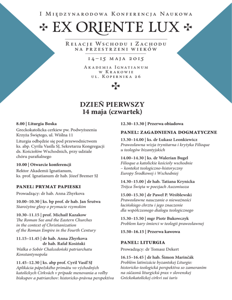 I M i ę d z y n a r o d o wa K o n f e r e n c j a N au k o wa C EX ORIENTE LUX C R e l a c j e W s c h o d u i Z a c h o d u n a p r z e s t r z e n i w i e k ó w 1 4–15 m a j a 2 0 15 A k ade m ia Ignatia num w Krakowie ul. Kopernika 26 C DZIEÑ PIERWSZY 14 maja (czwartek) 8.00 | Liturgia Boska Greckokatolicka cerkiew pw. Podwyższenia Krzyża Świętego, ul. Wiślna 11 Liturgia odbędzie się pod przewodnictwem ks. abp. Cyrila Vasiľa SJ, Sekretarza Kongregacji ds. Kościołów Wschodnich, przy udziale chóru parafialnego 10.00 | Otwarcie konferencji Rektor Akademii Ignatianum, ks. prof. Ignatianum dr hab. Józef Bremer SJ panel: prymat papieski Prowadzący: dr hab. Anna Zhyrkova 10.00–10.30 | ks. bp prof. dr hab. Jan Śrutwa Starożytne głosy o prymacie rzymskim 10.30–11.15 | prof. Michaił Kazakow The Roman See and the Eastern Churches in the context of Christianization of the Roman Empire in the Fourth Century 11.15–11.45 | dr hab. Anna Zhyrkova dr hab. Rafał Kosiński Walka o Sobór Chalcedoński patriarchatu Konstantynopola 11.45–12.30 | ks. abp prof. Cyril Vasiľ SJ Aplikácia pápežského primátu vo východných katolíckych Cirkvách v prípade menovania a voľby biskupov a patriarchov: historicko-právna perspektíva 12.30–13.30 | Przerwa obiadowa panel: zagadnienia dogmatyczne 13.30–14.00 | ks. dr Łukasz Leonkiewicz Prawosławna wizja trynitarna i krytyka Filioque u teologów bizantyjskich 14.00–14.30 | ks. dr Walerian Bugel Filioque a katolickie kościoły wschodnie – kontekst teologiczno-historyczny Europy Środkowej i Wschodniej 14.30–15.00 | dr hab. Tatiana Krynicka Trójca Święta w poezjach Auzoniusza 15.00–15.30 | dr Paweł P. Wróblewski Prawosławne nauczanie o nieważności łacińskiego chrztu i jego znaczenie dla współczesnego dialogu teologicznego 15.30–15.50 | mgr Piotr Bukowczyk Problem kary śmierci w teologii prawosławnej 15.50–16.15 | Przerwa kawowa panel: liturgia Prowadzący: dr Tomasz Dekert 16.15–16.45 | dr hab. Šimon Marinčák Problém latinizácie byzantskej Liturgie: historicko-teologická perspektíva so zameraním na súčasnú liturgickú prax v slovenskej Gréckokatolíckej cirkvi sui iuris 16.45–17.30 | dr Maciej Zachara Liturgia wschodnia, jej duch, znaczenie i wartość z punktu widzenia katolika obrządku rzymskiego 18.00–18.45 | dr Sotiris Mitraleksis A Return to Tradition? The Marriage of Bishops in the Orthodox Church 17.30–18.00 | dr Tomasz Dekert Problemy zachodniochrześcijańskiego kultu: Refleksje na kanwie charakterystyki ducha liturgii wschodniochrześcijańskiej pióra o. Roberta Tafta SJ 18.45 | Z akończenie pierwszego dnia konferencji Organizator, dr hab. Anna Zhyrkova 19.00 | Wyjście na kolację DZIEÑ DRUGI 15 maja (piątek) panel: filozofia 14.30–15.00 | Przerwa kawowa Prowadzący: prof. dr hab. Wasilij Szczukin panel: wybrane zagadnienia z życia kościołów wschodnich 9.30–10.00 | s. dr hab. Teresa Obolevitch Gieorgija Fłorowskiego krytyka rosyjskiego Renesansu religijno-filozoficznego 10.00–10.30 | prof. dr hab. Anna Raźny Tożsamość narodu rosyjskiego w ujęciu Fiodora Dostojewskiego 10.30–11.00 | dr Paweł Rojek Ikona i Eucharystia. Sakramentalna semiotyka Sergiusza Bułgakowa 11.00–11.20 | mgr Mirella Zajega Dostojewski w filozoficznej interpretacji M. Bierdiajewa 11.20–11.40 | mgr Kamil Szybalski Transformacja tożsamości kobiety rosyjskiej w GUŁagu 11.40–12.00 | mgr Maciej Banasik Duch rosyjski w ujęciu Mariana Zdziechowskiego 12.00–13.00 | Przerwa obiadowa panel dyskusyjny Prowadzący: prof. dr hab. Wasilij Szczukin 13.00–14.30 | Maxim Kantor dr Andrej Desnicki Inteligencja, Kościół, sumienie i współczesna Rosja 15.00–15.45 | dr Sotiris Mitraleksis The Liberation of the Church from the State in Greece – and the Administrative Fragmentation of Ecclesial Jurisdictions 15.45–16.15 | dr Leszek Zinkow Antoni Muchliński (1808–1877) – refleksje orientalisty o sytuacji Kościoła koptyjskiego w pierwszych dekadach XIX wieku 16.15–16.45 | dr Maciej Strutyński Idea narodu w myśli metropolity Andrzeja Szeptyckiego jako czynnik budowania tożsamości ukraińskiej 16.45–17.15 | dr hab. Marek Rembierz Relacje międzykulturowe Wschodu i Zachodu a kształtowanie się tożsamości słowackiej cerkwi greckokatolickiej – próba odczytania w kontekście teologii kultury i antropologii Jana Pawła II 17.15–17.35 | mgr Izabela Kozera mgr Radosław Sławomirski Prawosławie jako czynnik kształtujący tożsamość Słowian Wschodnich 17.35 | Zakończenie konferencji Dziekan Wydziału Filozoficznego Akademii Ignatianum, ks. prof. Ignatianum dr hab. Tomasz Homa SJ 18.00 | Liturgia Boska Greckokatolicka cerkiew pw. Podwyższenia Krzyża Świętego, ul. Wiślna 11 Liturgia odbędzie się pod przewodnictwem ks. abp. Jana Martyniaka, metropolity przemysko-warszawskiego obrządku bizantyńsko-ukraińskiego, przy udziale chóru parafialnego