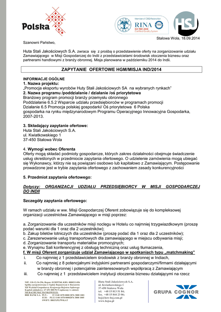 Stalowa Wola, 18.09.2014 Szanowni Państwo, Huta Stali Jakościowych S.A. zwraca się z prośbą o przedstawienie oferty na zorganizowanie udziału Zamawiającego w Misji Gospodarczej do Indii z przedstawicielami środowisk otoczenia biznesu oraz partnerami handlowymi z branży obronnej. Misja planowana w październiku 2014 do Indii. ZAPYTANIE OFERTOWE HGM/MISJA IND/2014 INFORMACJE OGÓLNE 1. Nazwa projektu: „Promocja eksportu wyrobów Huty Stali Jakościowych SA na wybranych rynkach” 2. Nazwa programu /poddziałanie / działanie /oś priorytetowa Branżowy program promocji branży przemysłu obronnego Poddziałanie 6.5.2 Wsparcie udziału przedsiębiorców w programach promocji Działanie 6.5 Promocja polskiej gospodarki/ Oś priorytetowa 6 Polska gospodarka na rynku międzynarodowym Programu Operacyjnego Innowacyjna Gospodarka, 2007-2013. 3. Składający zapytanie ofertowe: Huta Stali Jakościowych S.A. ul. Kwiatkowskiego 1 37-450 Stalowa Wola 4. Wymogi wobec Oferenta Oferty mogą składać podmioty gospodarcze, których zakres działalności obejmuje świadczenie usług określonych w przedmiocie zapytania ofertowego. O udzielenie zamówienia mogą ubiegać się Wykonawcy, którzy nie są powiązani osobowo lub kapitałowo z Zamawiającym. Postępowanie prowadzone jest w trybie zapytania ofertowego z zachowaniem zasady konkurencyjności 5. Przedmiot zapytania ofertowego: Dotyczy: DO INDII ORGANIZACJI UDZIAŁU PRZEDSIĘBIORCY W MISJI GOSPODARCZEJ Szczegóły zapytania ofertowego: W ramach udziału w ww. Misji Gospodarczej Oferent zobowiązuje się do kompleksowej organizacji uczestnictwa Zamawiającego w misji poprzez: a. Zorganizowanie dla uczestników misji noclegu w Hotelu co najmniej trzygwiazdkowym (proszę podać warunki dla 1 oraz dla 2 uczestników); b. Zakup biletów lotniczych dla uczestników (proszę podać dla 1 oraz dla 2 uczestników); c. Zarezerwowanie usług transportowych dla zamawiającego w miejscu odbywania misji; d. Zorganizowanie transportu materiałów promocyjnych; e. Wynajmu Sali konferencyjnej z obsługą techniczną oraz usług tłumaczenia, f. W misji Oferent zorganizuje udział Zamawiającego w spotkaniach typu „matchmaking” i. Co najmniej z 1 przedstawicielem środowisk z branży obronnej w Indiach, ii. Co najmniej z 8 potencjalnymi indyjskimi partnerami gospodarczymi/firmami działającymi w branży obronnej i potencjalnie zainteresowanych współpracą z Zamawiającym iii. Co najmniej z 1 przedstawicielem instytucji otoczenia biznesu działającymi na rzecz NIP: 118-12-34-296, Regon: 012859760, KRS: 0000211496 Spółka zarejestrowana w Sądzie Rejonowym w Rzeszowie XII Wydział Gospodarczy Krajowego Rejestru Sądowego Kapitał zakładowy: 47 691 000 PLN (opłacony w całości) NR RACHUNKU BANKOWEGO: BRE BANK S.A. PLN 23 1140 1078 0000 2876 3800 1001 EUR - PL12 1140 1078 00002876 3800 1005 SWIFT: BREXPLPWKAT Huta Stali Jakościowych S.A. ul. Kwiatkowskiego 1 37-450 Stalowa Wola tel. +48 15 813 51 84; fax. +48 15 844 23 06; [email protected] www.hsjsa.pl iv. branży zbrojeniowej w Indiach oraz Co najmniej 1 ze znanym ekspertem zajmującym się branżą obronną. 6. Sposób przygotowania oferty: Wykonawca powinien sporządzić ofertę zawierającą: Nazwa i adres oferenta, Datę sporządzenia Opis oferowanego produktu/usługa, Cena jednostkowa netto i brutto , Cena Całkowita , Termin ważności oferty Oferta powinna być sporządzona na papierze firmowym lub być opatrzona pieczątką firmową oraz być opatrzona podpisem oferenta i zawierać informacje o ważności oferty oraz podana cena całkowita. Przesłana and adres [email protected] lub na fax +48158442306 lub na adres pocztowy siedziby firmy. Termin składania ofert: Oferty można składać do dn. 30-09-14 do godz. 9.00 Załączniki: 1. – kosztorys Misji Załączniki 2 . – plan misji Załącznik 3. - wykaz proponowanych partnerów gospodarczych i firm indyjskich 7. Procedura Wyboru Wykonawców: I. Formalne: Kompletność oferty: Minimalne wymagania dotyczące sposobu przygotowania oferty: wypełnienie i złożenie wszystkich wymaganych załączników (1,2,3) oceniana na zasadzie spełnia/nie spełnia. II. Merytoryczne: Kryterium Waga (%) Cena całkowita (brutto) 70 Jakość 30 Cena: 0-70 pkt. waga procentowa kryterium – 70 % Cena brutto oferty najniższej ------------------------------------ x 100 x 70% (waga kryterium) = ilość punktów Cena brutto oferty badanej Jakość : ocena oferty pod względem proponowanego harmonogramu spotkań typu „matchmaking”, i złożonych Załączników. Członkowie Komisji dokonają indywidualnie oceny koncepcji w skali od 0 do 10 pkt a następnie według następującego wzoru: LD = DO (ocena badanej oferty proj)/DMAX (najwyższa ocena) * 100pkt * 30% Ilości punktów za poszczególne kryteria zostaną zsumowane i będą stanowić końcową ocenę Oferty za najkorzystniejszą zostanie uznana oferta, która uzyska najwyższą końcową ocenę oferty. Zamawiający dopuszcza wyłącznie składanie ofert obejmujących wykonanie całej usługi. Kryterium, jakie będzie branże pod uwagę przy obiektywnym porównaniu ofert: 8. Dodatkowe informacje: 1. Oferty, które wpłyną po terminie lub nie będą zawierały CENY nie będą brane pod uwagę przy ocenie. 2. Zamawiający zastrzega sobie prawo do wystąpienia do Oferenta z zapytaniem dotyczącym dodatkowych informacji, dokumentów lub wyjaśnień. Oferent powinien zapoznać się z profilem działalności firmy zanim złoży ofertę. 3. Po wyborze oferty Zamawiający zastrzega sobie prawo negocjacji warunków zamówienia. 4. Zleceniodawca zastrzega sobie prawo do unieważnienia postępowania zakupowego na każdym etapie bez podania przyczyny. 5. Wybór najkorzystniejszej oferty dokonywany jest w oparciu o ustalone w zapytaniu ofertowym kryteria wskazane w pk. 7 i jest dokumentowany protokołem. Informacja o wyniku postępowania zostanie przesłana do każdego Wykonawcy, który złożył ofertę. 6. Pod