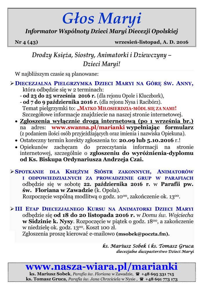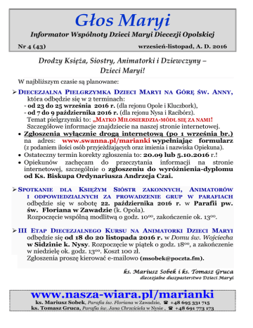 Głos Maryi Informator Wspólnoty Dzieci Maryi Diecezji Opolskiej Nr 4 (43) wrzesień-listopad, A. D. 2016 Drodzy Księża, Siostry, Animatorki i Dziewczyny – Dzieci Maryi! W najbliższym czasie są planowane: DIECEZJALNA PIELGRZYMKA DZIECI MARYI NA GÓRĘ ŚW. ANNY, która odbędzie się w 2 terminach: - od 23 do 25 września 2016 r. (dla rejonu Opole i Kluczbork), - od 7 do 9 października 2016 r. (dla rejonu Nysa i Racibórz). Temat pielgrzymki to: „MATKO MIŁOSIERDZIA-MÓDL SIĘ ZA NAMI ! Szczegółowe informacje znajdziecie na naszej stronie internetowej. Zgłoszenia wyłącznie drogą internetową (po 1 września br.) na adres: www.swanna.pl/marianki wypełniając formularz (z podaniem ilości osób przyjeżdżających oraz imienia i nazwiska Opiekuna). Ostateczny termin korekty zgłoszenia to: 20.o9 lub 5.10.2016 r.! Opiekunów zachęcam do przeczytania informacji na stronie internetowej, szczególnie o zgłoszeniu do wyróżnienia-dyplomu od Ks. Biskupa Ordynariusza Andrzeja Czai. SPOTKANIE DLA KSIĘŻYM SIÓSTR ZAKONNYCH, ANIMATORÓW I ODPOWIEDZIALNYCH ZA PROWADZENIE GRUP W PARAFIACH odbędzie się w sobotę 22. października 2016 r. w Parafii pw. św. Floriana w Zawadzie (k. Opola). Rozpoczęcie wspólną modlitwą o godz. 1000, zakończenie ok. 1300. III ETAP DIECEZJALNEGO KURSU NA ANIMATORKI DZIECI MARYI odbędzie się od 18 do 20 listopada 2016 r. w Domu św. Wojciecha w Sidzinie k. Nysy. Rozpoczęcie w piątek o godz. 1800, a zakończenie w niedzielę ok. godz. 1300. Koszt 100 zł. Zgłoszenia proszę kierować e-mailowo ([email protected]). ks. Mariusz Sobek i ks. Tomasz Gruca diecezjalne duszpasterstwo Dzieci Maryi www.nasza-wiara.pl/marianki ks. Mariusz Sobek, Parafia św. Floriana w Zawadzie, +48 695 331 715 ks. Tomasz Gruca, Parafia św. Jana Chrzciciela w Nysie , +48 691 773 173 DIECEZJALNA PIELGRZYMKA DZIECI MARYI na Górę św. Anny „MATKO MIŁOSIERDZIA - MÓDL SIĘ ZA NAMI”! 23-25 września; 7-9 października A.D. 2016 PIĄTEK 18.00 Powitanie w Domu Pielgrzyma 18.30 Kolacja 19.00 Okazja do Sakramentu Pokuty i Pojednania oraz przygotowanie do Eucharystii 20.00 EUCHARYSTIA w Domu Pielgrzyma zakończona Apelem Jasnogórskim (o. Ignacy OFM, dyrektor Domu Pielgrzyma na Górze św. Anny) 21.15 Przedstawienie- „Błogosławieni miłosierni” 23.00 Cisza nocna 7.30 8.00 8.30 9.30 10.30 11.00 SOBOTA Pobudka Godzinki ku czci NMP Śniadanie Modlitwa Różańcowa (przy grocie) Przygotowanie do Eucharystii-okazja do Sakramentu Pokuty EUCHARYSTIA pod przewodnictwem ks. Biskupa w Bazylice św. Anny z wręczeniem dyplomów-wyróżnień dla Dzieci Maryi 13.00 Obiad Czas wolny 15.00 Koronka do Miłosierdzia Bożego Spotkania w grupach wiekowych Film 18.30 Kolacja 19.30 Pogodny wieczór… 21.30 Modlitwy wieczorne 22.00 Cisza nocna NIEDZIELA-DZIEŃ PAŃSKI 7.30 Pobudka 8.00 Modlitwy poranne 8.30 Śniadanie (+pakowanie się) 10.00 EUCHARYSTIA w Domu Pielgrzyma 11.30 Wyjazd (powrót) do domów ************** Zgłoszenia: Dom Pielgrzyma- www.swanna.pl/marianki Proszę przywieźć ze sobą: śpiwory, modlitewnik Droga do nieba oraz stroje mariańskie, sztandary…i dobry humor Koszt pobytu: 60 zł (pobyt + znaczek pielgrzymkowy + śpiewnik + cele organizacyjne) Zapraszany do udziału w pielgrzymce także Opiekunów Dzieci Maryi! UWAGA!!! Księży lub Opiekunów odpowiedzianych za Dzieci Maryi proszę zgłoszenie do wyróżnienia-dyplomu od ks. Biskupa tylko jednej dziewczyny z Parafii (od klasy I gimnazjum - niebieski medalik) do 19 września 2016 r. (na dwa terminy) /z zaznaczeniem, na który termin wyróżniona Marianka przyjedzie/ na adres [email protected] lub +48 695 331 715 (po 1930). Pozdrawiam Wszystkich… i do zobaczenia na Górze św. Anny! ks. Mariusz Sobek, diecezjalny duszpasterz Dzieci Maryi