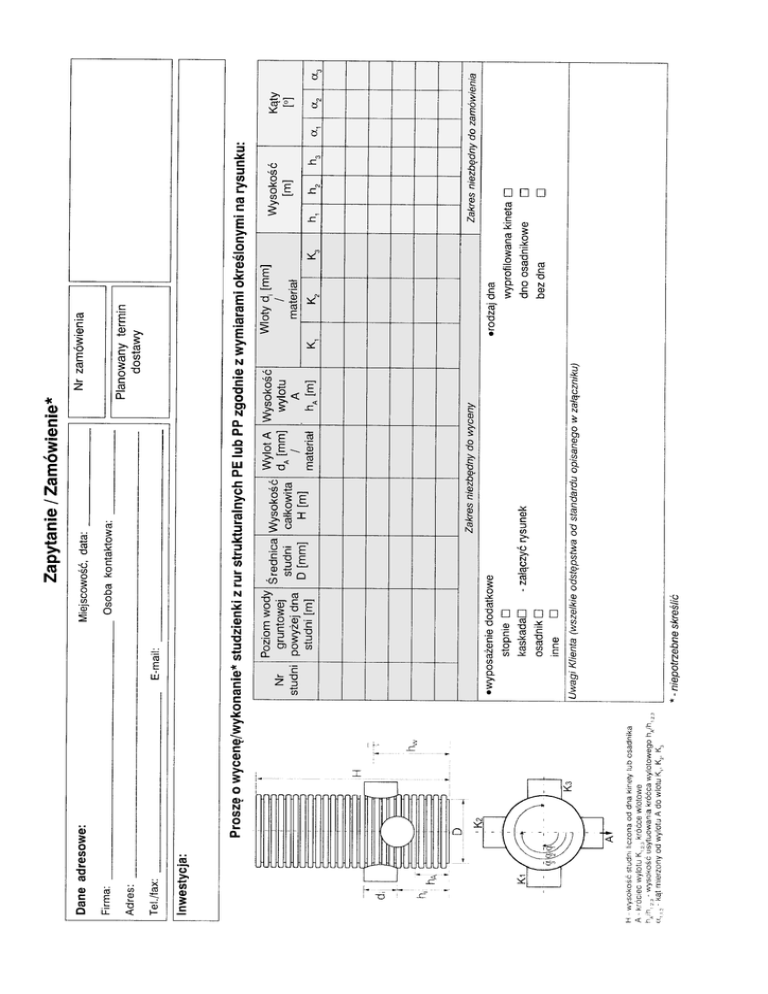 POLYTEAM Sp. z o.o. Strzelce 13, 56-410 Dobroszyce, tel. (071) 314 19 36 lub 38, fax. (071) 314 19 37, [email protected] K A T A L O G P R O D U K T Ó W Informacje dodatkowe do formularza 1. Decyzję dotyczącą materiału studni PE czy PP podejmuje wykonawca studni w oparciu o analizę podłączeń. 2. Standartowe średnice studni to: 400, 500, 600, 800, 1000 i 1200 mm. Możliwe są inne średnice studni. Wykonawca studni może zaproponować zbliżoną średnicę standartową lub w przypadku wymiarów niestandardowych dłuższy termin realizacji zamówienia. 3. Studnie o średnicy DN 1000 mm oraz o średnicy 800 DN<1000 mm i głębokości do 3.0 m traktowane są jako studnie włazowe i wyposażone są w stopnie złazowe. 4. Studnie z kinetami wyprofilowanymi do montażu na sieci kanalizacji grawitacyjnej z rur strukturalnych wykonuje się: - przy średnicach kanału DN 300 mm z rur strukturalnych z obustronnym wyprowadzeniem bosych końców rury strukturalnej; - przy średnicach kanału DN < 300 mm z rury ciœnieniowej PE (PP) z wyprowadzeniem króćców z przyspawanymi kielichami do połączenia rur strukturalnych. 5. Studnie z kinetami wyprofilowanymi przeznaczonymi do montażu na sieci kanalizacji grawitacyjnej z rur gładkościennych wykonuje się z wyprowadzeniem bosych końców z rury ciśnieniowej PE (SDR 17,6 – 21). W stosunku do króćców podłączeniowych do studni powyżej kinety (na ściance rury wznoszącej) stosuje się następujące zasady: ZASTOSOWANIE SPOSÓB WYKOŃCZENIA Do podłączenia kanalizacji grawitacyjnej lub drenażu Kielich rury strukturalnej Do podłączenia kanalizacji grawitacyjnej z rur Bosy koniec rury ciśnieniowej PE nie wchodzi w zakres studni gładkościennych PVC UWAGI Bez uszczelki z rur strukturalnych PE lub PP 7. Każdorazowo, gdy pozostawia się bosy koniec rury jako króciec podłączeniowy, jego długość zapewnia połączenie poprzez złączkę dwukielichową lub nasuwkę z systemem rur kanalizacyjnych. Jeżeli jest to króciec z rury PE jest ona wewnętrznie podtoczona, w celu złagodzenia zaburzeń przepływu na połączeniu. 8. W celu jednoznacznego rozwiązania studni wloty i wyloty należy określić poprzez podanie średnicy nominalnej i materiału podłączanej do studni rury, np.: - 160/PVC – rura kanalizacji grawitacyjnej z rur gładkościennych PVC, - 150/PE/PP – rura kanalizacji grawitacyjnej lub drenażu z rur strukturalnych PE/PP, - 160 PE 100 SDR 17.6 – rura ciśnieniowa PE 100 SDR 17.6. 9. W przypadku występowania w miejscu posadowienia studni wody gruntowej powyżej wierzchu najwyżej położonego dopływu, studnie przygotowuje się do zakotwienia w warstwie betonu (w przypadku studni osadnikowych) lub do zalania betonem wolnej przestrzeni w kinecie studni kanalizacyjnej, które każdorazwo muszą być uzgodnione z producentem. 10. Wszelkie odstępstwa od poniższych rozwiązań należy wyraźnie zaznaczyć w rubryce uwagi klienta. 11