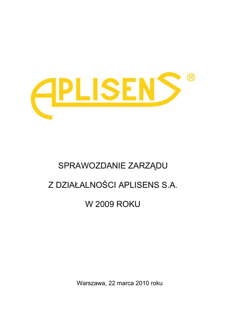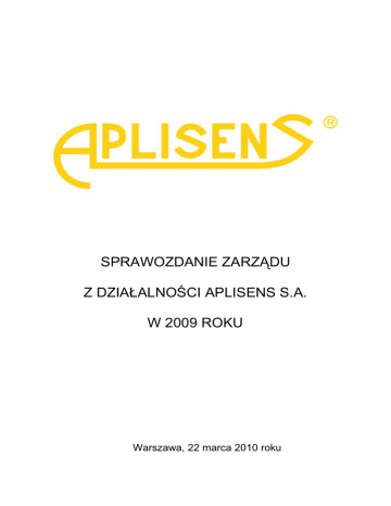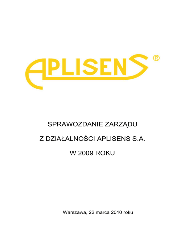 SPRAWOZDANIE ZARZĄDU Z DZIAŁALNOŚCI APLISENS S.A. W 2009 ROKU Warszawa, 22 marca 2010 roku Sprawozdanie Zarządu z działalności APLISENS S.A. w 2009 r. SPIS TREŚCI PODSTAWOWE INFORMACJE O SPÓŁCE ............................................................. 4 1.1 NAZWA I SIEDZIBA ................................................................................................. 4 1.2 FORMA PRAWNA ..................................................................................................... 4 1.3 SKŁAD ZARZĄDU I RADY NADZORCZEJ .......................................................... 4 1.4 AKCJONARIAT SPÓŁKI .......................................................................................... 5 1.5 PRZEDMIOT DZIAŁALNOŚCI SPÓŁKI ................................................................. 6 2 ZASADY SPORZĄDZANIA ROCZNEGO SPRAWOZDANIA SPÓŁKI ................ 6 3 INFORMACJE O SYTUACJI EKONOMICZNO-FINANSOWEJ SPÓŁKI ORAZ CZYNNIKACH I ZDARZENIACH MAJĄCYCH ZNACZĄCY WPŁYW NA OSIĄGNIĘTE WYNIKI I DZIAŁALNOŚĆ SPÓŁKI......................................................... 7 3.1. OMÓWIENIE WYNIKÓW FINANSOWYCH ............................................................. 7 1. 3.1.1. RACHUNEK ZYSKÓW I STRAT APLISENS S.A. .......................................................... 7 3.1.2. BILANS APLISENS S.A. .................................................................................................... 9 3.1.3. PRZEPŁYWY ŚRODKÓW PIENIĘŻNYCH .................................................................... 11 3.2 WYBRANE WSKAŹNIKI FINANSOWE APLISENS S.A. ........................................ 11 3.2.1 DEFINICJE WSKAŹNIKÓW FINANSOWYCH ........................................................ 12 3.3 OBJAŚNIENIE RÓŻNIC POMIĘDZY WYNIKAMI FINANSOWYMI WYKAZANYMI W RAPORCIE ROCZNYM A WCZEŚNIEJ OPUBLIKOWANYMI PROGNOZAMI WYNIKÓW NA DANY ROK ................................................................. 13 3.4 OCENĘ DOTYCZĄCĄ ZARZĄDZANIA ZASOBAMI FINANSOWYMI ORAZ MOŻLIWOŚCI REALIZACJI ZAMIERZEŃ INWESTYCYJNYCH ............................... 13 3.5 SPOSÓB WYKORZYSTANIA WPŁYWÓW Z EMISJI ............................................. 13 3.6 PODSTAWOWE INFORMACJE O RYNKACH ZBYTU, PODSTAWOWYCH PRODUKTACH, TOWARACH I STRUKTURZE SPRZEDAŻY ORAZ O ŹRÓDŁACH ZAOPATRZENIA W MATERIAŁY DO PRODUKCJI, TOWARY I USŁUGI ............... 14 3.6.1 STRUKTURA PRODUKTOWA SPRZEDAŻY ............................................................... 14 3.6.2 STRUKTURA GEOGRAFICZNA SPRZEDAŻY ............................................................. 15 3.6.3 ŹRÓDŁA ZAOPATRZENIA W MATERIAŁY DO PRODUKCJI I USŁUGI ................. 17 3.6.4 SEZONOWOŚĆ SPRZEDAŻY .......................................................................................... 17 ISTOTNE CZYNNIKI RYZYKA I ZAGROŻEŃ ..................................................... 18 PERSPEKTYWY ROZWOJU ..................................................................................... 19 1. Czynniki i perspektywy rozwoju................................................................................... 19 6 POWIĄZANIA ORGANIZACYJNE I KAPITAŁOWE SPÓŁKI ........................... 21 7 INWESTYCJE SPÓŁKI W 2009 ROKU .................................................................... 23 8 POZOSTAŁE INFORMACJE ..................................................................................... 24 8.1 POSTĘPOWANIA TOCZĄCE SIĘ PRZED SĄDEM LUB ORGANEM ADMINISTRACJI PUBLICZNEJ ....................................................................................... 24 8.2. UMOWY ZNACZĄCE DLA DZIAŁALNOŚCI APLISENS S.A. ............................. 24 8.3. KREDYTY, POŻYCZKI, PORĘCZENIA I GWARANCJE ....................................... 24 8.4 INFORMACJE O ISTOTNYCH TRANSAKCJACH ZAWARTYCH Z PODMIOTAMI POWIĄZANYMI NA INNYCH WARUNKACH NIŻ RYNKOWE ...... 25 8.5 OCENA CZYNNIKÓW I NIETYPOWYCH ZDARZEŃ MAJĄCYCH WPŁYW NA WYNIK Z DZIAŁALNOŚCI ZA ROK OBROTOWY 2009 ....................................... 25 8.6 UMOWY ZAWARTE MIĘDZY EMITENTEM A OSOBAMI ZARZĄDZAJĄCYMI, PRZEWIDUJĄCE REKOMPENSATĘ W PRZYPADKU ICH REZYGNACJI LUB ZWOLNIENIA Z ZAJMOWANEGO STANOWISKA ................... 25 8.7 INFORMACJA O WYNAGRODZENIU OSÓB ZARZĄDZAJĄCYCH I NADZORUJĄCYCH ........................................................................................................... 26 4 5 2 Sprawozdanie Zarządu z działalności APLISENS S.A. w 2009 r. 8.8 PROGRAM MOTYWACYJNY .................................................................................... 26 8.9 INFORMACJA O LICZBIE I WARTOŚCI NOMINALNEJ WSZYSTKICH AKCJI (UDZIAŁÓW) EMITENTA ORAZ AKCJI I UDZIAŁÓW W JEDNOSTKACH POWIĄZANYCH EMITENTA, BĘDĄCYCH W POSIADANIU OSÓB ZARZĄDZAJĄCYCH I NADZORUJĄCYCH EMITENTA ............................................. 28 8.10 INFORMACJA O ZNANYCH EMITENTOWI UMOWACH, W WYNIKU KTÓRYCH MOGĄ W PRZYSZŁOŚCI NASTĄPIĆ ZMIANY W PROPORCJACH POSIADANYCH AKCJI PRZEZ DOTYCHCZASOWYCH AKCJONARIUSZY ....... 28 8.11 INFORMACJE O PODMIOCIE UPRAWNIONYM DO BADANIA SPRAWOZDAŃ FINANSOWYCH.................................................................................... 28 9.OŚWIADCZENIE O STOSOWANIU ZASAD ŁADU KORPORACYJNEGO .......... 29 9.1 WSKAZANIE ZBIORU ZASAD ŁADU KORPORACYJNEGO, KTÓREMU PODLEGA EMITENT ORAZ TYCH, NA KTÓRE EMITENT MÓGŁ SIĘ ZDECYDOWAĆ DOBROWOLNIE, ORAZ MIEJSCA, GDZIE TEKST ZBIORU ZASAD JEST PUBLICZNIE DOSTĘPNY. ................................................................................................................................ 29 9.2 Wskazanie w jakim zakresie emitent odstąpił od postanowień Dobrych Praktyk oraz wyjaśnienie przyczyn odstąpienia ................................................................................................ 29 9.3 System kontroli wewnętrznej i zarządzania ryzykiem w odniesieniu do procesu sporządzania sprawozdań finansowy