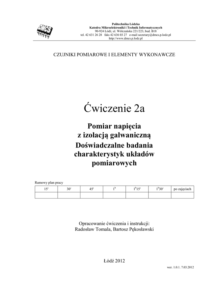 Politechnika Łódzka Katedra Mikroelektroniki i Technik Informatycznych 90-924 Łódź, ul. Wólczańska 221/223, bud. B18 tel. 42 631 26 28 faks 42 636 03 27 e-mail [email protected] http://www.dmcs.p.lodz.pl CZUJNIKI POMIAROWE I ELEMENTY WYKONAWCZE Ćwiczenie 2a Pomiar napięcia z izolacją galwaniczną Doświadczalne badania charakterystyk układów pomiarowych Ramowy plan pracy 15′ 30′ 45′ 1h 1h15′ 1h30′ po zajęciach Opracowanie ćwiczenia i instrukcji: Radosław Tomala, Bartosz Pękosławski Łódź 2012 wer. 1.0.1. 7.03.2012 Spis treści B Wprowadzenie do ćwiczenia..............................................................................................................5 1. Cel i przebieg ćwiczenia....................................................................................................................5 2. Podstawy teoretyczne ........................................................................................................................7 2.1. Wprowadzenie .........................................................................................................................7 2.2. Układy pomiarowe...................................................................................................................7 2.2.a. Układy pomiarowe z izolacją galwaniczną ............................................................7 2.2.b. Transoptory ............................................................................................................8 C Doświadczenie...................................................................................................................................10 3. Pomiary............................................................................................................................................10 3.1. Układ pomiarowy ..................................................................................................................10 3.2. Wykonanie pomiarów............................................................................................................12 D Wyniki ...............................................................................................................................................13 4. Opracowanie i analiza wyników......................................................................................................13 E Informacje.........................................................................................................................................15 5. Literatura .........................................................................................................................................15 © 2012, Katedra Mikroelektroniki i Technik Informatycznych Politechniki Łódzkiej B Wprowadzenie do ćwiczenia 1. Cel i przebieg ćwiczenia Celem ćwiczenia jest poznanie zasady działania układów do pomiarów napięcia z transoptorową izolacją galwaniczną oraz zbadanie charakterystyk statycznych tych układów. W ćwiczeniu poruszone zostanie również zagadnienie granicznej częstotliwości pracy . © 2012, Katedra Mikroelektroniki i Technik Informatycznych Politechniki Łódzkiej 2. Podstawy teoretyczne 2.1. Wprowadzenie Czujniki pomiarowe umieszczone w obwodzie energetycznym (wysokonapięciowym) nie mogą być połączone bezpośrednio z obwodami sterowania i regulacji zasilanymi niskim napięciem. Z tego powodu podstawowym wymaganiem stawianym układom pomiaru prądów i napięć jest zapewnienie galwanicznej separacji sygnałów wejściowych od wyjściowych. 2.2. Układy pomiarowe 2.2.a. Układy pomiarowe z izolacją galwaniczną Wymagania, jakie powinny spełniać układy pomiaru prądów i napięć to: • wytworzenie sygnału napięciowego proporcjonalnego do wartości rzeczywistych prądu lub napięcia w obwodzie energetycznym, • galwaniczne oddzielenie wejścia i wyjścia, • duża liniowość charakterystyk statycznych, • mała inercyjność, • dopasowanie sygnałów wejściowych i wyjściowych, • możliwie wierne odtworzenie kształtu przebiegów mierzonych przy zmianach częstotliwości (w przypadku falowników lub przemienników częstotliwości), • duża stabilność czasowa i temperaturowa. Wymagania te mogą być spełnione w różnorodnych rozwiązaniach układowych, które można podzielić ze względu na zastosowane elementy separujące. Do najczęściej stosowanych elementów, zapewniających żądaną izolację galwaniczną, należą transformatory napięciowe i prądowe oraz transoptory, co zostało schematycznie przedstawione na Rys. 1. © 2012, Katedra Mikroelektroniki i Technik Informatycznych Politechniki Łódzkiej Rys. 1. Blokowy schemat funkcjonalny układu pomiarowego z izolacją galwaniczną [1] 2.2.b. Transoptory Transoptor jest elementem, w którym przez umieszczenie we wspólnej obudowie półprzewodnikowego źródła oraz detektora promieniowania świetlnego uzyskuje się połączenie sygnału wejściowego z wyjściowym za pomocą sprzężenia optycznego, a więc w warunkach separacji galwanicznej. Na Rys. 2 przedstawiono najczęściej spotykane elementy optoelektroniczne przeznaczone do przetwarzania sygnałów elektrycznych. Jako sterowane prądowo źródła światła stosowane są diody elektroluminescencyjne, natomiast jako detektory promieniowania używa się fototranzystorów, fotodiod i fotorezystorów. Produkowane transoptory mają rezystancję izolacji rzędu teraomów, wytrzymałość napięciową wejście-wyjście – kilkudziesięciu kilowoltów oraz doskonałe parametry dynamiczne, co czyni je atrakcyjnym elementem sprzęgającym obwody oddzielone galwanicznie. © Katedra Mikroelektroniki i Technik Informatycznych Politechniki Łódzkiej Rys. 2. Elementy optoelektroniczne służące do przetwarzania sygnałów elektrycznych, w których detektor promieniowania świetlnego stanowi: a) fotorezystor, b) fotodioda, c) fototranzystor, d) fototranzystor w układzie Darlingtona [1] Jednym z