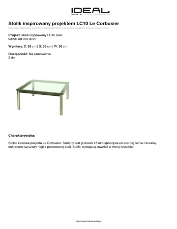 Stolik inspirowany projektem LC10 Le Corbusier http://www.idealmeble.pl/pl/offer/meble/stoliki/stolik-inspirowany-projektem-lc10-le-corbusier.html/ Projekt: stolik inspirowany LC10 niski Cena: od 999.00 zł Wymiary: D: 68 cm | S: 68 cm | W: 36 cm Dostępność: Na zamówienie 2 dni Charakterystyka: Stoliki kawowe projektu Le Corbusier. Szklany blat grubości 15 mm spoczywa na czarnej ramie. Do ramy dokręcone są cztery nogi z polerowanej stali. Stoliki występują również w wersji wysokiej. http://www.idealmeble.pl Dostępne wersje produktu: nazwa produktu Stolik inspirowany projektem LC10 Le Corbusier Stolik inspirowany projektem LC10 warianty cena 999.00zł dostępne Na zamówienie Produkt polski 1600.00zł Na zamówienie http://www.idealmeble.pl Zdjęcia produktu: http://www.idealmeble.pl Powered by TCPDF (www.tcpdf.org)