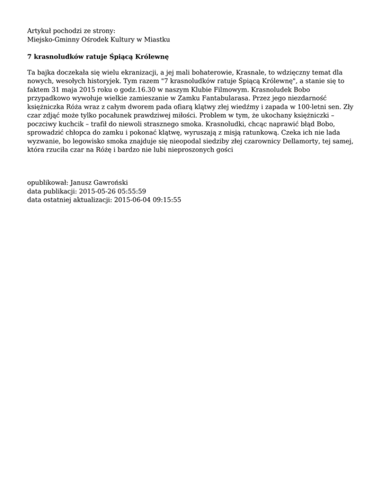 Artykuł pochodzi ze strony: Miejsko-Gminny Ośrodek Kultury w Miastku 7 krasnoludków ratuje Śpiącą Królewnę Ta bajka doczekała się wielu ekranizacji, a jej mali bohaterowie, Krasnale, to wdzięczny temat dla nowych, wesołych historyjek. Tym razem "7 krasnoludków ratuje Śpiącą Królewnę", a stanie się to faktem 31 maja 2015 roku o godz.16.30 w naszym Klubie Filmowym. Krasnoludek Bobo przypadkowo wywołuje wielkie zamieszanie w Zamku Fantabularasa. Przez jego niezdarność księżniczka Róża wraz z całym dworem pada ofiarą klątwy złej wiedźmy i zapada w 100-letni sen. Zły czar zdjąć może tylko pocałunek prawdziwej miłości. Problem w tym, że ukochany księżniczki – poczciwy kuchcik – trafił do niewoli strasznego smoka. Krasnoludki, chcąc naprawić błąd Bobo, sprowadzić chłopca do zamku i pokonać klątwę, wyruszają z misją ratunkową. Czeka ich nie lada wyzwanie, bo legowisko smoka znajduje się nieopodal siedziby złej czarownicy Dellamorty, tej samej, która rzuciła czar na Różę i bardzo nie lubi nieproszonych gości opublikował: Janusz Gawroński data publikacji: 2015-05-26 05:55:59 data ostatniej aktualizacji: 2015-06-04 09:15:55