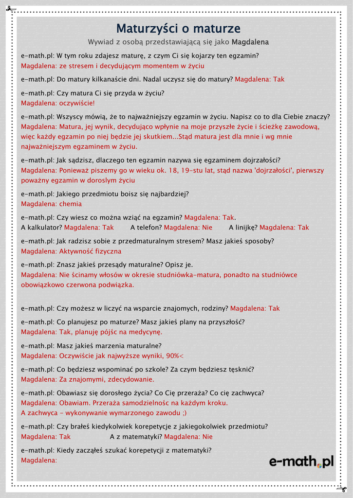 Maturzyści o maturze Wywiad z osobą przedstawiającą się jako Magdalena e-math.pl: W tym roku zdajesz maturę, z czym Ci się kojarzy ten egzamin? Magdalena: ze stresem i decydującym momentem w życiu e-math.pl: Do matury kilkanaście dni. Nadal uczysz się do matury? Magdalena: Tak e-math.pl: Czy matura Ci się przyda w życiu? Magdalena: oczywiście! e-math.pl: Wszyscy mówią, że to najważniejszy egzamin w życiu. Napisz co to dla Ciebie znaczy? Magdalena: Matura, jej wynik, decydująco wpłynie na moje przyszłe życie i ścieżkę zawodową, więc każdy egzamin po niej będzie jej skutkiem...Stąd matura jest dla mnie i wg mnie najważniejszym egzaminem w życiu. e-math.pl: Jak sądzisz, dlaczego ten egzamin nazywa się egzaminem dojrzałości? Magdalena: Ponieważ piszemy go w wieku ok. 18, 19-stu lat, stąd nazwa 'dojrzałości', pierwszy poważny egzamin w doroslym życiu e-math.pl: Jakiego przedmiotu boisz się najbardziej? Magdalena: chemia e-math.pl: Czy wiesz co można wziąć na egzamin? Magdalena: Tak. A kalkulator? Magdalena: Tak A telefon? Magdalena: Nie A linijkę? Magdalena: Tak e-math.pl: Jak radzisz sobie z przedmaturalnym stresem? Masz jakieś sposoby? Magdalena: Aktywność fizyczna e-math.pl: Znasz jakieś przesądy maturalne? Opisz je. Magdalena: Nie ścinamy włosów w okresie studniówka-matura, ponadto na studniówce obowiązkowo czerwona podwiązka. e-math.pl: Czy możesz w liczyć na wsparcie znajomych, rodziny? Magdalena: Tak e-math.pl: Co planujesz po maturze? Masz jakieś plany na przyszłość? Magdalena: Tak, planuję pójśc na medycynę. e-math.pl: Masz jakieś marzenia maturalne? Magdalena: Oczywiście jak najwyższe wyniki, 90%< e-math.pl: Co będziesz wspominać po szkole? Za czym będziesz tęsknić? Magdalena: Za znajomymi, zdecydowanie. e-math.pl: Obawiasz się dorosłego życia? Co Cię przeraża? Co cię zachwyca? Magdalena: Obawiam. Przeraża samodzielnośc na każdym kroku. A zachwyca - wykonywanie wymarzonego zawodu ;) e-math.pl: Czy brałeś kiedykolwiek korepetycje z jakiegokolwiek przedmiotu? Magdalena: Tak A z matematyki? Magdalena: Nie e-math.pl: Kiedy zacząłeś szukać korepetycji z matematyki? Magdalena: