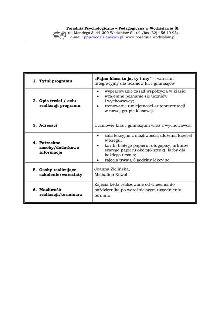 Poradnia Psychologiczno – Pedagogiczna w Wodzisławiu Śl. ul. Mendego 3, 44-300 Wodzisław Śl. tel./fax (32) 456 19 93; e-mail: [email protected] www.poradnia.wodzislaw.pl 1. Tytuł programu 2. Opis treści / celu realizacji programu 3. Adresaci „Fajna klasa to ja, ty i my” - warsztat integracyjny dla uczniów kl. I gimnazjów Uczniowie klas I gimnazjum wraz z wychowawcą. 4. Potrzebne zasoby/dodatkowe informacje wypracowanie zasad współżycia w klasie; wzajemne poznanie się uczniów i wychowawcy; trenowanie umiejętności autoprezentacji w nowej grupie klasowej. sala lekcyjna z możliwością ułożenia krzeseł w kręgu; kartki białego papieru, długopisy, arkusze szarego papieru około(6 sztuk), farby dla każdego ucznia; zajęcia trwają 3 godziny lekcyjne. 5. Osoby realizujące szkolenie/warsztaty Joanna Zielińska, Michalina Kowol 6. Możliwość realizacji/terminarz Zajęcia będą realizowane od września do października po wcześniejszym uzgodnieniu terminu.