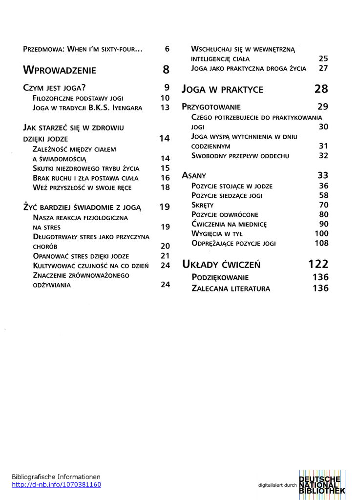 P r ze d m o w a : W hen i ' m sixty - four ... W prowadzenie 6 8 C zym jest joga ? 9 Filozoficzne 10 Joga podstawy jogi w tradycji B.K.S. Iyengara 13 WSCHŁUCHAJ SIĘ W WEWNĘTRZNĄ INTELIGENCJĘ CIAŁA 25 Joga 27 jako praktyczna droga życia Jo g a w praktyce Przygotowanie C zego Jak starzeć się w zdrowiu jogi DZIĘKI JODZE Joga Z ależność 14 m ięd zy ciałem A ŚWIADOMOŚCIĄ 14 S kutki 15 B rak W niezdrow ego trybu życia ruchu i zła postawa ciała eź przyszłość w swoje ręce Żyć bardziej św iadomie z jogą N asza 16 18 19 19 na stres D ługotrwały 20 O panować stres dzięki jodze Kultywować Z naczenie czujność na co dzień CODZIENNYM 31 Sw o b o d n y 32 przepływ oddechu A sany Pozycje Pozycje 33 stojące w jodze siedzące jogi Skręty 36 58 70 odw rócone Ćw ic ze n ia na m iednicę w tył O dprężające pozycje jogi 80 90 100 108 21 24 zr ów no w ażonego o d ży w ia n ia 30 wyspą w ytch n ien ia w dniu W ygięcia stres jako przyczyna chorób 29 potrzebujecie do praktykowania Pozycje reakcja fizjologiczna 28 24 U kłady ćwiczeń Podziękowanie Z alecana literatura 122 136 136