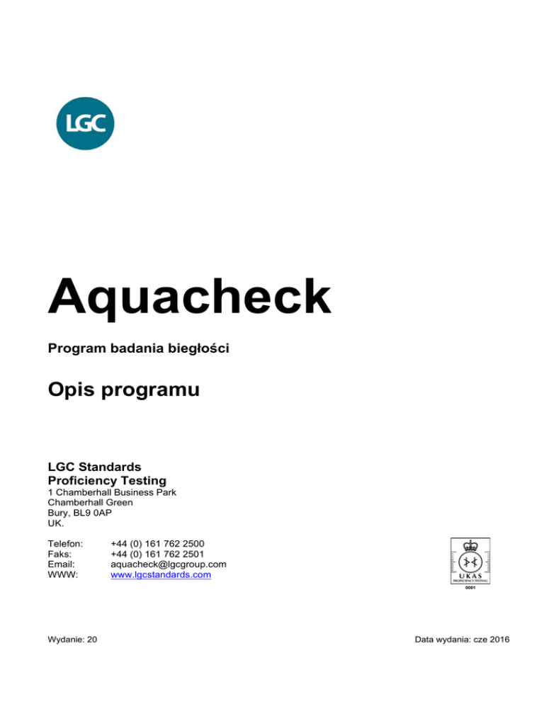 Aquacheck Program badania biegłości Opis programu LGC Standards Proficiency Testing 1 Chamberhall Business Park Chamberhall Green Bury, BL9 0AP UK. Telefon: Faks: Email: WWW: Wydanie: 20 +44 (0) 161 762 2500 +44 (0) 161 762 2501 [email protected] www.lgcstandards.com Data wydania: cze 2016 Opis programu Aquacheck Protokół statusu wydania oraz wprowadzonych zmian WYDANIE DATA WYDANIA 12 sty 2013 13 lut 2013 14 lis 2013 15 lut 2014 16 sty 2015 Wydanie: 20 ZATWIERDZONY PRZEZ SZCZEGÓŁY Włączenie próbek dla siarczków i chlorofilu a do głównego programu. Włączenie przewodności właściwej do 2H i 2S, mętności do 11 i stopnia zasolenia do 17A. Usunięcie niektórych analitów z Próbki 50 i zmiana pochodzenia wartości przypisanej. Zmiana 3C z ‘chloru związanego’ na ‘chlor ogólny’. W oparciu o dane z poprzednich rund uaktualniono stężenia informacyjne. Zmiany SDPA. Dodanie nowych analitów do próbek 7A, 9, 19A, 21 i próbki próbnej D z Ramowej Dyrektywy Wodnej. Zmiany w próbkach dla herbicydów: 8, 8B i 20 i włączenie nowej próbki 20B. Włączenie do próbek próbnych próbek dla smaku i zapachu, osadu, geosminy oraz izoborneolu metylu i fungicydów. Zmiana zakresów dla próbki próbnej dla substancji farmaceutycznych/EDTA. Zmiana materiałów dostarczanych w Próbce 3, dodana informacja o temperaturze do przewodności, dodane dalsze wyjaśnienie do rozpuszczalnego reaktywnego fosforu, uaktualniono format próbki 11. Dodanie indeksu fenolowego do 6B i 18B oraz arsenu do metali w wysoko zasolonej wodzie próbce próbnej. Poprawiono zakresy stężeń i SDPA dla 20B. Poprawiono jednostki dla arsenu w próbce próbnej Metale w wysoko zasolonej wodzie. Zidentyfikowano parametry, które nie są objęte zakresem akredytacji. Dodatkowe informacje dla zachowania spójności wartości przypisanej. Włączenie próbek: uran i pluton, resztkowy brom i związki organiczne absorbujące UV (254 nm) do próbek próbnych programu Aquacheck. Dodanie kilku fenoli do 6B i 18B. Usunięcie indeksu fenolowego z 6B i 18B. Włączone surfaktanty niejonowe do próbki 3, wysoki poziom chloranów i chlorynów do próbki 3A, dodatkowe metale do próbki 12. Usunięcie ustalonej wartości SDPA dla próbki 18A, aktualizacja ustalonej wartości dla 13, 14, 19A, 19B i 19C. Zaktualizowane maksymalne stężenie dla całkowitej sumy metylofenoli w próbkach 6B i 18B. Zaktualizowane ustalone SDPA w celu odzwierciedlenia większego zakresu. Usunięte ‘180oC’ z parametru ‘Całkowita zawartość substancji rozpuszczonych’. Włączone surfaktanty niejonowe do próbki 11. Włączenie próbek z Ramowej Dyrektywy Wodnej do głównego programu. Zmieniono nazwę próbki z Metale w wysoko zasolonej wodzie na Kationy i aniony w wysoko zasolonej wodzie oraz dodano nowe parametry do próbki. Diklofenak dodany do farmaceutycznej próbki próbnej. Dodanie nowych próbek próbnych: BZT/ChZT w wysokim stężeniu, kwas halooctowy, pyretroidowe syntetyczne środki owadobójcze, Strona 2 z 48 M. Whetton M. Whetton M. Whetton M. Whetton M. Whetton Data wydania: cze 2016 Opis programu Aquacheck WYDANIE 17 DATA WYDANIA paź 2015 18 sty 2016 19 kwi 2016 20 cze 2016 ZATWIERDZONY PRZEZ SZCZEGÓŁY woda przemysłowa, mikrocystyna-LR i nadchloran. Włączenie informacji dotyczącej podwykonawstwa w punkcie "Materiały do badań". Kaptan dodany do próbki próbnej Fungicydy. Zaktualizowane informacje dla nieakredytowanych próbek. Usunięta informacja o papierowych wersjach raportów. 1,2,4-trójmetylobenzen i MTBE dodane do próbki 6C. Włączenie próbek: związki chelatujące, nawozy nieorganiczne i organiczne, niski poziom zanieczyszczeń CIP2 do próbek próbnych Aquacheck. Woda przemysłowa podzielona na dwie grupy: kwas siarkowy/kwas winowy oraz chlorki. Usunięcie EDTA z próbki próbnej substancje farmaceutyczne. Dodanie niewielkich zmian tekstowych. Próbka 7a i 19A podzielona na 2 roztwory wzbogacające. Wprowadzenie niewielkich zmian tekstowych w opisie próbki 34D, zmiana formatu próbki 35 (2x30ml) oraz 38 (1x60ml) R. Sharma N. Mason R. Sharma R. Sharma R. Sharma Uwagi: Jeżeli niniejszy dokument został przetłumaczony, wersją wiążącą jest wersja w języku angielskim. Wydanie: 20 Strona 3 z 48 Data wydania: cze 2016 Opis programu Aquacheck Cele programu i organizacja Głównym celem programu badania biegłości Aquacheck jest umożliwienie laboratoriom wykonującym analizy organicznych i nieorganicznych związków chemicznych w wodach czystych i ściekach, osadach ściekowych i glebach monitorowania ich sprawności oraz porównania jej z wynikami podobnych laboratoriów. Celem Aquacheck jest także dostarczenie uczestnikom informacji związanych z problemami technicznymi oraz metodykami odnoszącymi się do badania takich próbek. Rok programu Aquacheck trwa od kwietnia do marca. Dalsze informacje, w tym informacja o dostępności materiałów do badań, datach dystrybucji oraz terminach raportowania, dostępne są w aktualnie obowiązującym formularzu zgłoszeniowym programu Aquacheck. W ramach programu Aquacheck działa grupa doradców złożona z uczestników, ekspertów oraz organizacji nadzorujących. Lista członków grupy doradczej dostępna jest w LGC Standards na życzenie. Grupa doradców spotyka się dwa razy do roku i zajmuje się wszelkimi aspektami związanymi z rozwojem programu, organizacją i wynikami uczestników. Materiały do badań Szczegóły dotyczące dostępnych w Aquacheck materiałów do badań znajdują się w Załączniku A. Zakres badanych parametrów jest na bieżąco przeglądany w celu zapewnienia, że spełnia on bieżące wymagania laboratoriów oraz obowiązujących przepisów. Partie materiałów do badań są poddawane testom na jednorodność dla przynajmniej jednego parametru, jeżeli jest to właściwe. Szczegóły dotyczące przeprowadzonych testów na jednorodność i ich wyniki podane są w raportach z programu Aquacheck. Niektóre aspekty programu, tak