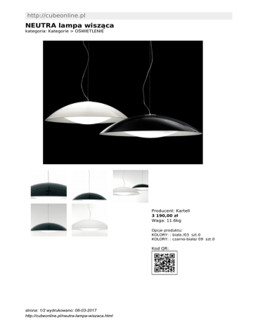 http://cubeonline.pl NEUTRA lampa wisząca kategoria: Kategorie > OŚWIETLENIE Producent: Kartell 3 190,00 zł Waga: 11.6kg Opcje produktu: KOLORY: : biała /03 szt.0 KOLORY: : czarno-biała/ 09 szt.0 Kod QR: strona: 1/2 wydrukowano: 08-03-2017 http://cubeonline.pl/neutra-lampa-wiszaca.html Minimalna, elegancka i surowa. Model NEUTRA to okrągła, wisząca lampa o dużych wymiarach, składająca się z dwóch elementów, przypominających łupinę. Szczególny kształt stelaża umozliwia jednorodne rozprzestrzenianie się światła po całej powierzchni, podczas gdy wygodny system regulacji ułatwia jej wypoziomowanie. Idealnie nadaje się na rynek hotelarsko-pracowniczy lub do dużych pomieszczeń. WYMIARY(CM): wysokość abażuru- 22 średnica abażuru- 90 długość min:max- 40-230 MATERIAŁ: tworzywo PMMA barwony w masie wenętrzny stelaż z polywęglanu INNE: 220-240 Volt FC540W+22W Inne produkty Kartell: http://www.cubeonline.pl/manufacturer/kartell Inne produkty projektanta: http://www.cubeonline.pl/designer/arad-ron 27.40.22.0 strona: 2/2 wydrukowano: 08-03-2017 http://cubeonline.pl/neutra-lampa-wiszaca.html