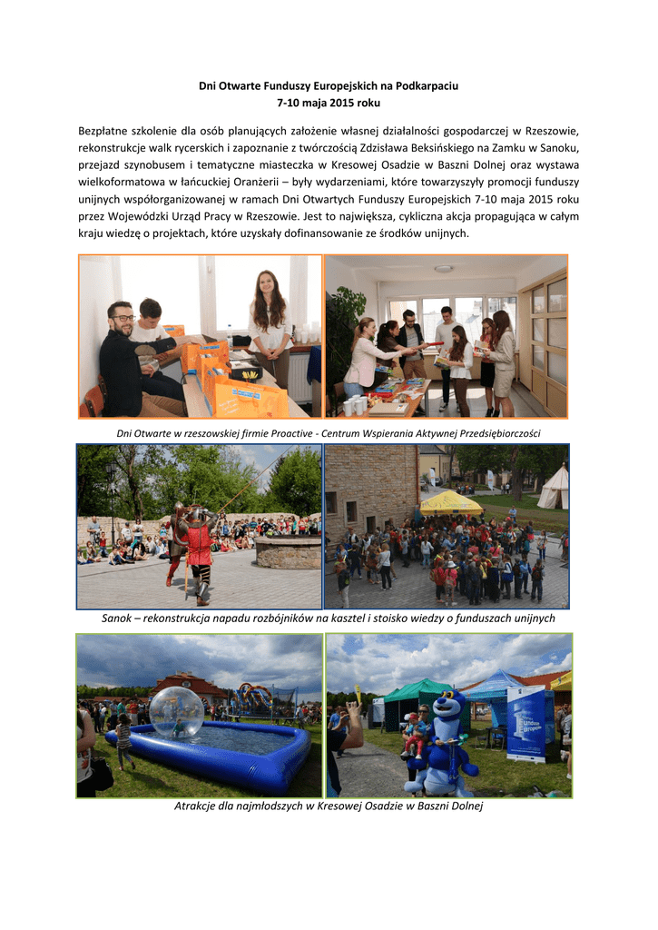 Dni Otwarte Funduszy Europejskich na Podkarpaciu 7-10 maja 2015 roku Bezpłatne szkolenie dla osób planujących założenie własnej działalności gospodarczej w Rzeszowie, rekonstrukcje walk rycerskich i zapoznanie z twórczością Zdzisława Beksińskiego na Zamku w Sanoku, przejazd szynobusem i tematyczne miasteczka w Kresowej Osadzie w Baszni Dolnej oraz wystawa wielkoformatowa w łańcuckiej Oranżerii – były wydarzeniami, które towarzyszyły promocji funduszy unijnych współorganizowanej w ramach Dni Otwartych Funduszy Europejskich 7-10 maja 2015 roku przez Wojewódzki Urząd Pracy w Rzeszowie. Jest to największa, cykliczna akcja propagująca w całym kraju wiedzę o projektach, które uzyskały dofinansowanie ze środków unijnych. Dni Otwarte w rzeszowskiej firmie Proactive - Centrum Wspierania Aktywnej Przedsiębiorczości Sanok – rekonstrukcja napadu rozbójników na kasztel i stoisko wiedzy o funduszach unijnych Atrakcje dla najmłodszych w Kresowej Osadzie w Baszni Dolnej Dni Otwarte Funduszy Europejskich na Zamku w Łańcucie Tegoroczna edycja przedsięwzięcia w województwie podkarpackim obfitowała w rozwój wiedzy pozwalającej u progu nowej perspektywy finansowej efektywnie wykorzystywać środki unijne oraz atrakcje turystyczno-kulturalne adresowane do całych rodzin w miejscach, do których zwiększenia walorów i oferty przyczyniły się dobrze wydatkowane fundusze europejskie. Organizatorzy każdego z wydarzeń zadbali o atrakcje, z których nie można skorzystać podczas standardowego funkcjonowania własnych placówek, co po raz kolejny przełożyło się na duże zainteresowanie zaproponowanymi formami spędzenia czasu wolnego w towarzystwie funduszy unijnych. Dni Otwarte Funduszy Europejskich przybliżyły mieszkańcom Podkarpacia wiedzę nie tylko na temat największych zrealizowanych projektów, ale również o takich, które zmieniły ich najbliższe otoczenie, stając się nieodłączną częścią codziennego życia regionu.